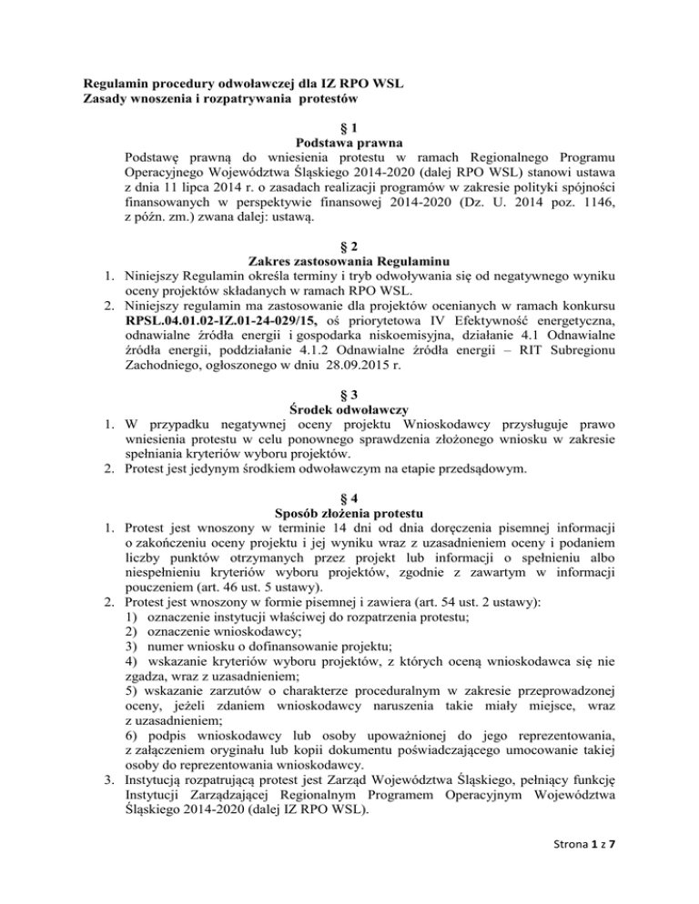 Regulamin procedury odwoławczej dla IZ RPO WSL Zasady wnoszenia i rozpatrywania protestów §1 Podstawa prawna Podstawę prawną do wniesienia protestu w ramach Regionalnego Programu Operacyjnego Województwa Śląskiego 2014-2020 (dalej RPO WSL) stanowi ustawa z dnia 11 lipca 2014 r. o zasadach realizacji programów w zakresie polityki spójności finansowanych w perspektywie finansowej 2014-2020 (Dz. U. 2014 poz. 1146, z późn. zm.) zwana dalej: ustawą. §2 Zakres zastosowania Regulaminu 1. Niniejszy Regulamin określa terminy i tryb odwoływania się od negatywnego wyniku oceny projektów składanych w ramach RPO WSL. 2. Niniejszy regulamin ma zastosowanie dla projektów ocenianych w ramach konkursu RPSL.04.01.02-IZ.01-24-029/15, oś priorytetowa IV Efektywność energetyczna, odnawialne źródła energii i gospodarka niskoemisyjna, działanie 4.1 Odnawialne źródła energii, poddziałanie 4.1.2 Odnawialne źródła energii – RIT Subregionu Zachodniego, ogłoszonego w dniu 28.09.2015 r. §3 Środek odwoławczy 1. W przypadku negatywnej oceny projektu Wnioskodawcy przysługuje prawo wniesienia protestu w celu ponownego sprawdzenia złożonego wniosku w zakresie spełniania kryteriów wyboru projektów. 2. Protest jest jedynym środkiem odwoławczym na etapie przedsądowym. §4 Sposób złożenia protestu 1. Protest jest wnoszony w terminie 14 dni od dnia doręczenia pisemnej informacji o zakończeniu oceny projektu i jej wyniku wraz z uzasadnieniem oceny i podaniem liczby punktów otrzymanych przez projekt lub informacji o spełnieniu albo niespełnieniu kryteriów wyboru projektów, zgodnie z zawartym w informacji pouczeniem (art. 46 ust. 5 ustawy). 2. Protest jest wnoszony w formie pisemnej i zawiera (art. 54 ust. 2 ustawy): 1) oznaczenie instytucji właściwej do rozpatrzenia protestu; 2) oznaczenie wnioskodawcy; 3) numer wniosku o dofinansowanie projektu; 4) wskazanie kryteriów wyboru projektów, z których oceną wnioskodawca się nie zgadza, wraz z uzasadnieniem; 5) wskazanie zarzutów o charakterze proceduralnym w zakresie przeprowadzonej oceny, jeżeli zdaniem wnioskodawcy naruszenia takie miały miejsce, wraz z uzasadnieniem; 6) podpis wnioskodawcy lub osoby upoważnionej do jego reprezentowania, z załączeniem oryginału lub kopii dokumentu poświadczającego umocowanie takiej osoby do reprezentowania wnioskodawcy. 3. Instytucją rozpatrującą protest jest Zarząd Województwa Śląskiego, pełniący funkcję Instytucji Zarządzającej Regionalnym Programem Operacyjnym Województwa Śląskiego 2014-2020 (dalej IZ RPO WSL). Strona 1 z 7 4. Rozpatrywaniem protestów w IZ RPO WSL zajmuje się Wydział Rozwoju Regionalnego, Referat procedury odwoławczej (dalej: WRR-RPR). 5. Protest wnoszony jest bezpośrednio do IZ RPO WSL, Wydział Rozwoju Regionalnego. 6. Protest wnoszony jest w formie pisemnej: a) osobiście w Kancelarii Ogólnej Urzędu Marszałkowskiego Województwa Śląskiego (pokój nr 164, parter), albo b) za pośrednictwem operatora pocztowego na adres: Urząd Marszałkowski Województwa Śląskiego Wydział Rozwoju Regionalnego ul. Ligonia 46, 40-037 Katowice albo c) elektronicznie – za pomocą platform elektronicznych e-Usług Publicznych FINN 8 SQL PeUP SEKAP/ePUAP 7. Protest składany elektroniczne należy podpisać za pomocą: a) kwalifikowanego certyfikatu, b) certyfikatu CC SEKAP, c) profilu zaufanego ePUAP 8. Protest nie może być złożony za pomocą faksu, e-maila. 9. Zgodnie z art. 78 § 1 Kodeksu cywilnego (dalej kc) do zachowania pisemnej formy czynności prawnej wystarcza złożenie własnoręcznego podpisu na dokumencie obejmującym treść oświadczenia woli. Pisma i dokumenty mogą być przekazywane także drogą elektroniczną, przy czym zgodnie z art. 78 § 2 kc oświadczenie woli złożone w postaci elektronicznej musi być opatrzone bezpiecznym podpisem elektronicznym weryfikowanym przy pomocy ważnego kwalifikowanego certyfikatu,. Dokument przesłany faksem stanowi jedynie kopię oryginału, w związku z czym nie będzie traktowany jako spełniający wymóg pisemności wniesionego środka odwoławczego. 10. Do obliczania terminów w ramach procedury odwoławczej stosuje się przepisy art. 57 ustawy z dnia 14 czerwca 1960 r. – Kodeks postępowania administracyjnego (tekst jednolity Dz.U. z 2013 poz. 267 z późn. zm., dalej: kpa), tj.: a) termin oznaczony w dniach kończy się z upływem ostatniego dnia, b) przy obliczaniu terminów podanych w dniach brane są pod uwagę dni kalendarzowe; c) jeżeli początkiem terminu oznaczonego w dniach jest pewne zdarzenie, przy obliczaniu terminu nie uwzględnia się dnia, w którym to zdarzenie nastąpiło, d) jeżeli koniec terminu do wykonania czynności przypada na dzień uznany ustawowo za wolny od pracy lub w sobotę, termin upływa następnego dnia następującego po dniu lub dniach wolnych od pracy, 11. Określone w Regulaminie terminy uznaje się za zachowane, jeżeli przed ich upływem pismo wpłynie do IZ RPO WSL lub zostanie nadane w polskiej placówce pocztowej operatora wyznaczonego w rozumieniu ustawy z dnia 23 listopada 2012 r. - Prawo pocztowe (Dz.U. z 2012 poz. 1529), tj. Poczta Polska S.A., zgodnie z art. 57 § 5 kpa. 12. Korespondencję dotyczącą protestu doręcza się na adres wnioskodawcy wskazany w złożonym proteście. O zmianie adresu wnioskodawca powinien powiadomić IZ RPO WSL, w terminie 7 dni od zmiany adresu, pod rygorem uznania, że Strona 2 z 7 korespondencja przekazana na jego dotychczasowy adres, została skutecznie doręczona. 13. Jeżeli pismo zostanie zwrócone z adnotacją „nie podjęto w terminie” lub równoznaczną, pismo uznaje się za doręczone zgodnie z art. 44 kpa. 14. W przypadku ustanowienia przez wnioskodawcę dwóch lub więcej pełnomocników pisma w toku postępowania odwoławczego doręcza się jednemu z nich. W sytuacji, w której Wnioskodawca wskazał, który z ustanowionych pełnomocników został przez niego ustanowiony do doręczeń,