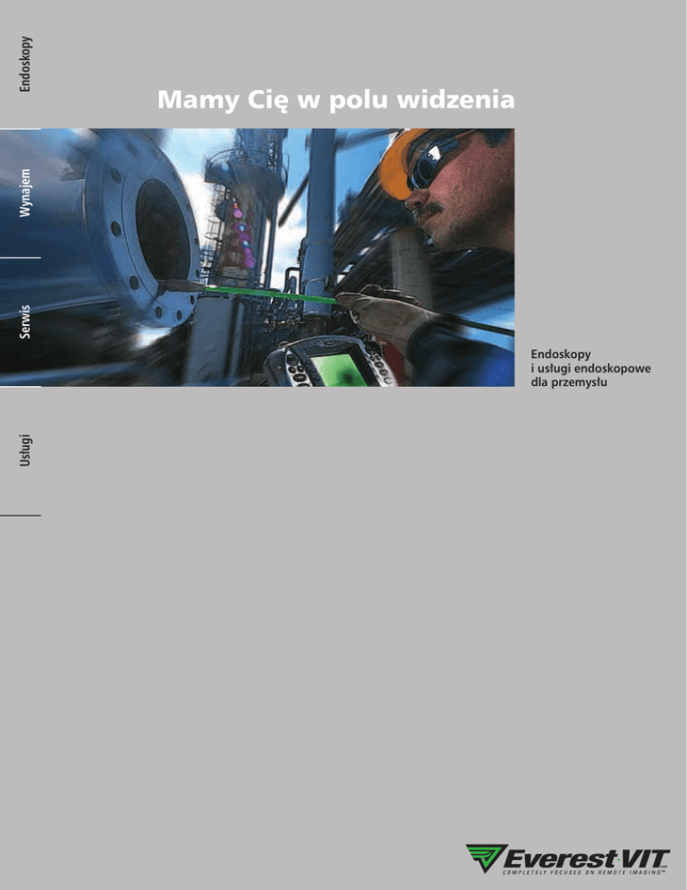 Endoskopy Serwis Wynajem Mamy Cię w polu widzenia Usługi Endoskopy i usługi endoskopowe dla przemysłu Narzędzia badawcze, których potrzebujesz... Fiberoskopy Aplikacja Boroskopy Strona 4 Strona 5 Strona 6 Strona 7 - Rurociągi o długości do 30 metrów i średnicach od 6,5 do 150 mm - Wieloelementowe wymienniki ciepła - Instalacje przemysłowe - Bloki turbin - Systemy sanitarne w budynkach - Badania miejsc niedostępnych - Zbiorniki i kotły - Wytwornice pary - Pojemniki i systemy spustowe - Systemy kominowe i wentylacyjne - Rurociągi - Silniki i skrzynie biegów - Turbiny - Odlewy - Kontrola jakości - Odlewy - Silniki lotnicze i diesla - Turbiny - Zbiorniki paliwa - Monitoring / zapewnienie bezpieczeństwa - Kontrola i zapewnienie jakości - Silniki lotnicze i diesla - Turbiny gazowe - Produkcja - Odlewy - Badania w wysokich temperaturach - Monitoring / zapewnienie bezpieczeństwa Do naszych obecnych i potencjalnych Klientów: Jeżeli kiedykolwiek brak dostępu, niebezpieczne środowisko lub inne ograniczenia uniemożliwiają dokonanie bezpośrednich badań, Everest VIT przynosi Państwu rozwiązanie, dostarczając od ponad 20 lat endoskopy i systemy kamer zapewniające krystalicznie czysty obraz i wiarygodne informacje jako podstawę trafnej oceny stanu badanych urządzeń. Nasze systemy, skonstruowane przez profesjonalistów praktyków, pozwalają na przeprowadzenie inspekcji maszyn, urządzeń, podzespołów i infrastruktury w najszybszy i najefektywniejszy ekonomicznie sposób. Nasz wszechstronny serwis jest do Państwa dyspozycji 24 godziny, 7 dni w tygodniu. Pozwólcie naszym specjalistom wykonać Wasze rutynowe czy awaryjne badania szybko i profesjonalnie – lub wynajmijcie potrzebny do tego sprzęt. Oferujemy szybką dostawę wypożyczonego sprzętu na terenie wszystkich krajów zjednoczonej Europy. Jesteśmy gotowi oddać do Państwa dyspozycji nasze doświadczenie w zakresie badań wizualnych – dlaczego nie mielibyście z tego skorzystać jeszcze dzisiaj? Thomas Weinberger CEO Everest VIT GmbH [email protected] ... i pełne wsparcie serwisowe PTZ MicroViper Wynajem i Usługi Strona 8 Strona 9 Strona 10 Strona 11 - Zbiorniki i kotły - Rurociągi i instalacje wielkogabarytowe - Systemy ściekowe i burzowe - Szyby kanalizacyjne - Kominy - Konstrukcje stalowe i żelbetowe - Prace poszukiwawcze i kontrolne - Zapewnienie bezpieczeństwa - Akcje ratowniczo-poszukiwawcze - Zbiorniki i kotły - Pojemniki ciśnieniowe - Inspekcje podwodne - Systemy i rury spustowe - Instalacje i rurociągi wielkogabarytowe - Monitorowanie pracujących instalacji przemysłowych - Monitorowanie stref niebezpiecznych - Badania materiałowe - Badania powierzchni - Kontrola jakości - Kontrola procesów w przemyśle „on line” - Kryminalistyka - Mikrobiologia - Archeologia, etc. - Rutynowe badania sezonowe - Kontrole awaryjne - Akcje ratownicze - Wynajem sprzętu i szkolenia Mamy Cię w polu widzenia Dodatkowe informacje o naszych produktach? Proszę wypełnić i przesłać do nas formularz umieszczony na tylnej okładce. Unikalny endoskop dalekiego zasięgu z ruchomą końcówką Przykłady zastosowań • Rurociągi o długości do 30 metrów i średnicach od 6,5 do 150 mm • Wieloelementowe wymienniki ciepła • Instalacje przesyłowe • Bloki turbin • Systemy sanitarne w budynkach The LongSteer® jest jedynym na rynku endoskopem wyposażonym w unikalny system sterowania końcówką, zapewniającym sprawną jej manipulację, nawet przy 30-metrowej sondzie. Precyzyjne ułożenie końcówki sondy uzyskuje się za pomocą manipulatora (joysticka). Nawinięty na oddzielnej szpuli endoskop pozwala rozwinąć dokładnie tyle, ile jest niezbędne do wykonania inspekcji. Cały system umieszczony jest w zwartej, przenośnej walizce, zapewniając mobilność i bezproblemowy transport. Wymienne obiektywy, jednostka sterująca z możliwością zapisu obrazów, monitor i szeroki zakres dodatkowych akcesoriów czynią z LongSteer® wszechstronne narzędzie badawcze. Dostępne Modele • LS o średnicy 6 mm długość od 12 m do 18 m • LS o średnicy 10 mm długość od 12 m do 30 m Parametry • Średnica sondy: 6,1 oraz 10 mm długość: 12,2 / 18,3 m / 30,5 m • Sterowanie końcówką: L 6 mm: lewo / prawo 100° / 10 mm: we wszystkich kierunkach 140° • Promień zagięcia sondy: 6 mm: 3,8 cm / 10 mm: 7,6 cm • Ciężar systemu w walizce ok. 20 kg bez walizki 11,5 kg • Wyjście wideo: S-VHS, PAL kompozyt 4 Rura w kotle Termoelement w kanale chłodzącym Wtryskiwacz parownika Mały krokodylek Duży krokodylek Haczyk Chwytak 3-elementowy Przymiar Sonda 7,3 mm: Wewnętrzny kanał roboczy i uniwersalne narzędzia Wszechstronny endoskop ogólnego stosowania NOWA Najmniejsza na świecie średnica sondy. Teraz z pomiarem STEREO Dostępne modele • XL PROTM Podstawowy (Base): z cyfrowymi funkcjami obrazu • XL PROTM Cyfrowy (Digital) z cyfrowym systemem pamięci i cyfrowymi funkcjami obrazu • XL PROTM Zaawansowany (Advanced) z cyfrowym systemem pamięci i rozszerzonymi funkcjami obrazu • XL PROTM Pomiarowy (Measurement) z cyfrowym systemem pamięci, pełnymi funkcjami obrazu i pomiaru • XL PROTM C 7,3 mm: z wewnętrznym kanałem roboczym i szeroką gamą narzędzi Parametry Wideoendoskopy XL PROTM zapewniają wszystko co potrzebne do przeprowadzenia szybkich i łatwych inspekcji turbin, rurociągów i innych systemów przemysłowych. Wystarczy włączyć zasilanie, aby rozpocząć inspekcję. Tytanowa, odporna na uszkodzenia głowica sondy chroni kolorową kamerę wysokiej rozdzielczości z elementem CCD 440.000 pikseli. Chroniona patentem, niezwykle intensywna żarówka metalohalogenkowa zastosowana w źródle światła zapewnia dokładne badania w prawie każdych warunkach. Wygodny i ergonomiczny uchwyt z wbudowanym wyświetlaczem LCD oraz inteligentnym manipulatorem zapewnia precyzyjne sterowanie sondą i zarządzanie całym systemem. Wykryte wady i uszkodzenia mogą być precyzyjnie z