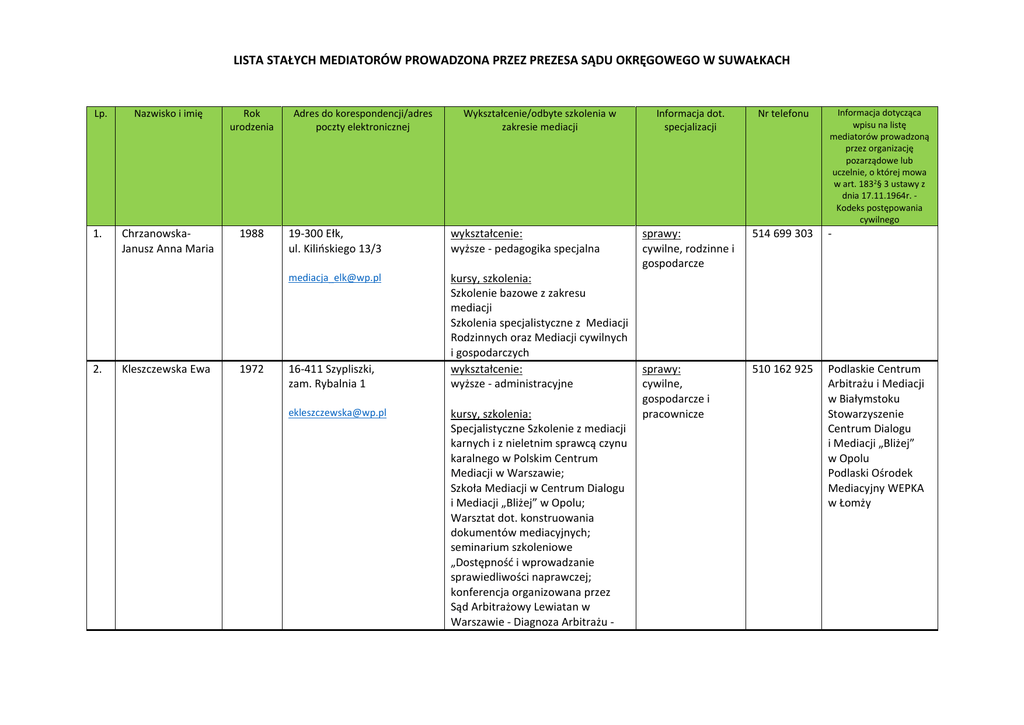 Lista stałych mediatorów prowadzona przez Prezesa Sądu
