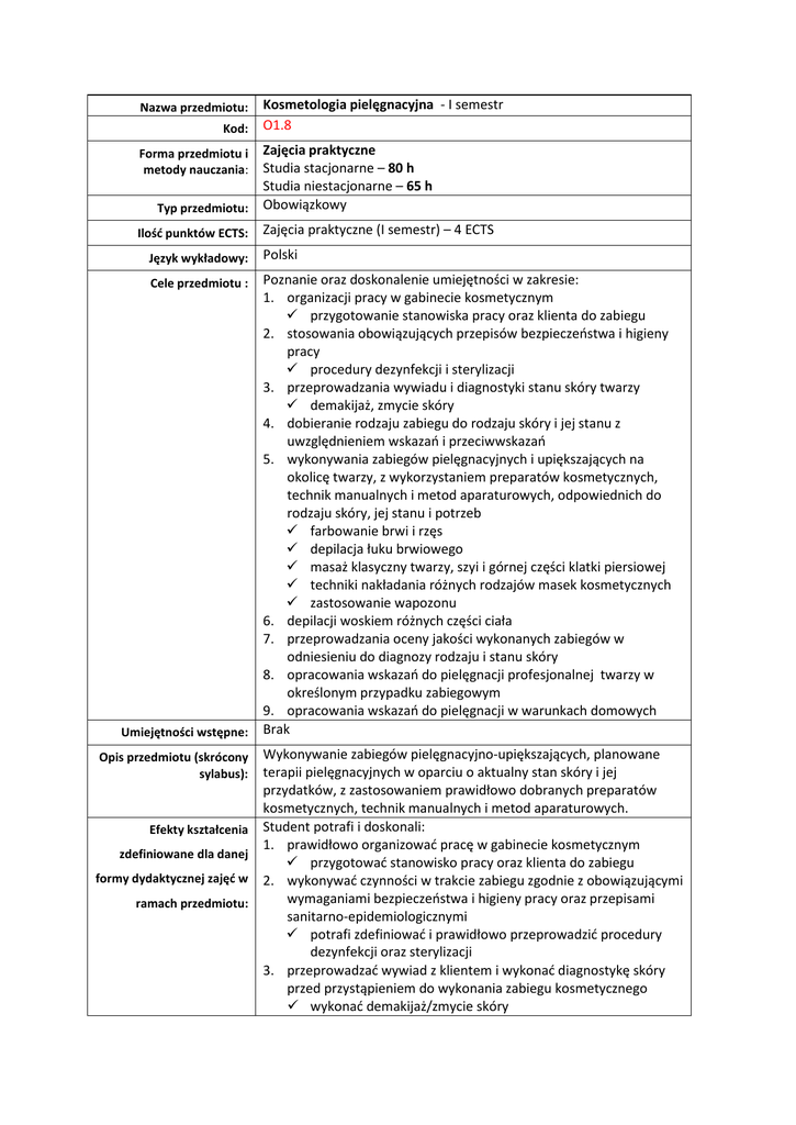 Kosmetologia pielęgnacyjna - I semestr Kod: O1.8 Nazwa przedmiotu: Zajęcia praktyczne Studia stacjonarne – 80 h Studia niestacjonarne – 65 h Typ przedmiotu: Obowiązkowy Forma przedmiotu i metody nauczania: Ilość punktów ECTS: Zajęcia praktyczne (I semestr) – 4 ECTS Język wykładowy: Polski Cele przedmiotu : Poznanie oraz doskonalenie umiejętności w zakresie: 1. organizacji pracy w gabinecie kosmetycznym przygotowanie stanowiska pracy oraz klienta do zabiegu 2. stosowania obowiązujących przepisów bezpieczeństwa i higieny pracy procedury dezynfekcji i sterylizacji 3. przeprowadzania wywiadu i diagnostyki stanu skóry twarzy demakijaż, zmycie skóry 4. dobieranie rodzaju zabiegu do rodzaju skóry i jej stanu z uwzględnieniem wskazań i przeciwwskazań 5. wykonywania zabiegów pielęgnacyjnych i upiększających na okolicę twarzy, z wykorzystaniem preparatów kosmetycznych, technik manualnych i metod aparaturowych, odpowiednich do rodzaju skóry, jej stanu i potrzeb farbowanie brwi i rzęs depilacja łuku brwiowego masaż klasyczny twarzy, szyi i górnej części klatki piersiowej techniki nakładania różnych rodzajów masek kosmetycznych zastosowanie wapozonu 6. depilacji woskiem różnych części ciała 7. przeprowadzania oceny jakości wykonanych zabiegów w odniesieniu do diagnozy rodzaju i stanu skóry 8. opracowania wskazań do pielęgnacji profesjonalnej twarzy w określonym przypadku zabiegowym 9. opracowania wskazań do pielęgnacji w warunkach domowych Brak Umiejętności wstępne: Wykonywanie zabiegów pielęgnacyjno-upiększających, planowane terapii pielęgnacyjnych w oparciu o aktualny stan skóry i jej przydatków, z zastosowaniem prawidłowo dobranych preparatów kosmetycznych, technik manualnych i metod aparaturowych. Efekty kształcenia Student potrafi i doskonali: 1. prawidłowo organizować pracę w gabinecie kosmetycznym zdefiniowane dla danej przygotować stanowisko pracy oraz klienta do zabiegu formy dydaktycznej zajęć w 2. wykonywać czynności w trakcie zabiegu zgodnie z obowiązującymi wymaganiami bezpieczeństwa i higieny pracy oraz przepisami ramach przedmiotu: sanitarno-epidemiologicznymi potrafi zdefiniować i prawidłowo przeprowadzić procedury dezynfekcji oraz sterylizacji 3. przeprowadzać wywiad z klientem i wykonać diagnostykę skóry przed przystąpieniem do wykonania zabiegu kosmetycznego wykonać demakijaż/zmycie skóry Opis przedmiotu (skrócony sylabus): 4. dobrać zabieg kosmetyczny, odpowiedni do rodzaju i stanu skóry z uwzględnieniem wskazań i przeciwwskazań 5. przeprowadzić zabieg pielęgnacyjno-upiększający twarzy, szyi i dekoltu, z wykorzystaniem preparatów kosmetycznych i aparatury kosmetycznej wykonać zabieg farbowania brwi i rzęs oraz regulację brwi wykonać masaż klasyczny twarzy, szyi i górnej części klatki piersiowej nakładać na skórę podstawowe rodzaje masek kosmetycznych, zgodnie z zaleceniami aplikacyjnymi wykonać zabieg kosmetyczny z wykorzystaniem wapozonu wykonać depilację woskiem 6. rozróżniać podstawowe pojęcia i terminy z zakresu kosmetologii pielęgnacyjnej 7. identyfikować i analizować uzyskane informacje 8. przeprowadzić ocenę jakości wykonywanych zabiegów kosmetycznych 9. opracować wskazania do pielęgnacji profesjonalnej 10. opracować wskazania do pielęgnacji domowej Sposób zaliczenia, kryteria Dopuszczalna jedna nieobecność usprawiedliwiona Zaliczenie zajęć praktycznych - podstawą zaliczenia jest uzyskanie zaliczenia metody średniej arytmetycznej z trzech składowych: ewaluacji wiedzy 1. „wejściówek” 2. praktycznego zaliczenia metodyki wykonywania elementów lub całych zabiegów (technik manualnych, metod aparaturowych) 3. testu (20 pytań zamkniętych, jednokrotnego wyboru, 60% poprawnych odpowiedzi zalicza) Zaliczenie odbywa się na ostatnich zajęciach w semestrze zimowym Literatura: 1. Choroby skóry i choroby przenoszone drogą płciową, S. Jabłońska, S. Majewski, PZWL, Warszawa 2005 2. Dermatologia dla kosmetologów, Z. Adamski, A. Kaszuba, Elsevier Urban & Partner, Wrocław 2010 3. DERMATOLOGIA Podręcznik dla studentów kosmetologii, D. Nowicka, Górnicki Wydawnictwo Medyczne, Wrocław 2007 1. Higiena - podręcznik dla studentów wydziałów kosmetologii, E. Murawska-Ciałowicz, M. Zawadzki, Górnicki Wydawnictwo Medyczne, Wrocław 2005 2. Kosmetyczne zastosowanie witaminy A i E, J. Arct, S. Majewski, K. Pytkowska, Wydawnictwa WSZKiPZ, Warszawa 2003 3. Kosmetologia i farmakologia skóry, Marie-Claude Martini, red. wyd.pol. W. Placek, Wydawnictwo Lekarskie PZWL, Warszawa 2006 4. Kosmeceutyki, [w:] Dermatologia Kosmetyczna, pod red.: Jeffrey’a S. Dover’a, Urban&Partner, Wrocław 2006 5. Kosmetologia pielęgnacyjna, A. Goliszewska, M. Gromek, K. Padlewska, M. Smolińska, E. Sobolewska, D. Witkowska, Wydawnictwa WSZKiPZ, Warszawa 2010 6. Kosmetyka - podręcznik do nauki zawodu - poradnik, I. B. Peters, REA, Warszawa 2002 7. Kosmetyka ozdobna i pielęgnacja twarzy, X. Petsitis, K. Kipper, red. wyd. pol. B. Pytrus-Sędłak, MedPharm, Wrocław 2007 8. Kosmetologia pielęgnacyjna i lekarska, M. Noszczyk, Wydawnictwo Lekarskie PZWL, Warszawa 2010 9. Masaż w kosmetyce i odnowie biologicznej, L. Magiera, BIO-STYL, Kraków 2007 10. Fizjoterapia w kosmetologii i medycynie estetycznej, W. Kasprzak, A. Mańkowska, PZWL, Warszawa 2010 11. Narząd ruchu, [w:] Podręczny atlas anatomii człowieka, W. Kahle, H. Leonhardt, W. Platzer, Wydawnictwo Medyczne Słowiński Verlag, Brema 1997 mgr Maria Klamczyńska Koordynator przedmiotu: Prowadzący zajęcia: Data aktualizacji: Stacjonarne: Ewa Sobolewska, Małgorzata Politowska, Teresa Jastrzębska Niestacjonarne: Agnieszka Cieplińska, Magdalena Owczarek 14.09.2012