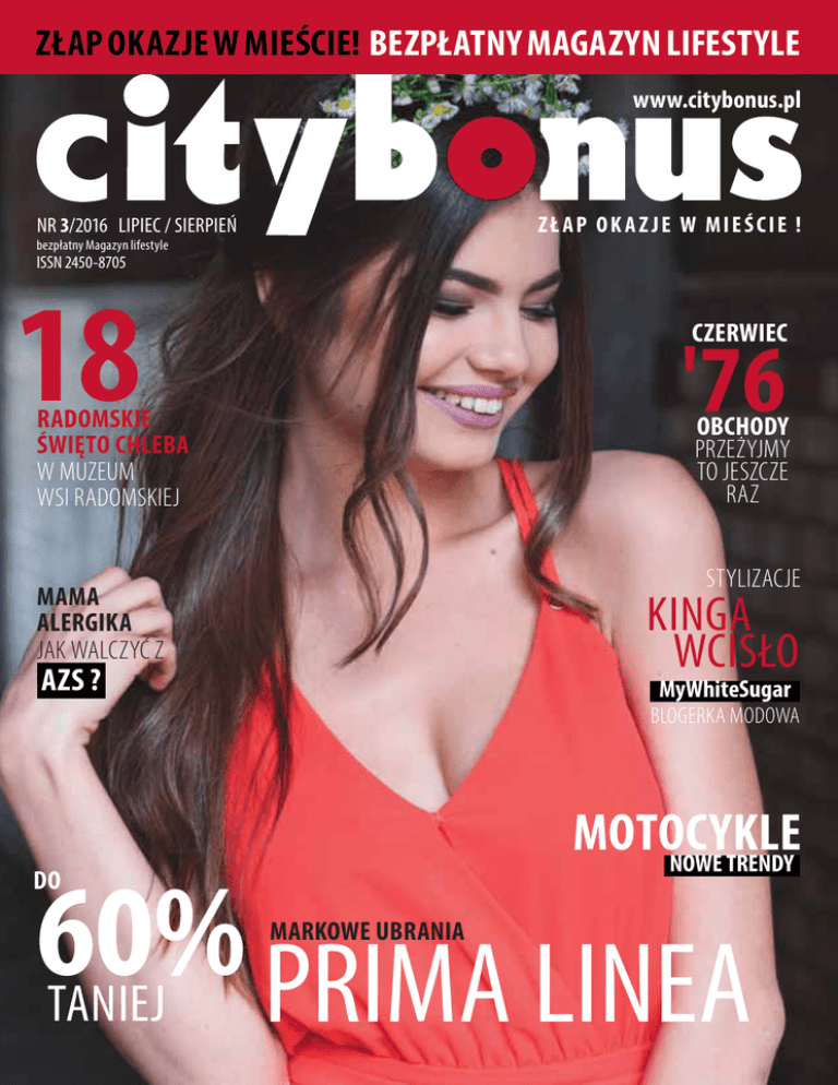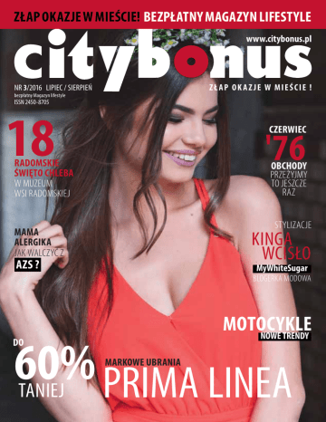 ZŁAP OKAZJE W MIEŚCIE! BEZPŁATNY MAGAZYN LIFESTYLE www.citybonus.pl ZŁAP OKAZJE W MIEŚCIE ! NR 3/2016 LIPIEC / SIERPIEŃ bezpłatny Magazyn lifestyle ISSN 2450-8705 18 CZERWIEC '76 RADOMSKIE ŚWIĘTO CHLEBA W MUZEUM WSI RADOMSKIEJ OBCHODY PRZEŻYJMY TO JESZCZE RAZ STYLIZACJE MAMA ALERGIKA JAK WALCZYĆ Z KINGA WCISŁO AZS ? MyWhiteSugar BLOGERKA MODOWA MOTOCYKLE NOWE TRENDY 60% PRIMA LINEA DO MARKOWE UBRANIA TANIEJ PUNKT SPRZEDAŻY ul. Warszawska 65 Wsola k/Radom, 26-660 Jedlińsk tel. 48 321 54 92 tel. 48 321 54 98 PUNKT SPRZEDAŻY ul. Zegara Słonecznego 1 (Osiedle Słoneczne) 26-660 Radom tel. 48 629 46 59 SPIS TREŚCI LIPIEC / SIERPIEŃ MODA ZDROWIE Blogerka modowa - Kinga Wcisło - MyWhiteSugar 6 URODA 12 14 15 VILLA BELLA SPA Makijaż - stylizacje Fryzury - stylizacje HOBBY 34 38 40 PRZEDSIĘBIORCZY RADOMIANIN 42 Ewelina Szymańska - Ja, radomianka DZIECKO 16 Radomski zespół osadniczy TEMAT WYDANIA 46 Krótka historia GRANATOVO KUCHNIA Radomskie Święto Chleba - 18 lat tradycji Święto Chleba - oczami Jarosława Gajdy 18 20 WYDARZENIA 50 52 Polędwica z dorsza Teatralny klimat w nowej odsłonie KULTURA 26 Ku pamięci Czerwca '76 SPORT Od przyszłego roku zmiany w nauce jazdy Co wybierają radomscy motocykliści? WYDAWNICTWO: EWIT Sp. z o.o. ul. Toruńska 9, 26-600 Radom tel. 48-384-57-12 fax 48-384-57-12 wew. 99 e-mail: [email protected] www.ewit.pl REDAKTOR NACZELNA: Klementyna Frysztak tel. 48-384-57-12 wew. 14 e-mail: [email protected] KONTO BANKOWE WBK I Oddział Radom 22 1090 1506 0000 0001 0265 5561 KRS 0000217384 NIP 956-213-24-38 ISSN 2450-8705 REKLAMA: Arkadiusz Rotuski tel. 48-384-57-12 wew. 16 e-mail: [email protected] Łukasz Tatar 696 307 527 e-mail: [email protected] www.citybonus.pl Crossfit - silniejszy, szybszy, sprawniejszy Zawsze jest tak, że ktoś pierwszy musi zacząć.. Mama Alergika Poleca REDAKCJA: Katarzyna Molenda e-mail: [email protected] 31 32 Mazowieckie Centrum Sztuki Współczesnej Elektrownia w Radomiu 56 Muzea / Teatr / Kino / Muzyka / Książki 59-60 KUPONY RABATOWE 62 Złap Okazję w Mieście SKŁAD I ŁAMANIE: Eliza Wilczyńska tel. 48-384-57-13 e-mail: [email protected] Przemysław Wiśniewski e-mail: [email protected] FOTO: Marian Strudziński Paulina Piorun KOREKTA: Redakcja CYKL WYDAWNICZY: dwumiesięcznik NAKŁAD: 10 tys. DRUK: OMEGA PRESS PREZES ZARZĄDU: dr Uwe Arndt WICEPREZES: Klementyna Frysztak DYREKTOR DS. WYDAWNICZYCH: Grzegorz Majak Sąd Rejonowy dla Miasta Stołecznego Warszawy w Warszawie XIX Wydział Gospodarczy KRS Redakcja nie zwraca materiałów niezamówionych oraz zastrzega sobie prawo do skracania i redakcyjnego opracowania tekstów przyjętych do druku. Za treść reklam i ogłoszeń redakcja nie odpowiada. Kapitał p zakładowyy 200 000 zł lipiec-sierpień 2016 | CityBonus 3 EDYTORIAL ZDJĘCIA: PAULINA PIORUN PIXELHOUSEFOTOGRAFIA / ANNA JARECKA DRODZY CZYTELNICY ! Sezon letni w pełni i zapewne część z Was właśnie odlicza dni do upragnionego urlopu. Co powiecie zatem na wakacyjną lekturę w postaci trzeciego już numeru naszego magazynu? Aby wypoczynek fizyczny szedł w parze z relaksem umysłu, nowe wydanie City Bonusa to duża strefa mody, urody oraz promocji zdrowego stylu życia. Tym razem postanowiliśmy również położyć większy nacisk na dostarczenie rozrywki Panom: stąd obszerny materiał na temat treningów Crossfit oraz tak często spotykanych ostatnio na ulicach naszego miasta motocyklach. Oczywiście jako lokalni patrioci nie mogliśmy także pominąć milczeniem szeregu atrakcji, które miasto przez cały upalny czerwiec serwowało radomianom oraz licznie przybyłym z różnych innych zakątków kraju gościom w ramach obchodów okrągłego jubileuszu wielkiego robotniczego zrywu z 1976 r. Osobom, które nie mogły brać udziału w koncertach, piknikach i innych uroczystościach oraz tym, którzy spędzili w Radomiu wspaniały początek lata i chętnie wróciliby do niego myślami, dedykujemy temat bieżącego wydania – Ku pamięci Czerwca '76! A poza tym: lato latem, ale w redakcji już wybiegamy myślą w przyszłość, gdzie na początku września czeka nas XVIII już, radomskie Święto Chleba. Ta coroczna, realizowana z imponującym rozmachem w sielskiej scenerii Muzeum Wsi Radomskiej impreza z każdą edycją gromadzi coraz więcej osób oraz przynosi nowe, organizacyjne niespodzianki. Przyznajcie Państwo – kto z nas czasami nie ma ochoty oderwać się od wszechobecnej technologii i zamiast tego popatrzeć na przykład na wyrabianie masła w maselnicy czy młócenie cepami zboża? Dla nas tegoroczne Święto Chleba będzie szczególne ważne ze względu na planowaną promocję i kolportaż naszego magazynu. Nowy City Bonus to również szczera rozmowa z przedsiębiorczą radomianką Eweliną Szymańską, historia dwóch kobiet: Dominiki i Basi, które stworzyły markę odzieży Granatovo jako wyraz buntu przeciwko powszechnie panującemu przekonaniu, że „rodzić można w byle czym” - a także inne stałe rubryki oraz prezent w postaci atrakcyjnych kuponów rabatowych do kilku radomskich firm. REDAKTOR NACZELNA Klementyna Frysztak Życzę Państwu przyjemnych wrażeń podczas lektury, udanego letniego wypoczynku oraz ponownej aklimatyzacji w miejscu pracy osobom, które niestety wakacyjny wyjazd mają już za sobą ZŁAP OKAZJE W MIEŚCIE! BEZPŁATNY MAGAZYN LIFESTYLE www.citybonus.pl ZŁAP OKAZJE W MIEŚCIE ! NR 3/2016 LIPIEC / SIERPIEŃ bezpłatny Magazyn lifestyle ISSN 2450-8705 18 CZERWIEC '76 RADOMSKIE ŚWIĘTO CHLEBA W MUZEUM WSI RADOMSKIEJ W TYM NUMERZE OBCHODY CZERWCA '76 PRZEŻYJMY TO JESZCZE RAZ► S. 26 www.citybonus.pl OBCHODY PRZEŻYJMY TO JESZCZE RAZ STYLIZACJE MAMA ALERGIKA JAK WALCZYĆ Z KINGA WCISŁO AZS ? MyWhiteSugar BLOGERKA MODOWA MOTOCYKLE NOWE TRENDY 60% TANIEJ PRIMA LINEA DO MARKOWE UBRANIA NASZA OKŁADKA: zdjęcie: PixelHouseFotografia PAULINA PIORUN stylizacja: KINGA WCISŁO MyWhiteSugar makijaż: KAMILA TADRIYAN włosy: JAKUB KOŁACZEK -NIEWIADOMS