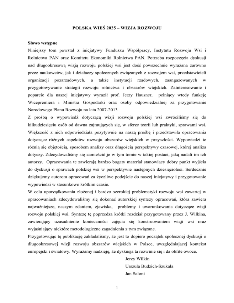 POLSKA WIEŚ 2025 – WIZJA ROZWOJU Słowo wstępne Niniejszy tom powstał z inicjatywy Funduszu Współpracy, Instytutu Rozwoju Wsi i Rolnictwa PAN oraz Komitetu Ekonomiki Rolnictwa PAN. Potrzeba rozpoczęcia dyskusji nad długookresową wizją rozwoju polskiej wsi jest dość powszechnie wyrażana zarówno przez naukowców, jak i działaczy społecznych związanych z rozwojem wsi, przedstawicieli organizacji pozarządowych, a także instytucji rządowych, zaangażowanych w przygotowywanie strategii rozwoju rolnictwa i obszarów wiejskich. Zainteresowanie i poparcie dla naszej inicjatywy wyraził prof. Jerzy Hausner, pełniący wtedy funkcję Wicepremiera i Ministra Gospodarki oraz osoby odpowiedzialnej za przygotowanie Narodowego Planu Rozwoju na lata 2007-2013. Z prośbą o wypowiedź dotyczącą wizji rozwoju polskiej wsi zwróciliśmy się do kilkudziesięciu osób od dawna zajmujących się, w sferze teorii lub praktyki, sprawami wsi. Większość z nich odpowiedziała pozytywnie na naszą prośbę i przedstawiła opracowania dotyczące różnych aspektów rozwoju obszarów wiejskich w przyszłości. Wypowiedzi te różnią się objętością, sposobem analizy oraz długością perspektywy czasowej, której analiza dotyczy. Zdecydowaliśmy się zamieścić je w tym tomie w takiej postaci, jaką nadali im ich autorzy. Opracowania te zawierają bardzo bogaty materiał stanowiący dobry punkt wyjścia do dyskusji o sprawach polskiej wsi w perspektywie następnych dziesięcioleci. Serdecznie dziękujemy autorom opracowań za życzliwe podejście do naszej inicjatywy i przygotowanie wypowiedzi w stosunkowo krótkim czasie. W celu uporządkowania złożonej i bardzo szerokiej problematyki rozwoju wsi zawartej w opracowaniach zdecydowaliśmy się dokonać autorskiej syntezy opracowań, która zawiera najważniejsze, naszym zdaniem, zjawiska, problemy i uwarunkowania dotyczące wizji rozwoju polskiej wsi. Syntezę tę poprzedza krótki rozdział przygotowany przez J. Wilkina, zawierający uzasadnienie konieczności zajęcia się konstruowaniem wizji wsi oraz wyjaśniający niektóre metodologiczne zagadnienia z tym związane. Przygotowując tę publikację zakładaliśmy, że jest to dopiero początek społecznej dyskusji o długookresowej wizji rozwoju obszarów wiejskich w Polsce, uwzględniającej kontekst europejski i światowy. Wyrażamy nadzieję, że dyskusja ta rozwinie się i da obfite owoce. Jerzy Wilkin Urszula Budzich-Szukała Jan Saloni 1 J. Wilkin O potrzebie i zasadach tworzenia wizji rozwoju polskiej wsi Wiedza i wyobraźnia Większość osób, do których zwróciliśmy się z prośbą o wypowiedź na temat wizji polskiej wsi to naukowcy. Zachęcając do prezentacji poglądów na ten temat apelowaliśmy, aby przy tworzeniu wizji wykorzystać zarówno wiedzę, jak i wyobraźnię, żeby ocenę tego, co jest i będzie, połączyć z próbą sformułowania poglądu na temat tego jak być powinno. Zauważyliśmy, że zwłaszcza naukowcom trudno jest oderwać się od takiego formułowania opinii, które oparte jest przede wszystkim na tym co zostało zbadane i jaki jest obecny stan rzeczy w analizowanej dziedzinie. W wielu tych wypowiedziach mało jest elementów wizji, a więcej prognozy lub analizy uwarunkowań, które mogą kształtować przyszłość polskiej wsi. Mieliśmy wrażenie, że naukowcy niechętnie lub przynajmniej nieśmiało odwołują się do sfery wyobraźni, traktując poruszanie się w tej sferze jako coś, co dla naukowca jest wręcz wstydliwe. A przecież wyobraźnia jest ważna nie tylko w konstruowaniu wieloletnich planów i strategii, ale też w rozwoju nauki. Co o znaczeniu wyobraźni mówią sami naukowcy? Jan Szczepański stwierdza: W nauce wyobraźnia jest strażą przednią torującą drogi, odkrywającą nowe tereny, które dopiero potem, gdy zostaną rozpoznane, zostaną opanowane siecią pojęć, twierdzeń, teorii. (...) Oto chcę coś zrobić, co wydaje mi się ważne. Przygotowanie jest przede wszystkim uruchomieniem wyobraźni: czy cel jest dobrze sformułowany, czy potrafię przewidzieć przebieg realizacji, czy potrafię wyobrazić sobie reakcje otoczenia, wyobrazić możliwe skutki dla samej sprawy, dla ludzi uwikłanych, dla mnie – słowem w aktach wyobraźni uruchamiam całą dotychczasową wiedzę racjonalną, wszystkie moje intuicyjne wyczucia, wszystkie możliwości empatii w stany emocjonalne innych ludzi, uogólnienia moich praktycznych doświadczeń. Tak więc w wyobraźni jak w soczewce koncentrują się moje zdolności, wiedza, przenikliwość i wszystko z mojego świata wewnętrznego, czego nie umiem nazwać1. Z kolei, autor książki: „Wyobraźnia organizacyjna” – Gareth Morgan, przytacza na początku swoich rozważań następujące opinie: Witajcie w świecie, w którym wyobraźnia jest 2 źródłem wartości w gospodarce (Tom Peters) oraz Wyobraźnia jest o wiele ważniejsza niż wiedza. (...) Stawianie nowych pytań, ukazywanie nowych możliwości, rozpatrywanie starych problemów z nowego punktu widzenia wymaga twórczej wyobraźni i oznacza prawdziwy postęp w nauce (Albert Einstein)2. Konstruowanie wizji wsi polskiej za 20-25 lat potraktować więc możemy jako bardzo pożyteczne połączenie wykorzystania wiedzy i wyobraźni. O potrzebie wizji przyszłości kraju Z istoty podmiotowości człowieka wynika jego prawo do podejmowania decyzji, które czynią jego życie lepszym, pełniejszym i bogatszym. Podmiotowość jest ściśle powiązana z niezależnością, godnością i aktywnością człowieka. Człowiek jako podmiot rozwoju chce kształtować swoje otoczenie i chce kształtować swoją przyszłość. Ludzie mają na ogół wyobrażenie tego, co jest dla nich stanem pożądanym, mają więc wizje przyszłości bliższej i dalszej. Część tych pragnień i wyobrażeń mogą zrealizować sami, ale znaczna ich część ma szanse realizacji tylko poprzez działania zbiorowe, organizowane na różnych szczeblach
