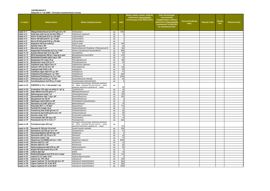 128/PNE/SW/2013 Załącznik nr 1 do SIWZ - Formularz asortymentowo cenowy Nazwa, dawka, postać, wielkość opakowania równoważnika oferowanego przez Wykonawcę nr części Nazwa towaru Nazwa międzynarodowa j.m część nr 1 część nr 2 część nr 3 część nr 4 część nr 5 część nr 6 część nr 7 część nr 8 część nr 9 część nr 10 część nr 11 część nr 12 część nr 13 część nr 14 część nr 15 część nr 16 część nr 17 część nr 18 część nr 19 część nr 20 część nr 21 część nr 22 Aflegan/Ambrohexal inj 0.015 g/2 ml x 10* Antyt jadu żmij roz do inj dom 500j x 1 Arava 10 tabl powl 0.01 g x 30 tablArava 100 tabl powl 0.1 g x 3 tabl Arava 20 tabl powl 0.02 g x 30 tabl Argentum nitricum subst g* Ascofer draż x 50* Atecortin zaw 5 ml* Augmentin/Taromentin inj 2.2 g 1 fiol* Avedol (Atram) tabl 12.5 mg x 30* BCG Szczepionka SSI pr+ rozp do p zaw* Betahistine/Vestibo tabl 8 mg x 100* Butapirazol 5% maść 30 g* Butapirazol czop 0.25 g x 5* Calcitonin amp 100j m /ml x 5* Calcium 10% inj 10 ml x 10* Captopril tabl 0.025 x 40* Cardilopin Agen tabl 0.01 g x 30* Cefotaxim/Tarcefoksym 1 g 1 fiol* Ceftriaxon/Tartriakson inj 1 g 1 fiol* Chlorsuccillin inj 0.2 g x 10 fiol* Cocarboxylasum inj 0.05 g x 5 amp* Ambroxolum Antitoxinum vipericum Leflunomidum Leflunomidum Leflunomidum Argenti nitras Ferrosi gluconas Hydrocortisonum+Oxytetrac.+Polymyxinum B Acidum clavulanicum+Amoxicillinum Carvedilolum Mycobacterium bovis BCG Betahistine Phenylbutazonum Phenylbutazonum Calcitoninum salmonis Calcii glubionas Captoprilum Amlodipinum Cefotaximum Ceftriaxonum Suxamethionium chloride Cocarboxylasi hydrochloridum op op op op op op op op op op op op op op op op op op op op op op część nr 23 CODOFIX nr 10 x 1 mb bandaż 1 szt Wymagana dokumentacja: deklaracja zgodności str….oferty - certyfikat CE (lub inne) str…..oferty parametry techniczno użytkowe str…..oferty op część nr 24 część nr 25 część nr 26 część nr 27 część nr 28 część nr 29 część nr 30 część nr 31 część nr 32 część nr 33 część nr 34 część nr 35 część nr 36 część nr 37 Crotamiton 10% płyn na skórę 0.1 g/1 g Depo Medrol inj 0.04 g/ml x 1* Detreomycyna subst 1 g* Dexamethason tabl 1 mg x 20* Dexapolcort aer 55 ml* Diphergan draż 0.025 g x 20* Diprophos inj 0.007 g/ml x 5* Doxyratio M 0.1 x 10 tabl* Fenactil 4% krople 10 g* Fenactil inj dom 0.025 g/5 ml x 5* Fenactil inj doż 0.025 g/ml 2 ml x 10* Flucinar maść 15.0* Fluconazole tabl 100 mg x 28* Fluorescein inj 10 % 5 ml x 1* Crotamitonum Methylprednisolonum Chloramphenicolum Dexamethasonum Dexamethasonum Promethazini hydrochloridum Betamethasone Doxyciclinum Chlorpromazinum Chlorpromazinum Chlorpromazinum Fluocinoloni acetonidum Fluconazolum Fluoresceinum op op op op op op op op op op op op op op część nr 38 Formalinum płyn 40% kg* Wymagana dokumentacja: deklaracja zgodności str….oferty - certyfikat CE (lub inne) str…..oferty parametry techniczno użytkowe str…..oferty op część nr 39 część nr 40 część nr 41 część nr 42 część nr 43 część nr 44 część nr 45 część nr 46 część nr 47 część nr 48 część nr 49 część nr 50 część nr 51 część nr 52 część nr 53 część nr 54 część nr 55 Gensulin R 100 j/ml 10 ml fiol* Gentamicin inj 0.04 g/1 ml x 10* Glucobay/Adeksa tabl 50 mg x 30* Glucosum 40% inj 10 ml x 10* Glucosum subst 1 kg* Heparinum inj 25000j m/5 ml x 1 fiol* Heviran tabl 0.2 x 30* Heviran tabl 0.4 x 30* Hydrocortisonum tabl 0.02 g x 20* Isoptin SR tabl powl 0.24 g x 20* Jodyna płyn kg* Ketanest/Calypsol inj 0.5/10 ml x 5 amp* Laticort 0.1% maść 15.0* Lidocai aer 10% 38 g* Lignoc hydroch 1% inj 0.02 g/2 ml x 10* Lignoc hydroch 2% A żel 30.0* Lignoc hydroch 2% U żel 30.0* Insulini injectio neutralis Gentamicinum Acarbosum Glucosum Glucosum Heparinum natricum Aciclovirum Aciclovirum Hydrocortisonum Verapamilum Iodine Ketaminum Hydrocortisoni butyras Lidocainum Lidocainum hydrochloridum Lidocainum hydrochloridum Lidocainum hydrochloridum op op op op op op op op op op op op op op op op op Ilość 1300 2 1 1 1 400 30 120 820 20 210 10 190 25 5 150 50 10 850 2300 35 2 30 15 60 150 255 5 5 70 170 10 25 35 10 15 820 170 200 70 5 35 10 9200 10 20 20 5 10 170 2 200 650 800 1200 Ilość oferowanego równoważnika uwzględniająca wielkość opakowania równoważnika i przeliczenie w stosunku do zamawianej ilości Cena jednostkowa netto Wartość netto Stawka VAT Wartość brutto część nr 56 część nr 57 część nr 58 część nr 59 część nr 60 Lorinden A maść 15.0* Majamil prol tabl pow 0.1 g x 20* Maxipime 2 g/Cefepime x 1 fiol* Metocard tabl 0.05 g x 30* Minirin Melt tabl 0.06 mg x 30* Acidum salicylicum+Flumetasonum Diclofenacum Cefepimum Metoprololi tartas Desmopressini acetas r-r do stos wewn gałk do zwęż. źrenicy zawiera 0,1mg karbacholu fiol 1,5 ml Diclofenacum Netilmicinum Nitrofuralum Glyceroli trinitras Drotaverini hydrochloridum Natrii pamidronas Paracetamolum Pentoxifyllinum Perazinum część nr 61 Miostat 0.01% inj 1.5 ml x 12 fiol część nr 62 część nr 63 część nr 64 część nr 65 część nr 66 część nr 67 część nr 68 część nr 69 część nr 70 część nr 71 Naclofen Diclac inj 0.025 g/ml 3 ml x 5* Netromycin inj 0.2 g/2 ml x 1 fiol* Nitrofurazon 0.2 % ung 25 g*Nitromint aer 10.0 No-Spa inj 0.04 g/2 ml 5 amp a 2 ml* Pamifos 0.06 g/10 ml x 1 amp* Paracetamol zaw doust 0.12 g/5 ml 150 g* Pentohexal 600 Retard tabl x 30* Perazinum tabl 0.1 g x 30* Perhydrol płyn 30% kg* część nr 72 Plastry 1 m x 8 cm x 1 tk Wymagana dokumentacja: deklaracja zgodności str….oferty - certyfikat CE (lub inne) str…..oferty parametry techniczno użytkowe str…..oferty op część nr 73 Plastry 1 m x 8 cm x 1 wł Wymagana dokumentacja: deklaracja zgodności str….oferty - certyfikat CE (lub inne) str…..oferty parametry techniczno użytkowe str…..oferty op część nr 74 część nr 75 część nr 76 część nr 77