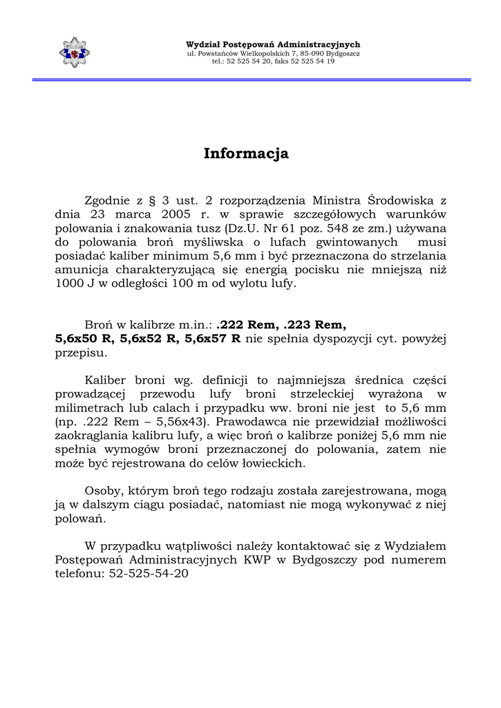 Wydział Postępowań Administracyjnych ul. Powstańców Wielkopolskich 7, 85-090 Bydgoszcz tel.: 52 525 54 20, faks 52 525 54 19 Informacja Zgodnie z § 3 ust. 2 rozporządzenia Ministra Środowiska z dnia 23 marca 2005 r. w sprawie szczegółowych warunków polowania i znakowania tusz (Dz.U. Nr 61 poz. 548 ze zm.) używana do polowania broń myśliwska o lufach gwintowanych musi posiadać kaliber minimum 5,6 mm i być przeznaczona do strzelania amunicja charakteryzującą się energią pocisku nie mniejszą niż 1000 J w odległości 100 m od wylotu lufy. Broń w kalibrze m.in.: .222 Rem, .223 Rem, 5,6x50 R, 5,6x52 R, 5,6x57 R nie spełnia dyspozycji cyt. powyżej przepisu. Kaliber broni wg. definicji to najmniejsza średnica części prowadzącej przewodu lufy broni strzeleckiej wyrażona w milimetrach lub calach i przypadku ww. broni nie jest to 5,6 mm (np. .222 Rem – 5,56x43). Prawodawca nie przewidział możliwości zaokrąglania kalibru lufy, a więc broń o kalibrze poniżej 5,6 mm nie spełnia wymogów broni przeznaczonej do polowania, zatem nie może być rejestrowana do celów łowieckich. Osoby, którym broń tego rodzaju została zarejestrowana, mogą ją w dalszym ciągu posiadać, natomiast nie mogą wykonywać z niej polowań. W przypadku wątpliwości należy kontaktować się z Wydziałem Postępowań Administracyjnych KWP w Bydgoszczy pod numerem telefonu: 52-525-54-20