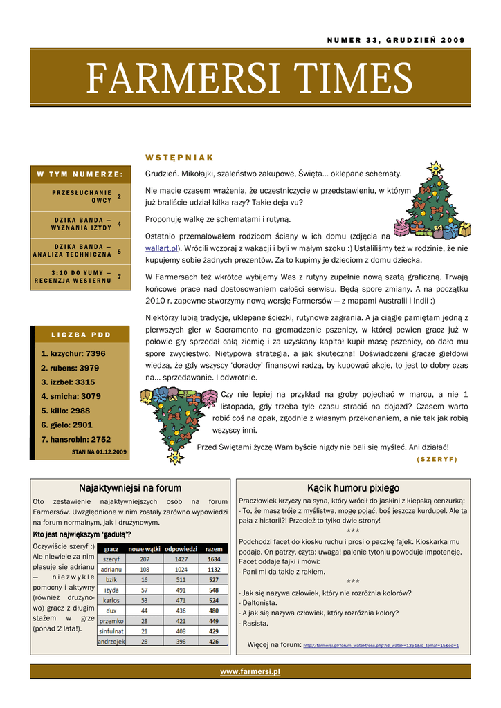 NUMER 33, GRUDZIEŃ 2009 FARMERSI TIMES WSTĘPNIAK W TYM NUMERZE: Grudzień. Mikołajki, szaleństwo zakupowe, Święta... oklepane schematy. PRZESŁUCHANIE 2 OWCY Nie macie czasem wrażenia, że uczestniczycie w przedstawieniu, w którym już braliście udział kilka razy? Takie deja vu? DZIKA BANDA — 4 WYZNANIA IZYDY Proponuję walkę ze schematami i rutyną. DZIKA BANDA — ANALIZA TECHNICZNA 5 3:10 DO YUMY — 7 RECENZJA WESTERNU LICZBA PDD 1. krzychur: 7396 2. rubens: 3979 3. izzbel: 3315 Ostatnio przemalowałem rodzicom ściany w ich domu (zdjęcia na wallart.pl). Wrócili wczoraj z wakacji i byli w małym szoku :) Ustaliliśmy też w rodzinie, że nie kupujemy sobie żadnych prezentów. Za to kupimy je dzieciom z domu dziecka. W Farmersach też wkrótce wybijemy Was z rutyny zupełnie nową szatą graficzną. Trwają końcowe prace nad dostosowaniem całości serwisu. Będą spore zmiany. A na początku 2010 r. zapewne stworzymy nową wersję Farmersów — z mapami Australii i Indii :) Niektórzy lubią tradycje, uklepane ścieżki, rutynowe zagrania. A ja ciągle pamiętam jedną z pierwszych gier w Sacramento na gromadzenie pszenicy, w której pewien gracz już w połowie gry sprzedał całą ziemię i za uzyskany kapitał kupił masę pszenicy, co dało mu spore zwycięstwo. Nietypowa strategia, a jak skuteczna! Doświadczeni gracze giełdowi wiedzą, że gdy wszyscy ‘doradcy’ finansowi radzą, by kupować akcje, to jest to dobry czas na... sprzedawanie. I odwrotnie. 4. smicha: 3079 5. killo: 2988 6. gielo: 2901 7. hansrobin: 2752 STAN NA 01.12.2009 Czy nie lepiej na przykład na groby pojechać w marcu, a nie 1 listopada, gdy trzeba tyle czasu stracić na dojazd? Czasem warto robić coś na opak, zgodnie z własnym przekonaniem, a nie tak jak robią wszyscy inni. Przed Świętami życzę Wam byście nigdy nie bali się myśleć. Ani działać! (SZERYF) Najaktywniejsi na forum Kącik humoru pixiego Oto zestawienie najaktywniejszych osób na forum Farmersów. Uwzględnione w nim zostały zarówno wypowiedzi na forum normalnym, jak i drużynowym. Praczłowiek krzyczy na syna, który wrócił do jaskini z kiepską cenzurką: - To, że masz tróję z myślistwa, mogę pojąć, boś jeszcze kurdupel. Ale ta pała z historii?! Przecież to tylko dwie strony! *** Podchodzi facet do kiosku ruchu i prosi o paczkę fajek. Kioskarka mu podaje. On patrzy, czyta: uwaga! palenie tytoniu powoduje impotencję. Facet oddaje fajki i mówi: - Pani mi da takie z rakiem. *** - Jak się nazywa człowiek, który nie rozróżnia kolorów? - Daltonista. - A jak się nazywa człowiek, który rozróżnia kolory? - Rasista. Kto jest największym ‘gadułą’? Oczywiście szeryf :) Ale niewiele za nim plasuje się adrianu — niezwykle pomocny i aktywny (również drużynowo) gracz z długim stażem w grze (ponad 2 lata!). Więcej na forum: http://farmersi.pl/forum_watektresc.php?id_watek=1351&id_temat=15&od=1 www.farmersi.pl PRZESŁUCHANIE... OWCY! Kidantrim: W święta Bożego Narodzenia podobno zwierzęta przemawiają ludzkim głosem. Farmersi Times udowadniają, że nie tylko w święta ze zwierzętami można pogadać. O kim mowa ? Owcaowca będzie kolejną ofiarą wywiadu FT. Witam cię owcaowca :) Kim jest owcaowca? Owcawca: Witam również. K: Do świąt jeszcze trochę czasu, ale o przygotowaniach do nich można powoli mówić. Jak Ty będziesz się przygotowywał? O: Po pierwsze primo wrócę do domu, by choć na chwilę odpocząć od ciężkiego i jakże czasochłonnego życia studenta. Dla mnie święta, jak to święta, bez choinki obyć się nie mogą., tak więc na początku choinka. Bombki, światełka... każdy wie o co chodzi :) By zachować jakże miły świąteczny nastrój rodzinnego domu, najważniejszą rzeczą będzie sprzątanie. Święta = porządki. Jako pracowity człowiek niczym mrówka pracownica zabiorę się do roboty. Potem zakupy, prezenty... To, czego najbardziej nie lubię. Chodzi człowiek po sklepach, widzi misia.. A, to nie ten, idziemy dalej. Patrzy, a tu taki pies pluszowy (mam dziewczynę zakochaną w pluszakach ), no, ale pies drogi, to idziemy dalej. Masakra :( Na szczęście świąteczne potrawy to nie moja fucha, tylko mojej mamy, którą serdecznie pozdrawiam, robi znakomitego mak-owca, czego o karpiu powiedzieć nie można. Na końcu oczywiście wprowadzam się w świąteczny nastrój odstawiając na chwilę szalone przeboje Abby zaczynam słuchać kolęd :) Ciężkie i czasochłonne życie studenta - zaleciało troszkę sarkazmem :) Może powiesz nam coś więcej na ten temat? Heh... Lodówka pusta, oprócz tych 3 piw na górnej półce i kawałka sera pośrodku. Łazienka zajęta. 20 minut do wyjścia. Gołąb napadł na koszulę... Co tu więcej mówić :) Ogólnie chodzi człowiek na zajęcia, słucha, myśli że rozumie, ale nie, nie rozumie. W końcu dostaje olśnienia. W mieszkaniu wszystko się powtórzy, pouczy tak do 1 w nocy. Następny dzień: czyściutko i schludnie idziemy na egzamin, materiał znam na 100%. Pierwsze pytanie. No, może popatrzę na drugie? Nie jednak pierwsze łatwiejsze, znaczy się, mniej trudne. Oddajemy pracę i co? 2. A w jaki sposób owcaowca znalazł się w Farmersach i co tutaj robi? Farmersi Times #33 — grudzień 2009 Zarejestrowany 666 dni temu, rozegrał prawie 1000 gier (niemal półtorej dziennie!), z czego 1/3 to drużynówki. Deklaruje, że ma 19 lat i jest studentem, ale też „rycerzem ratującym damy z opresji, bohaterem walk o niepodległość USA, weteranem Wojny secesyjnej, komandosem z Wietnamu, saperem z Iraku i aktualnie prawą i lewą ręką pana Obamy”. Kim jest więc naprawdę? Tego nie wiemy — na wywiad stawił się w kominiarce, odpowiadał zaciągając mongolskim akcentem, a w dodatku jest weganinem! Najpierw kolega powiedział mi o Farmersach. Zarejestrowałem się, już nie pamiętam jaki nick miałem. W każdym bądź razie pograłem chwilę w Memphis, Burlington też chyba było. P