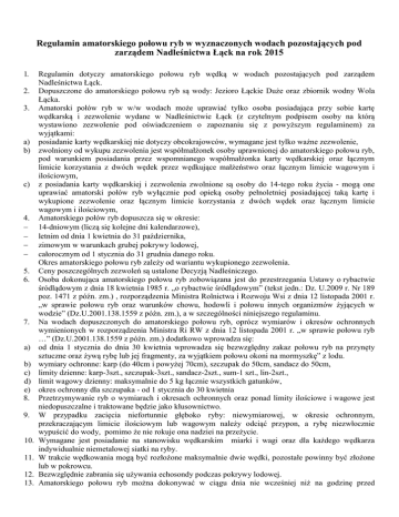 Regulamin amatorskiego połowu ryb w wyznaczonych wodach pozostających pod zarządem Nadleśnictwa Łąck na rok 2015 1. 2. 3. a) b) c) 4. 5. 6. 7. a) b) c) d) e) 8. 9. 10. 11. 12. 13. Regulamin dotyczy amatorskiego połowu ryb wędką w wodach pozostających pod zarządem Nadleśnictwa Łąck. Dopuszczone do amatorskiego połowu ryb są wody: Jezioro Łąckie Duże oraz zbiornik wodny Wola Łącka. Amatorski połów ryb w w/w wodach może uprawiać tylko osoba posiadająca przy sobie kartę wędkarską i zezwolenie wydane w Nadleśnictwie Łąck (z czytelnym podpisem osoby na którą wystawiono zezwolenie pod oświadczeniem o zapoznaniu się z powyższym regulaminem) za wyjątkami: posiadanie karty wędkarskiej nie dotyczy obcokrajowców, wymagane jest tylko ważne zezwolenie, zwolniony od wykupu zezwolenia jest współmałżonek osoby uprawnionej do amatorskiego połowu ryb, pod warunkiem posiadania przez wspomnianego współmałżonka karty wędkarskiej oraz łącznym limicie korzystania z dwóch wędek przez wędkujące małżeństwo oraz łącznym limicie wagowym i ilościowym, z posiadania karty wędkarskiej i zezwolenia zwolnione są osoby do 14-tego roku życia - mogą one uprawiać amatorski połów ryb wyłącznie pod opieką osoby pełnoletniej posiadającej taką kartę i wykupione zezwolenie oraz łącznym limicie korzystania z dwóch wędek oraz łącznym limicie wagowym i ilościowym, Amatorskiego połów ryb dopuszcza się w okresie: 14-dniowym (liczą się kolejne dni kalendarzowe), letnim od dnia 1 kwietnia do 31 października, zimowym w warunkach grubej pokrywy lodowej, całorocznym od 1 stycznia do 31 grudnia danego roku. Okres amatorskiego połowu ryb zależy od wariantu wykupionego zezwolenia. Ceny poszczególnych zezwoleń są ustalone Decyzją Nadleśniczego. Osoba dokonująca amatorskiego połowu ryb zobowiązana jest do przestrzegania Ustawy o rybactwie śródlądowym z dnia 18 kwietnia 1985 r. „o rybactwie śródlądowym” (tekst jedn.: Dz. U.2009 r. Nr 189 poz. 1471 z późn. zm.) , rozporządzenia Ministra Rolnictwa i Rozwoju Wsi z dnia 12 listopada 2001 r. „w sprawie połowu ryb oraz warunków chowu, hodowli i połowu innych organizmów żyjących w wodzie” (Dz.U.2001.138.1559 z późn. zm.), a w szczególności niniejszego regulaminu. Na wodach dopuszczonych do amatorskiego połowu ryb, oprócz wymiarów i okresów ochronnych wymienionych w rozporządzenia Ministra Ri RW z dnia 12 listopada 2001 r. „w sprawie połowu ryb …” (Dz.U.2001.138.1559 z późn. zm.) dodatkowo wprowadza się: od dnia 1 stycznia do dnia 30 kwietnia wprowadza się bezwzględny zakaz połowu ryb na przynęty sztuczne oraz żywą rybę lub jej fragmenty, za wyjątkiem połowu okoni na mormyszkę” z lodu. wymiary ochronne: karp (do 40cm i powyżej 70cm), szczupak do 50cm, sandacz do 50cm, limity dzienne: karp-3szt., szczupak-3szt., sandacz-2szt., sum-1 szt., lin-2szt., limit wagowy dzienny: maksymalnie do 5 kg łącznie wszystkich gatunków, okres ochronny dla szczupaka - od 1 stycznia do 30 kwietnia Przetrzymywanie ryb o wymiarach i okresach ochronnych oraz ponad limity ilościowe i wagowe jest niedopuszczalne i traktowane będzie jako kłusownictwo. W przypadku zacięcia niefortunnie głęboko ryby: niewymiarowej, w okresie ochronnym, przekraczającym limicie ilościowym lub wagowym należy odciąć przypon, a rybę niezwłocznie wypuścić do wody, pomimo że nie rokuje ona nadziei na przeżycie. Wymagane jest posiadanie na stanowisku wędkarskim miarki i wagi oraz dla każdego wędkarza indywidualnie niemetalowej siatki na ryby. W trakcie wędkowania mogą być rozłożone maksymalnie dwie wędki, pozostałe powinny być złożone lub w pokrowcu. Bezwzględnie zabrania się używania echosondy podczas pokrywy lodowej. Amatorskiego połowu ryb można dokonywać w ciągu dnia nie wcześniej niż na godzinę przed 14. 15. 16. 17. 18. 19. 20. 21. 22. 23. 24. 25. 26. 27. 28. 29. 30. 31. wschodem słońca i najpóźniej do godziny po zachodzie słońca, zgodnie z godzinami opublikowanymi w ogólnie przyjętych kalendarzach. Zastrzega się dwutygodniowy zakaz połowu ryb bezpośrednio po zarybieniu. Informacja o dacie zarybienia zostanie umieszczona na oficjalnej stronie Nadleśnictwa Łąck oraz na budynku przy jeziorze Łąckie Duże ( Rybakówka ) nie później niż 7 dni przed zarybieniem. Dopuszczalny jest amatorski połów ryb wyłącznie z brzegu, bez naruszania interesu osób trzecich (właścicieli działek). Inne okresy i sposoby amatorskiego połowu ryb, niż wymienione w pkt. 4, 11 i 12 dopuszczalne są tylko dla pracowników i za indywidualną zgodą Nadleśniczego. Dopuszczalny jest amatorski połów ryb z pomostów-kładek wędkarskich. Wstęp na pomosty-kładki wędkarskie jest dozwolony tylko dla posiadaczy aktualnych zezwoleń na amatorski połów ryb. Wstęp na zamykaną pływająca kładkę wędkarską dopuszczalny jest tylko dla pracowników Lasów Państwowych. Posiadacz zezwolenia bierze na siebie pełną odpowiedzialność za bezpieczeństwo swoje oraz osób będących pod jego opieką lub w jego obecności. Pierwszeństwo korzystania z kładek trwale oznakowanych nazwiskiem mają osoby posiadające umowy z Nadleśnictwem. Jedna kładka przypisana jest tylko jednej osobie. Warunkiem jest posiadanie ważnego zezwolenia oraz osobiste dokonywanie połowu ryb. Prawa tego nie może odstąpić osobie trzeciej. Osoba posiadająca zezwolenie Nadleśnictwa Łąck na amatorski połów ryb jest zobowiązana podczas wędkowania do zachowania czystości wokół siebie, w promieniu 5mb, bez względu na fakt czy śmieci były już na stanowisku wędkarskim, czy też nie. Prawo kontroli zezwoleń posiadają osoby według ogólnie stosowanych przepisów. W szczególności do kontroli zezwoleń upoważnieni są strażnicy leśni, osoby posiadające uprawnienia strażnika leśnego (m.in. leśniczy, podleśniczy) oraz osoby dokonujące odłowu gospodarczego w imieniu Nad