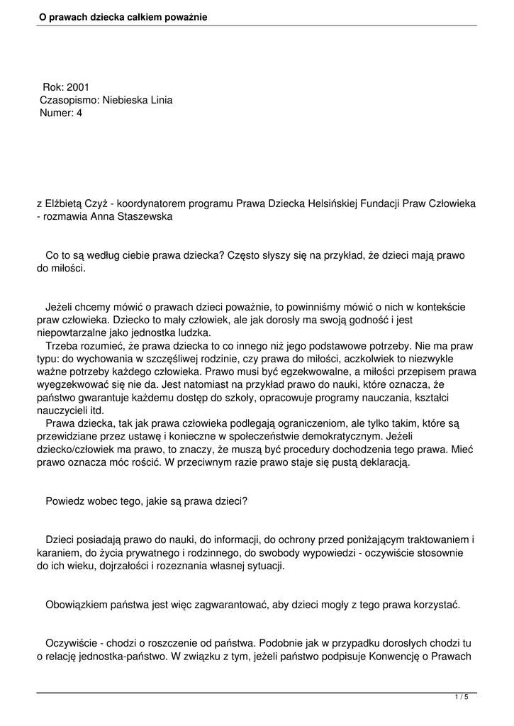 O prawach dziecka całkiem poważnie Rok: 2001 Czasopismo: Niebieska Linia Numer: 4 z Elżbietą Czyż - koordynatorem programu Prawa Dziecka Helsińskiej Fundacji Praw Człowieka - rozmawia Anna Staszewska Co to są według ciebie prawa dziecka? Często słyszy się na przykład, że dzieci mają prawo do miłości. Jeżeli chcemy mówić o prawach dzieci poważnie, to powinniśmy mówić o nich w kontekście praw człowieka. Dziecko to mały człowiek, ale jak dorosły ma swoją godność i jest niepowtarzalne jako jednostka ludzka. Trzeba rozumieć, że prawa dziecka to co innego niż jego podstawowe potrzeby. Nie ma praw typu: do wychowania w szczęśliwej rodzinie, czy prawa do miłości, aczkolwiek to niezwykle ważne potrzeby każdego człowieka. Prawo musi być egzekwowalne, a miłości przepisem prawa wyegzekwować się nie da. Jest natomiast na przykład prawo do nauki, które oznacza, że państwo gwarantuje każdemu dostęp do szkoły, opracowuje programy nauczania, kształci nauczycieli itd. Prawa dziecka, tak jak prawa człowieka podlegają ograniczeniom, ale tylko takim, które są przewidziane przez ustawę i konieczne w społeczeństwie demokratycznym. Jeżeli dziecko/człowiek ma prawo, to znaczy, że muszą być procedury dochodzenia tego prawa. Mieć prawo oznacza móc rościć. W przeciwnym razie prawo staje się pustą deklaracją. Powiedz wobec tego, jakie są prawa dzieci? Dzieci posiadają prawo do nauki, do informacji, do ochrony przed poniżającym traktowaniem i karaniem, do życia prywatnego i rodzinnego, do swobody wypowiedzi - oczywiście stosownie do ich wieku, dojrzałości i rozeznania własnej sytuacji. Obowiązkiem państwa jest więc zagwarantować, aby dzieci mogły z tego prawa korzystać. Oczywiście - chodzi o roszczenie od państwa. Podobnie jak w przypadku dorosłych chodzi tu o relację jednostka-państwo. W związku z tym, jeżeli państwo podpisuje Konwencję o Prawach 1/5 O prawach dziecka całkiem poważnie Dziecka, to przyjmuje na siebie zobowiązanie, że na rzecz dzieci będzie robiło to, do czego się zobowiązało. Jeżeli mówimy na przykład o prawach dziecka w rodzinie, to odnosimy je do zobowiązań państwa wobec dziecka, a nie do relacji rodzice-dzieci. Bo te relacje są bardzo osobiste. To przede wszystkim rodzice decydują o wychowaniu swoich dzieci, a państwo nie może się do tego wtrącać i dyktować im, według jakiego światopoglądu czy koncepcji wychowawczej mają to robić. Niektórzy mówią, że jak dzieci będą miały prawa, to zaczną występować przeciwko rodzicom. To oczywiście bzdura. Nie ma sprzeczności między prawami dzieci i prawami dorosłych. To, że prawa nie zależą od wykonywanych obowiązków, nie oznacza, że rodzice nie mogą ukarać dziecka, kiedy swoich obowiązków nie wykonuje. Jeżeli dzieci nie wykonują obowiązków, można je ukarać, na przykład nie dając nagrody czy pozbawiając przywilejów, ale nie praw. Wokół praw dziecka powstało wiele mitów. Myślę, że wynika to z braku wiedzy o tym, czym są prawa człowieka, a w tym prawa dziecka. Nie ma to nic wspólnego ze strategiami wychowawczymi, wychowaniem bezstresowym czy tzw. partnerskim. Można wychowywać dzieci surowo i konsekwentnie, szanując ich godność. Jeżeli matka daje klapsa dziecku, to nie znaczy, że łamie jego prawa. Jeżeli się znęca, nadużywa swojej rodzicielskiej władzy, a instytucje państwa nie ingerują, nie udzielają pomocy dziecku, wówczas można mówić, iż doszło do naruszenia praw dziecka. A jak jest z przestrzeganiem swobody wypowiedzi? Mówiąc o swobodzie wypowiedzi w przypadku dziecka, musimy uwzględnić możliwość rozeznania przez nie sytuacji. Na przestrzeni ostatnich lat, od ratyfikacji Konwencji o Prawach Dziecka, a potem po wejściu w życie nowej Konstytucji, w której nakazuje się wysłuchanie dziecka przed podjęciem decyzji w jego sprawie, sporo się zmieniło. Coraz częściej sędziowie chcą znać stanowisko dziecka, gdy podejmują decyzje dotyczące dziecka. Gorzej jest natomiast w szkołach czy placówkach opiekuńczych. Dobry nauczyciel lub wychowawca zawsze wysłucha dziecko, zawsze zainteresowany jest jego opinią czy poglądami, zachęca do samodzielnego, krytycznego myślenia. Gorszy woli, żeby uczeń wiernie odtwarzał jego opinie i wykonywał polecenia. A inne mity? 2/5 O prawach dziecka całkiem poważnie Kolejna rzecz to powiązanie praw z obowiązkami. Pedagodzy często twierdzą, że warunkiem posiadania przez dziecko praw jest wypełnianie obowiązków. Tak jakby tu był jakiś związek! Z punktu widzenia praw człowieka taka zależność nie istnieje. Jeżeli uczeń nie wypełnia obowiązków szkolnych, np. wagaruje, można mu zmniejszyć ocenę z zachowania, ale nie można odebrać prawa do ochrony przed poniżającym traktowaniem. Kiedy mówimy o uprawnieniach, które chcemy dziecku dać, to co innego. Ja mogę umówić się z moim dzieckiem, że dam mu kieszonkowe, jeśli posprząta swój pokój, pozmywa naczynia, wyniesie śmieci. I jeżeli ono nie spełni warunków, to ja mogę mu tę tygodniówkę odebrać. Ale to nie ma nic wspólnego z prawami człowieka. O czym jeszcze warto wspomnieć, kiedy mówimy o prawach dziecka? Inną kwestią jest system opieki, który w Polsce zmienia się niewystarczająco sprawnie. Chodzi głównie o dzieci przebywające w placówkach opiekuńczych i resocjalizacyjnych. Wiele praw tych dzieci jest w poważnym stopniu naruszanych. Na przykład bardzo często stosuje się zakaz lub ograniczenie kontaktów dziecka z rodzicami biologicznymi. Trwa dyskusja nad granicą pomiędzy karceniem dziecka a stosowaniem przemocy. To trudny problem. Intuicyjnie odróżniamy przysłowiowego klapsa od ciężkiego pobicia. Jeśli skarcę moje dziecko, dam mu lekkiego klapsa, dlatego, że uważam to za słuszną metodę wychowawczą, to nie znaczy, że sponiewierałam jego prawa. Natomiast jest wiele sytuacji, kiedy prokurator/sędzia musi