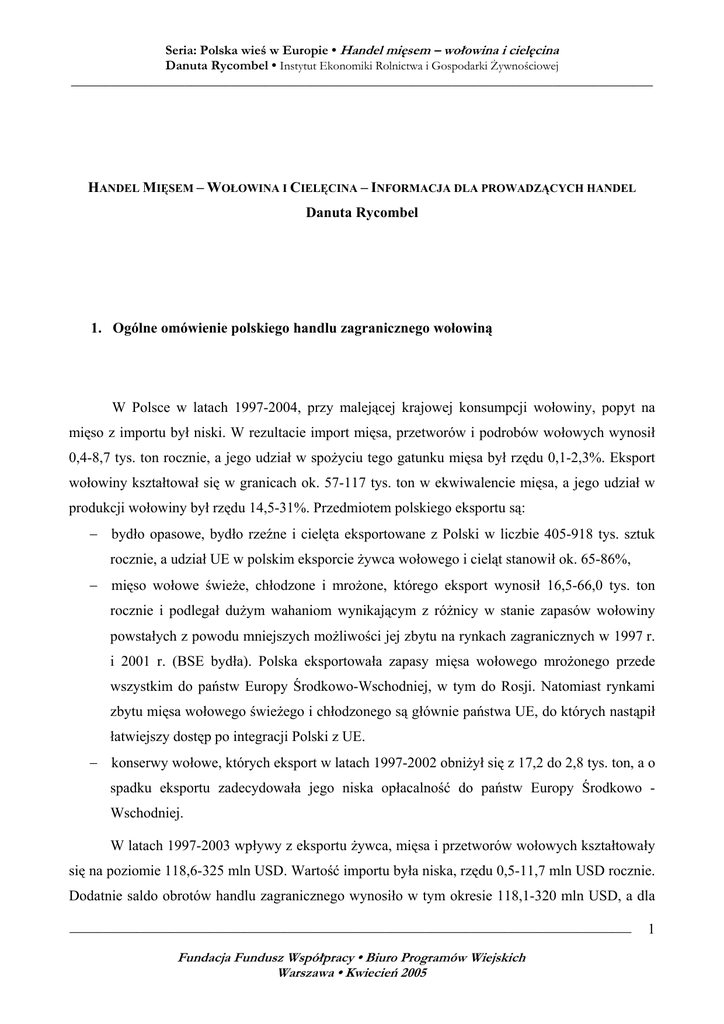 Seria: Polska wieś w Europie • Handel mięsem – wołowina i cielęcina Danuta Rycombel • Instytut Ekonomiki Rolnictwa i Gospodarki Żywnościowej _______________________________________________________________________________________ HANDEL MIĘSEM – WOŁOWINA I CIELĘCINA – INFORMACJA DLA PROWADZĄCYCH HANDEL Danuta Rycombel 1. Ogólne omówienie polskiego handlu zagranicznego wołowiną W Polsce w latach 1997-2004, przy malejącej krajowej konsumpcji wołowiny, popyt na mięso z importu był niski. W rezultacie import mięsa, przetworów i podrobów wołowych wynosił 0,4-8,7 tys. ton rocznie, a jego udział w spożyciu tego gatunku mięsa był rzędu 0,1-2,3%. Eksport wołowiny kształtował się w granicach ok. 57-117 tys. ton w ekwiwalencie mięsa, a jego udział w produkcji wołowiny był rzędu 14,5-31%. Przedmiotem polskiego eksportu są: − bydło opasowe, bydło rzeźne i cielęta eksportowane z Polski w liczbie 405-918 tys. sztuk rocznie, a udział UE w polskim eksporcie żywca wołowego i cieląt stanowił ok. 65-86%, − mięso wołowe świeże, chłodzone i mrożone, którego eksport wynosił 16,5-66,0 tys. ton rocznie i podlegał dużym wahaniom wynikającym z różnicy w stanie zapasów wołowiny powstałych z powodu mniejszych możliwości jej zbytu na rynkach zagranicznych w 1997 r. i 2001 r. (BSE bydła). Polska eksportowała zapasy mięsa wołowego mrożonego przede wszystkim do państw Europy Środkowo-Wschodniej, w tym do Rosji. Natomiast rynkami zbytu mięsa wołowego świeżego i chłodzonego są głównie państwa UE, do których nastąpił łatwiejszy dostęp po integracji Polski z UE. − konserwy wołowe, których eksport w latach 1997-2002 obniżył się z 17,2 do 2,8 tys. ton, a o spadku eksportu zadecydowała jego niska opłacalność do państw Europy Środkowo Wschodniej. W latach 1997-2003 wpływy z eksportu żywca, mięsa i przetworów wołowych kształtowały się na poziomie 118,6-325 mln USD. Wartość importu była niska, rzędu 0,5-11,7 mln USD rocznie. Dodatnie saldo obrotów handlu zagranicznego wynosiło w tym okresie 118,1-320 mln USD, a dla ____________________________________________________________________________________ Fundacja Fundusz Współpracy • Biuro Programów Wiejskich Warszawa • Kwiecień 2005 1 Seria: Polska wieś w Europie • Handel mięsem – wołowina i cielęcina Danuta Rycombel • Instytut Ekonomiki Rolnictwa i Gospodarki Żywnościowej _______________________________________________________________________________________ porównania dodatnie saldo obrotów wieprzowiną wynosiło 33-163 mln USD i wykazywało tendencję spadkową (rys. 1). Rys. 1 Dodatnie saldo obrotów handlu zagranicznego wieprzowiną i wołowiną w mln USD 350 300 Wieprzowina 250 Wołowina 200 150 100 50 0 1997 1998 1999 2000 2001 2002 2003 2004 Źródło: Obliczenia własne na podstawie danych CIHZ. 2. Zasady regulacji handlu zagranicznego wołowiną w Polsce Eksport W Polsce eksport wołowiny przed integracją z UE, podobnie jak szeregu innych artykułów rolno-spożywczych, nie podlegał subsydiowaniu. Niskie krajowe ceny skupu żywca wołowego umożliwiały realizację eksportu bez wsparcia finansowego ze strony budżetu państwa. Od maja 2004 r. wzrost cen wołowiny na rynku krajowym zmniejszył konkurencyjność polskiej wołowiny w eksporcie do państw WNP, ale polscy eksporterzy mogą ubiegać się o subsydia. Import Do maja 2004 r. od importu żywca, mięsa i przetworów wołowych pobierane były cła at valorem (wyrażone w %) w następującej wysokości: ____________________________________________________________________________________ Fundacja Fundusz Współpracy • Biuro Programów Wiejskich Warszawa • Kwiecień 2005 2 Seria: Polska wieś w Europie • Handel mięsem – wołowina i cielęcina Danuta Rycombel • Instytut Ekonomiki Rolnictwa i Gospodarki Żywnościowej _______________________________________________________________________________________ − bydło rzeźne 20%, − mięso wołowe świeże, chłodzone, mrożone 45%, − konserwy wołowe 40%. W wyniku integracji Polski z UE obowiązuje taryfa celna UE na żywiec, mięso i przetwory wołowe oraz preferencje celne, w tym zasady importu w kwocie WTO. Cła pobierane od wołowiny importowanej z państw nie należących do UE będą odprowadzane do budżetu Wspólnoty. 3. Ogólna informacja o handlu wołowiną w UE 3a. Obroty wewnętrzne W UE w wyniku zróżnicowanej samowystarczalności w produkcji wołowiny państw członkowskich dużą rolę odgrywają obroty wewnętrzne. W latach 2000-2003 eksport wołowiny realizowany w obrębie państw członkowskich był rzędu 1,6-2 mln ton rocznie, a jej import kształtował się na zbliżonym poziomie. Uczestnictwo Polski we wzajemnej wymianie handlowej wymagało dostosowania podmiotów rynkowych przede wszystkim do: − jednakowej klasyfikacji tusz wołowych zgodnej z normą EUROP oraz ich oznakowania, które umożliwiają porównanie jakości produkowanej wołowiny oraz cen między państwami członkowskimi, − jednakowej klasyfikacji żywca wołowego według klasyfikacji europejskiej, − obowiązkowego systemu rejestracji i identyfikacji bydła, − standardów sanitarnych i weterynaryjnych obowiązujących w UE i przepisów o ochronie środowiska naturalnego. Dotyczy to zarówno przemysłu mięsnego oraz gospodarstw produkujących żywiec wołowy i cielęcy. W chowie bydła niezbędne jest dostosowanie budynków gospodarskich do warunków technicznych określonych przepisami w zakresie oświetlenia, wentylacji a zwłaszcza wyposażenia w urządzenia do odprowadzania ścieków, zabezpieczenia obornika i kiszonek, tak aby nie powodowały skażenia środowiska. Obornik nie może być gromadzony na polu. W pomieszczeniach inwentarskich musi być przechowywany w gnojownikach lub na nieprzepuszczalnych płytach. Wycieki z kiszonek muszą być odprowadzane do studzienek. Wymagania dotyczące przechowywania obornika