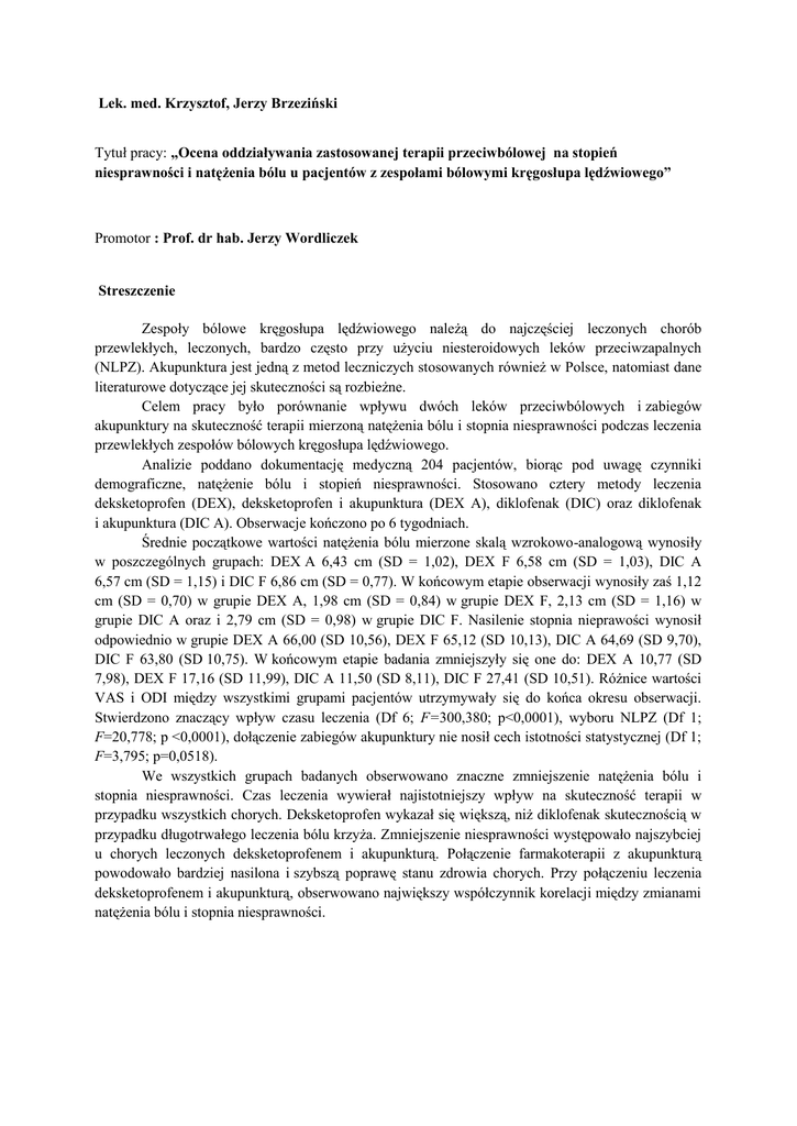 Lek. med. Krzysztof, Jerzy Brzeziński Tytuł pracy: „Ocena oddziaływania zastosowanej terapii przeciwbólowej na stopień niesprawności i natężenia bólu u pacjentów z zespołami bólowymi kręgosłupa lędźwiowego” Promotor : Prof. dr hab. Jerzy Wordliczek Streszczenie Zespoły bólowe kręgosłupa lędźwiowego należą do najczęściej leczonych chorób przewlekłych, leczonych, bardzo często przy użyciu niesteroidowych leków przeciwzapalnych (NLPZ). Akupunktura jest jedną z metod leczniczych stosowanych również w Polsce, natomiast dane literaturowe dotyczące jej skuteczności są rozbieżne. Celem pracy było porównanie wpływu dwóch leków przeciwbólowych i zabiegów akupunktury na skuteczność terapii mierzoną natężenia bólu i stopnia niesprawności podczas leczenia przewlekłych zespołów bólowych kręgosłupa lędźwiowego. Analizie poddano dokumentację medyczną 204 pacjentów, biorąc pod uwagę czynniki demograficzne, natężenie bólu i stopień niesprawności. Stosowano cztery metody leczenia deksketoprofen (DEX), deksketoprofen i akupunktura (DEX A), diklofenak (DIC) oraz diklofenak i akupunktura (DIC A). Obserwacje kończono po 6 tygodniach. Średnie początkowe wartości natężenia bólu mierzone skalą wzrokowo-analogową wynosiły w poszczególnych grupach: DEX A 6,43 cm (SD = 1,02), DEX F 6,58 cm (SD = 1,03), DIC A 6,57 cm (SD = 1,15) i DIC F 6,86 cm (SD = 0,77). W końcowym etapie obserwacji wynosiły zaś 1,12 cm (SD = 0,70) w grupie DEX A, 1,98 cm (SD = 0,84) w grupie DEX F, 2,13 cm (SD = 1,16) w grupie DIC A oraz i 2,79 cm (SD = 0,98) w grupie DIC F. Nasilenie stopnia nieprawości wynosił odpowiednio w grupie DEX A 66,00 (SD 10,56), DEX F 65,12 (SD 10,13), DIC A 64,69 (SD 9,70), DIC F 63,80 (SD 10,75). W końcowym etapie badania zmniejszyły się one do: DEX A 10,77 (SD 7,98), DEX F 17,16 (SD 11,99), DIC A 11,50 (SD 8,11), DIC F 27,41 (SD 10,51). Różnice wartości VAS i ODI między wszystkimi grupami pacjentów utrzymywały się do końca okresu obserwacji. Stwierdzono znaczący wpływ czasu leczenia (Df 6; F=300,380; p<0,0001), wyboru NLPZ (Df 1; F=20,778; p <0,0001), dołączenie zabiegów akupunktury nie nosił cech istotności statystycznej (Df 1; F=3,795; p=0,0518). We wszystkich grupach badanych obserwowano znaczne zmniejszenie natężenia bólu i stopnia niesprawności. Czas leczenia wywierał najistotniejszy wpływ na skuteczność terapii w przypadku wszystkich chorych. Deksketoprofen wykazał się większą, niż diklofenak skutecznością w przypadku długotrwałego leczenia bólu krzyża. Zmniejszenie niesprawności występowało najszybciej u chorych leczonych deksketoprofenem i akupunkturą. Połączenie farmakoterapii z akupunkturą powodowało bardziej nasilona i szybszą poprawę stanu zdrowia chorych. Przy połączeniu leczenia deksketoprofenem i akupunkturą, obserwowano największy współczynnik korelacji między zmianami natężenia bólu i stopnia niesprawności. Abstract Assessment of the impact of analgesic therapy on the degree of disability and pain intensity in patients with low back pain Low back pain is among the most common chronic diseases, often treated with non-steroidal anti-inflammatory drugs (NSAIDs). Acupuncture is one of the treatment methods used in Poland, but the literature data on its effectiveness are unequivocal. The aim of this study was to compare the effects of two analgesic drugs and acupuncture on the efficacy of treatments, measured by pain intensity and degree of disability during treatment of low back chronic pain. Medical records of 204 patients were analyzed, taking into account demographic factors, pain intensity and degree of disability. Four methods of treatment were used: i) dexketoprofen (DEX - F), ii) dexketoprofen combined with acupuncture (DEX - A), iii) diclofenac (DIC - F), and iv) diclofenac combined with acupuncture (DIC - A). Observations were finished and analyzed after 6 weeks of treatment. The mean values of initial pain intensity measured by visual-analogue scale (VAS) equalled DEX - A 6.43 (SD = 1.02), DEX - F 6.58 (SD = 1.03), DIC - A 6.57 (SD = 1.15) and DIC - F 6.86 (SD = 0.77). In the final stage of the observations, they were 1.12 (SD = 0.70) in the DEX - A group, 1.98 (SD = 0.84) in the DEX - F group, 2.13 (SD = 1.16) in DIC - A group and 2.79 (SD = 0.98) in group DIC - F. Initially, the degree of severity of disability measured by the Oswestry Disability Index (ODI) was 66.00 (SD = 10.56) in DEX - A group, 65.12 (SD = 10.13) in DEX - F group, 64.69 (SD = 9.70) in DIC - A group, and 63.80 (SD = 10.75) in DIC - F group. In the final stage of the study, they decreased to 10.77 (SD = 7.98) in DEX - A group, 17.16 (SD = 11.99) in DEX - F group, 11.50 (SD = 8.11) in DIC - A group, and 27.41 (SD =10.51) in DIC - F group. Differences in VAS and ODI values among all the groups of patients persisted until the end of the observation period. A significant effect of time of treatment (Df 6, F = 300.38, p <0.0001) and the choice of NSAIDs (Df 1, F = 20.778, p <0.0001) on treatment effectiveness was found, whereas the inclusion of acupuncture did not reach statistical significance (Df 1, F = 3.795, p = 0.0518). A significant reduction in pain intensity and degree of disability was observed in all the treatment groups. The duration of treatment exerted the most significant impact on the effectiveness of therapy for all patients. Dexketoprofen showed greater efficacy than diclofenac in the treatment of chronic low back pain. Reduction of disability took place the fastest in patients treated with dexketoprofen and acupuncture. The combination of pharmacotherapy with acupuncture caused more pronounced and faster improvement in the patients’ health status. The largest correlation between changes in pain intensity and the degree of disability was observed for the combination of acupuncture and dexketoprofen therapy.