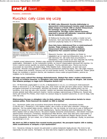Kuczko: cały czas się uczę - Onet.pl Sport - 20.03.2007 http://sport.onet.pl/0,1248748,1505560,druk_wiadomosc.html Pływanie - wiadomości Kuczko: cały czas się uczę PAP /08:40 W 2005 roku Sławomir Kuczko debiutując w pływackich mistrzostwach świata zajął znakomite piąte miejsce w finale 200 m stylem klasycznym. Do tamtego wyścigu ma jednak duŜe zastrzeŜenia. Od tego czasu rekord Ŝyciowy poprawił o ponad pół sekundy i znacznie zbliŜył się do światowej czołówki. W Melbourne Kuczkę stać na walkę o medal na tym dystansie. Sam jest bardzo ostroŜny i mówi tylko, Ŝe powinien popłynąć lepiej niŜ w Montrealu. Dwa lata temu debiutował Pan w mistrzostwach świata. Piąte miejsce na 200 m stylem klasycznym było znakomitym wynikiem. Wspomina Pan czasami tamten wyścig? Sławomir Kuczko. Pięć złotych medali polskich pływaków wywalczonych podczas ME na długim basenie w Budapeszcie. AFP Sławomir Kuczko: Jak wróciliśmy do Polski to oglądałem go co najmniej kilkanaście razy, bo to był taki domowy hit. Jak tylko ktoś przychodził w odwiedziny i miał chwilę to od razu włączało się wyścig i siadało przed telewizorem. Miałem więc okazję do solidnego przeanalizowania tego jak popłynąłem. Widziałem, Ŝe źle rozłoŜyłem tempo, za mocno rozpocząłem pierwsze sto metrów i to mnie w jakimś sensie zgubiło na ostatniej długości. Trochę zabrakło pary. MoŜna się trochę przyczepić do nawrotów, do dopłynięcia. Kilka błędów było. Zobaczyłem, Ŝe jest nad czym pracować. Wnioski wyciągnąłem i w Melbourne powinienem popłynąć lepiej. Ale i tak piąte miejsce jak na debiut było świetne, wszyscy byli ze mnie bardzo dumni. Ja zresztą z siebie teŜ. Potem jakoś długo nie myślałem o tamtym starcie, ale niedawno znowu sobie przypomniałem, pewnie ze względu na te mistrzostwa. Od tego czasu nabrał Pan duŜego doświadczenia. Zdobył Pan złoto i srebro mistrzostw Europy na krótkim basenie, w ubiegłym roku tytuł mistrza Europy na długim. Jak ocenia Pan własne postępy w ciągu tych niespełna dwóch lat? S.K.: W Montrealu popłynąłem 2.12,44, w Budapeszcie 2.12,12, a w zimowych mistrzostwach Polski w Gorzowie 2.11,78. Postęp więc jest, choć moŜe nie taki jak bym sobie Ŝyczył. Staram się porządnie pracować na treningach, słucham się trenera. Wiem, Ŝe bez cięŜkiej pracy nie ma wyników, a ja chcę się cały czas rozwijać. Jestem teŜ bardziej doświadczony niŜ w Montrealu. Po drodze jednak było kilka waŜnych imprez i tamte występy zaprocentują w Melbourne. Nawet taki starty jak Grand Prix Polski, choć moŜe nie zawsze stoją na wysokim poziomie, to coś mi dają. Cały czas się uczę. Mistrzostwo Europy w ubiegłym roku to duŜy sukces. Ale mistrzostwa świata to nieco wyŜsza półka. Pana faworyci do medali na 200 m Ŝabką? S.K.: Numerem jeden jest oczywiście Amerykanin Brendan Hansen, rekordzista świata (2.09,04-red.). Powalczyć z nim będzie cięŜko, ale w końcu to jest tylko człowiek i moŜna go pokonać. TeŜ ma jakieś słabe strony, słabsze dni. Ale nie mówię, Ŝe mnie się to uda w Melbourne! Chodzi mi raczej o to, Ŝe nikt nie jest niepokonany. Oprócz Hansena jest Australijczyk Jim Piper, który będzie miał za sobą trybuny. Na pewno będzie strasznie zmotywowany. Jest dwóch mocnych Japończyków Imamura i Yonehara, Kanadyjczyk Mike Brown, który dwa lata temu miał srebro. Z Europy dochodzą Włosi Bossini i Facci. Znowu świetnie zaczął pływać Węgier Daniel Gyurta. Jest trochę chłopaków. Po tym widać, Ŝe w finale będzie bardzo cięŜko coś popłynąć. Myślę, Ŝe powinien się zamknąć w 2.12. Na start na 200 m będzie Pan musiał trochę poczekać. Na początek będzie 100 m Ŝabką. Jakie oczekiwania w związku z tym dystansem? S.K.: Szczerze mówiąc to nawet nie patrzyłem w jakiej kolejności będę pływał. Dla mnie to tak naprawdę nie jest waŜne. Pamiętam, Ŝe dwa lata temu najpierw płynąłem setkę. Wiadomo, Ŝe to 1 of 2 2007-03-20 10:14 Kuczko: cały czas się uczę - Onet.pl Sport - 20.03.2007 http://sport.onet.pl/0,1248748,1505560,druk_wiadomosc.html słabszy dystans, więc mogłem go traktować jako przetarcie przed głównym startem. Ale równie dobrze mógłbym zaczynać od dwusetki. Dla mnie to naprawdę bez róŜnicy. Jak będę dobrze przygotowany to zrobię dobre wyniki i na 100 i na 200 metrów. Być moŜe popłynę jeszcze 50 metrów, ale o tym zdecydujemy dosłownie w ostatniej chwili. Przyjedziemy sporo wcześniej, więc będzie czas na aklimatyzację. Basen teŜ będziemy mogli wcześniej sprawdzić. Wiem co chciałbym osiągnąć na tych mistrzostwach i wynikowo i miejscowo, ale trzymam to dla siebie. Zdradzę po startach. Proszę powiedzieć trochę o przygotowaniach. S.K.: Były trochę niezwykłe. Zaczęliśmy zaraz po wakacjach. Najpierw trzeba było przygotować się do kwalifikacji na Melbourne, którymi były listopadowe mistrzostwa Polski. Niektórzy mówili, Ŝe te zawody nie były potrzebne, Ŝe zaburzyły przygotowania, ale przecieŜ trzeba było jakoś wyłonić kadrę na mistrzostwa świata. Potem zaczęły się juŜ cięŜsze treningi. Sporo pływaliśmy w Ostrowcu Świętokrzyskim, było zgrupowanie na Florydzie i wreszcie w Brisbane. NajcięŜej było w styczniu, na początku lutego, kiedy robiliśmy strasznie duŜo objętości, duŜo siły. Ale tak trzeba. Teraz daję radę, ale pamiętam jak w 2003 roku pojechałem na pierwsze zgrupowanie kadry do Pretorii to na basenie pływałem za wszystkimi, na kaŜdym treningu myślałem, Ŝe ducha wyzionę i odliczałem dni do końca. Tak naprawdę teraz było mało czasu na przygotowania, bo mistrzostwa juŜ w marcu. Ale wszyscy mają taki sam termin i trzeba trafić z formą na marzec. Dwa lata temu jechał Pan do Montrealu jako jeden z wielu mniej znanych polskich pływaków. Teraz jest Pan jedną z gwiazd reprezentacji. Czy w związku z tym stres będzie większy? S.K.: