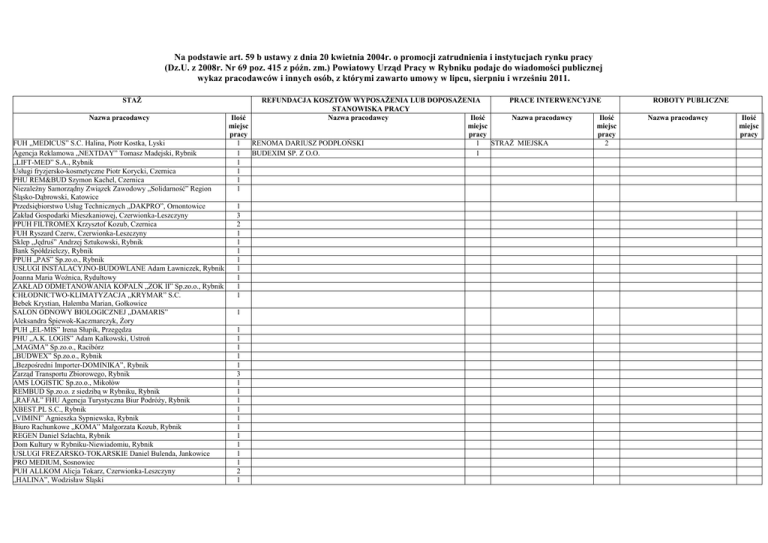 Na podstawie art. 59 b ustawy z dnia 20 kwietnia 2004r. o promocji zatrudnienia i instytucjach rynku pracy (Dz.U. z 2008r. Nr 69 poz. 415 z późn. zm.) Powiatowy Urząd Pracy w Rybniku podaje do wiadomości publicznej wykaz pracodawców i innych osób, z którymi zawarto umowy w lipcu, sierpniu i wrześniu 2011. STAŻ Nazwa pracodawcy FUH „MEDICUS” S.C. Halina, Piotr Kostka, Lyski Agencja Reklamowa „NEXTDAY” Tomasz Madejski, Rybnik „LIFT-MED” S.A., Rybnik Usługi fryzjersko-kosmetyczne Piotr Korycki, Czernica PHU REM&BUD Szymon Kachel, Czernica Niezależny Samorządny Związek Zawodowy „Solidarność” Region Śląsko-Dąbrowski, Katowice Przedsiębiorstwo Usług Technicznych „DAKPRO”, Ornontowice Zakład Gospodarki Mieszkaniowej, Czerwionka-Leszczyny PPUH FILTROMEX Krzysztof Kozub, Czernica FUH Ryszard Czerw, Czerwionka-Leszczyny Sklep „Jędruś” Andrzej Sztukowski, Rybnik Bank Spółdzielczy, Rybnik PPUH „PAS” Sp.zo.o., Rybnik USŁUGI INSTALACYJNO-BUDOWLANE Adam Ławniczek, Rybnik Joanna Maria Woźnica, Rydułtowy ZAKŁAD ODMETANOWANIA KOPALŃ „ZOK II” Sp.zo.o., Rybnik CHŁODNICTWO-KLIMATYZACJA „KRYMAR” S.C. Bebek Krystian, Halemba Marian, Gołkowice SALON ODNOWY BIOLOGICZNEJ „DAMARIS” Aleksandra Śpiewok-Kaczmarczyk, Żory PUH „EL-MIS” Irena Słupik, Przegędza PHU „A.K. LOGIS” Adam Kalkowski, Ustroń „MAGMA” Sp.zo.o., Racibórz „BUDWEX” Sp.zo.o., Rybnik „Bezpośredni Importer-DOMINIKA”, Rybnik Zarząd Transportu Zbiorowego, Rybnik AMS LOGISTIC Sp.zo.o., Mikołów REMBUD Sp.zo.o. z siedzibą w Rybniku, Rybnik „RAFAŁ” FHU Agencja Turystyczna Biur Podróży, Rybnik XBEST.PL S.C., Rybnik „VIMINI” Agnieszka Sypniewska, Rybnik Biuro Rachunkowe „KOMA” Małgorzata Kozub, Rybnik REGEN Daniel Szlachta, Rybnik Dom Kultury w Rybniku-Niewiadomiu, Rybnik USŁUGI FREZARSKO-TOKARSKIE Daniel Bulenda, Jankowice PRO MEDIUM, Sosnowiec PUH ALLKOM Alicja Tokarz, Czerwionka-Leszczyny „HALINA”, Wodzisław Śląski REFUNDACJA KOSZTÓW WYPOSAŻENIA LUB DOPOSAŻENIA PRACE INTERWENCYJNE STANOWISKA PRACY Ilość Nazwa pracodawcy Ilość Nazwa pracodawcy Ilość miejsc miejsc miejsc pracy pracy pracy 1 RENOMA DARIUSZ PODPŁOŃSKI 1 STRAŻ MIEJSKA 2 1 BUDEXIM SP. Z O.O. 1 1 1 1 1 1 3 2 1 1 1 1 1 1 1 1 1 1 1 1 1 1 3 1 1 1 1 1 1 1 1 1 1 2 1 ROBOTY PUBLICZNE Nazwa pracodawcy Ilość miejsc pracy NZOZ Roman Spandel S.C., Wodzisław Śląski „STARMAGENI” PPHU Sławomir J. Dusza, Stanowice Przedsiębiorstwo Geodezyjne „PRYZMAT”, Rybnik Rybnickie Przedsiębiorstwo Budownictwa Drogowego S.A., Rybnik „FIJAŁKOWSKI” Stanisław Fijałkowski, Rybnik FIRMA HANDLOWA „AdeH” A. Buchalik, H. Nowrot S.C., Rybnik Koch Maria Restauracja „MAGNOLIA”, Rybnik „BARTMED” Sp.C., Jastrzębie Zdrój Firma „KOMPLEX” Szymon Broża, Jankowice PH „TUREK” Agnieszka Turek, Rybnik Zespół Szkół Ekonomiczno Usługowych, Rybnik BACARS Bartosz Gigla, Rybnik Zespół Szkół nr 3, Rybnik Piekarnia S.C. Pośpiech Amalia, Pośpiech Marian, Pośpiech Piotr, Rybnik Izabela Buba, Żory Biuro Rachunkowe Stańczyk Magdalena Żelazko, Rybnik „Montex” Instalacje wod-kan, co i gaz, Rybnik FHU „HOLECZKI”, Ksiażenice Ośrodek Pomocy Społecznej, Rybnik Przedszkole nr 31, Rybnik „BOY” PUH, Rybnik Poradnia Psychologiczno-Pedagogiczna, Czerwionka-Leszczyny Cukiernia u Janusza Łukasz Ciecior, Rybnik PUH „Koniczynka” S.C., Rybnik AGMAR Agnieszka Wojewódka, Czerwionka-Leszczyny Pracownia Protetyczna Dominika Ruszkiewicz, Rybnik Zarząd Zieleni Miejskiej, Rybnik Oddział Instytutu Pamięci Narodowej Komisji Ścigania Zbrodni przeciwko Narodowi Polskiemu, Katowice Zakład Przetwórstwa Mięsnego Łukosz S.J., Jaworze Zespół Szkolno-Przedszkolny nr 4, Rybnik Zespół Szkół Specjalnych, Rybnik Salon Fryzjerski damsko-męski Wolny Ilona, Jankowice „OPAL” FHU, Rybnik „CARO” Elżbieta Mnich, Rybnik Przychodnia Weterynaryjna Krzysztof Szwarc, Oliwier Sobik S.J., Żory Urząd Gminy Świerklany, Jankowice JSW SA Kopalnia Węgla Kamiennego „Borynia-Zofiówka”, Jastrzębie-Zdrój INVEST-COM Anna Żydek, Rybnik Rybnicka Agencja Wydawnicza Adam Ryszka, Rybnik APTEKA „CHWAŁOWICE” S.C. mgr farm. Elżbieta Ociepka, mgr farm. Jan Ociepka, Rybnik Przedszkole nr 19, Rybnik Spółdzielnia Mieszkaniowa RYF, Rybnik „POLSKAPRESSE” Sp.zo.o., Sosnowiec EL-VOLT Bogdan Lerch, Rybnik Urząd Gminy i Miasta Czerwionka-Leszczyny 1 1 2 1 3 1 1 1 1 1 1 1 1 1 1 1 1 1 1 1 1 1 1 1 1 1 11 1 22 1 2 1 3 1 1 1 1 1 1 1 3 1 1 1 1 MIRKOP Mirosław Hajduk, Rybnik Restauracja „KASSANDRA” S.C., Rybnik Przedszkole z Oddziałami Integracyjnymi nr 17 im. Jana Brzechwy, Rybnik Studio Stylizacji Fryzur Jadwiga Musioł, Rybnik Przedszkole nr 14 im. Janusza Korczaka, Rybnik Przedszkole nr 20, Rybnik „S.C. Biuro-Net”, Bełk „Akademia Ciała” Gabinet Kosmetyczny, Rydułtowy Przedsiębiorstwo Wodociągów i Kanalizacji Sp.zo.o., Rybnik Anna Holesz, Rybnik FUH Zbigniew Strzelec, Mikołów Zakład Ogólnobudowlany Malarstwo-Tapeciarstwo Marian Adamczyk, Rybnik Śląska Wojewódzka Komenda OHP, Katowice „OLSZEWSCY” Sp.zo.o., Rybnik Firma „WIZES”, Rybnik Bezpośredni Importer DOMINIKA, Rybnik „USŁUGOWIEC” Sp.zo.o., Łuków Śląski Przedsiębiorstwo „KACPEREK”, Pawłowice Archiwum Państwowe w Katowicach, Katowice Piekarnia Klimas Rafał, Orzesze FHU „MARSEL”, Bełk „APOTHECA PACIS” Kasza S.J., Rybnik Kancelaria Doradztwa Podatkowego Agnieszka Bogdańska, Rybnik Straż Miejska, Rybnik „REMONTEX” Sp.zoo.o., Rybnik Klub Malucha „Baśniowa Kraina” Ewa Studzińska, Stanowice Zakład Gospodarki Komunalnej i Mieszkaniowej w Pszowie „SPOŁEM” PSS w Czerwionce-Leszczynach Prokuratura Rejonowa, Rybnik Handel Drobiem Kurt-Detal Jeziorowski i S-ka B.G. Jeziorowski S.J., Szczejkowice Szymura Piotr – Blacharstwo Samochodowe, Gaszowice Piotr Drewniak ART., Żory PHU BEJAR Barbara Dziadek, Jankowice „ABRA” Wojciech Zdziebło S.J., Żory 