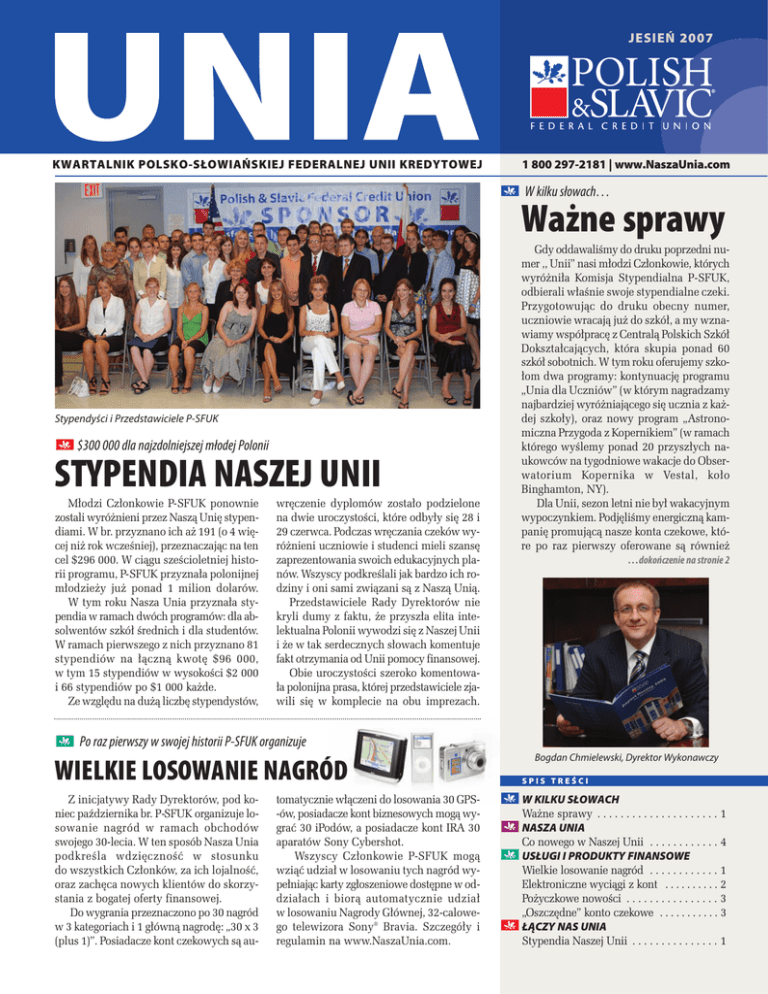 JeSieŃ 2007 KWArtALNiK pOLSKO-SŁOWiAŃSKieJ FeDerALNeJ UNii KreDYtOWeJ 1 800 297-2181 | www.NaszaUnia.com W kilku słowach… Ważne sprawy Stypendyści i Przedstawiciele P-SFUK $300 000 dla najzdolniejszej młodej Polonii STYPENDIA NASZEJ UNII Młodzi Członkowie P-SFUK ponownie zostali wyróżnieni przez Naszą Unię stypendiami. W br. przyznano ich aż 191 (o 4 więcej niż rok wcześniej), przeznaczając na ten cel $296 000. W ciągu sześcioletniej historii programu, P-SFUK przyznała polonijnej młodzieży już ponad 1 milion dolarów. W tym roku Nasza Unia przyznała stypendia w ramach dwóch programów: dla absolwentów szkół średnich i dla studentów. W ramach pierwszego z nich przyznano 81 stypendiów na łączną kwotę $96 000, w tym 15 stypendiów w wysokości $2 000 i 66 stypendiów po $1 000 każde. Ze względu na dużą liczbę stypendystów, wręczenie dyplomów zostało podzielone na dwie uroczystości, które odbyły się 28 i 29 czerwca. Podczas wręczania czeków wyróżnieni uczniowie i studenci mieli szansę zaprezentowania swoich edukacyjnych planów. Wszyscy podkreślali jak bardzo ich rodziny i oni sami związani są z Naszą Unią. Przedstawiciele Rady Dyrektorów nie kryli dumy z faktu, że przyszła elita intelektualna Polonii wywodzi się z Naszej Unii i że w tak serdecznych słowach komentuje fakt otrzymania od Unii pomocy finansowej. Obie uroczystości szeroko komentowała polonijna prasa, której przedstawiciele zjawili się w komplecie na obu imprezach. Gdy oddawaliśmy do druku poprzedni numer ,, Unii” nasi młodzi Członkowie, których wyróżniła Komisja Stypendialna P-SFUK, odbierali właśnie swoje stypendialne czeki. Przygotowując do druku obecny numer, uczniowie wracają już do szkół, a my wznawiamy współpracę z Centralą Polskich Szkół Dokształcających, która skupia ponad 60 szkół sobotnich. W tym roku oferujemy szkołom dwa programy: kontynuację programu „Unia dla Uczniów” (w którym nagradzamy najbardziej wyróżniającego się ucznia z każdej szkoły), oraz nowy program „Astronomiczna Przygoda z Kopernikiem” (w ramach którego wyślemy ponad 20 przyszłych naukowców na tygodniowe wakacje do Obserwatorium Kopernika w Vestal, koło Binghamton, NY). Dla Unii, sezon letni nie był wakacyjnym wypoczynkiem. Podjęliśmy energiczną kampanię promującą nasze konta czekowe, które po raz pierwszy oferowane są również …dokończenie na stronie 2 Po raz pierwszy w swojej historii P-SFUK organizuje WIELKIE LOSOWANIE NAGRÓD Z inicjatywy Rady Dyrektorów, pod koniec października br. P-SFUK organizuje losowanie nagród w ramach obchodów swojego 30-lecia. W ten sposób Nasza Unia podkreśla wdzięczność w stosunku do wszystkich Członków, za ich lojalność, oraz zachęca nowych klientów do skorzystania z bogatej oferty finansowej. Do wygrania przeznaczono po 30 nagród w 3 kategoriach i 1 główną nagrodę: „30 x 3 (plus 1)”. Posiadacze kont czekowych są au- tomatycznie włączeni do losowania 30 GPS-ów, posiadacze kont biznesowych mogą wygrać 30 iPodów, a posiadacze kont IRA 30 aparatów Sony Cybershot. Wszyscy Członkowie P-SFUK mogą wziąć udział w losowaniu tych nagród wypełniając karty zgłoszeniowe dostępne w oddziałach i biorą automatycznie udział w losowaniu Nagrody Głównej, 32-calowego telewizora Sony® Bravia. Szczegóły i regulamin na www.NaszaUnia.com. Bogdan Chmielewski, Dyrektor Wykonawczy SpiS treŚci W KILKU SŁOWACH Ważne sprawy . . . . . . . . . . . . . . . . . . . . . 1 NASZA UNIA Co nowego w Naszej Unii . . . . . . . . . . . . 4 USŁUGI I PRODUKTY FINANSOWE Wielkie losowanie nagród . . . . . . . . . . . . 1 Elektroniczne wyciągi z kont . . . . . . . . . . 2 Pożyczkowe nowości . . . . . . . . . . . . . . . . 3 „Oszczędne” konto czekowe . . . . . . . . . . . 3 ŁĄCZY NAS UNIA Stypendia Naszej Unii . . . . . . . . . . . . . . . 1 UNiA JeSieŃ 2007 Ważne sprawy … dokończenie ze strony 1 osobom nie posiadającym numeru Social Security. Nowością jest też możliwość otwarcia konta czekowego przez telefon dzwoniąc pod bezpłatny numer 1-800-297-2181. Nasze „oszczędne” konta czekowe, które, jak nazwa wskazuje, pozwalają naszym Członkom zaoszczędzić na wielu opłatach pobieranych przez inne banki, cieszyły się w sierpniu ogromnym zainteresowaniem. Inną inicjatywą są obchody 30-lecia Unii Kredytowej. Z tej okazji, zamiast tradycyjnego bankietu i przemówień, proponujemy Członkom losowanie 30 atrakcyjnych nagród w 3 kategoriach plus losowanie nagrody głównej, 32-calowego telewizora SONY Bravia. O szczegółach losowania zostali już Państwo poinformowani w polonijnej prasie, naszych oddziałach i na naszej stronie internetowej. Zapewne zauważyli też Państwo, że wraz z nadejściem lata w oddziałach Unii pojawiły się monitory, a zniknęły tablice, na których kiedyś naklejaliśmy „procenty”. Teraz te „procenty” można odczytać z ekranów telewizyjnych, co dla wszystkich jest ogromnym ułatwieniem, zwłaszcza, że przedstawiamy je po polsku. Jest to tym bardziej istotne, że obecnie nasze oferty dotyczące wielu produktów finansowych, a szczególnie tych, które dotyczą pożyczek, zmieniają się niemalże codziennie. Wracając do podsumowania mijającego lata, chciałbym poinformować Państwa o wyborze głównego wykonawcy budowy naszego oddziału na Maspeth. Została nim renomowana firma „Chester Contracting Corp.”, której właścicielem jest pan Czesław Konarzewski. Jest on naszym długoletnim Członkiem i dobrze zna naszą instytucję. Budowa Tak będzie wyglądał nowy oddział P-SFUK na Maspeth. nowego oddziału na Maspeth rozpocznie się w najbliższych tygodniach. Jeżeli chodzi o sam finał okresu letniego, to przypadł on na uroczystości w Amerykańskiej Częstochowie, gdzie na początku września braliśmy udział w 42 Dorocznym Festiwalu Polsko-Amerykańskim, organizowanym, jak co roku, przez Ojców Pa