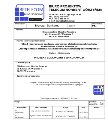 BIURO PROJEKTÓW TELECOM NORBERT GÓRZYŃSKI 09–402 PŁOCK ul. 3go Maja 12/ 68 TEL. (024) 366 40 48 FAX (024) 366 40 48 e-mail: [email protected] Umowa Nr Pracownia: Branża: Sanitarna Egz. nr TZ- Obiekt: Ministerstwo Skarbu Państwa ul. Krucza 36/Wspólna 6 00-522 Warszawa Nazwa i adres opracowania: Układ rezerwowego zasilania serwerowni zlokalizowanych budynku Ministerstwa Skarbu Państwa pn. „Zabezpieczenie zasilania dla kluczowej infrastruktury informatycznej”. Stadium – Rodzaj pracy PROJEKT BUDOWLANY I WYKONAWCZY Zamawiający: Ministerstwo Skarbu Państwa ul. Krucza 36/Wspólna 6 00-522 Warszawa Zawartość opracowania: Projekt Budowlano Wykonawczy branży Sanitarnej TOM 2 cz.1 instalacje sanitarne pomieszczenia agregatu Data opracowania: LISTOPAD 2014 r. Rozdzielnik: Zamawiający Archiwum BP Uwagi: Stanowisko: br. Sanitarna br. Sanitarna Imię i nazwisko mgr inż. Dorota Jasińska mgr inż. Joanna Kucznerowicz Nr. upr. Data: WKP/0379/PWOS/11 20.11.2014 WKP/0139/POOS/09 20.11.2014 Podpis 5 egz. 1 egz. 1 OŚWIADCZENIE -------------------------------------------------------------------------------------- 3 1.1 Oświadczenie Projektanta ---------------------------------------------------------------------------------------------------------------- 3 1.2 Uprawnienia---------------------------------------------------------------------------------------------------------------------------------- 4 2 PODSTAWA OPRACOWANIA --------------------------------------------------------------------- 8 2.1 Wytyczne inwestora: ---------------------------------------------------------------------------------------------------------------------- 9 2.2 Przedmiot opracowania ----------------------------------------------------------------------------------------------------------------- 10 3 OPRACOWANIE PROJEKTOWE W ZAKRESIE SANITARNYM ---------------------------- 11 3.1 Założenia projektowe -------------------------------------------------------------------------------------------------------------------- 11 3.2 Przedmiot opracowania ----------------------------------------------------------------------------------------------------------------- 11 3.3 Opis ogólny --------------------------------------------------------------------------------------------------------------------------------- 11 3.3.1 Wentylacja pomieszczenia agregatu prądotwórczego ---------------------------------------------------------------------- 11 3.3.2 Odprowadzenie spalin z agregatu prądotwórczego ------------------------------------------------------------------------- 12 3.3.3 Wytyczne dla branży elektrycznej ------------------------------------------------------------------------------------------------ 13 3.3.4 Wytyczne dla branży budowlanej: ------------------------------------------------------------------------------------------------ 13 3.3.5 UWAGI do części instalacyjnej: ---------------------------------------------------------------------------------------------------- 13 3.3.6 --------------------------------------------------------------------------------------------------------------------------------------------------- 14 4 UWAGI ----------------------------------------------------------------------------------------------- 14 4.1 Klauzula opracowania ------------------------------------------------------------------------------------------------------------------- 14 4.2 Odbiory techniczne----------------------------------------------------------------------------------------------------------------------- 15 4.3 Końcowe uwagi---------------------------------------------------------------------------------------------------------------------------- 17 5 ZESTAWIENIE MATERIAŁÓW ------------------------------------------------------------------ 18 6 SPIS RYSUNKÓW ---------------------------------------------------------------------------------- 19 2 1 1.1 Oświadczenie Oświadczenie Projektanta Warszawa dn. 20.11.2014 r. Oświadczam, że Układ rezerwowego zasilania serwerowni zlokalizowanych budynku Ministerstwa Skarbu Państwa pn. „Zabezpieczenie zasilania dla kluczowej infrastruktury informatycznej”. w zakresie branży sanitarnej został wykonany zgodnie z obowiązującymi przepisami i zasadami wiedzy technicznej. Projektował: mgr inż. Dorota Jasińska ………………………………… Sprawdził: mgr inż. Joanna Kucznerowicz ………………………………… Inwestycja: Ministerstwo Skarbu Państwa ul. Krucza 36/Wspólna 6 00-522 Warszawa Inwestor: Ministerstwo Skarbu Państwa ul. Krucza 36/Wspólna 6 00-522 Warszawa Wykonawca: Biuro Projektowe TELECOM Norbert Górzyński 09- 402 Płock ul. 3 go Maja 12 lokal 68 3 1.2 Uprawnienia 4 5 6 7 2 Podstawa opracowania a) b) c) d) e) f) - - - - - - - Projekt Budowlano- wykonawczy został wykonany na podstawie: zawartej umowy pomiędzy Ministerstwem Skarbu Państwa w Warszawie a Biurem Projektowym TELECOM w Płocku Założeń technicznych przekazanych przez zamawiającego Planów architektoniczno-budowlanych; Warunków technicznych systemu zasilacza UPS Warunków technicznych agregatu prądotwórczego Obowiązujących norm i przepisów: Ustawa Prawo Budowlane z dnia 07.07.1994 ( j. t. Dz. U. Nr 243, poz. 1623 z 2010r z późn. zm.) Ustawa z dnia 07.06.2001 o zbiorowym zaopatrzeniu w wodę i zbiorowym odprowadzeniu ścieków (j.t. Dz. U. nr 123, poz. 858 z 2006 r z późn. zm.), oraz przepisy wykonawcze: Rozporządzenie Ministra Infrastruktury z dnia 12.04.2002 (Dz. U. Nr 75 poz. 690 wraz z późniejszymi zmianami) w sprawie warunków technicznych, jakim powinny odpowiadać budynki i ich usytuowanie z późniejszymi zmianami, Rozporządzenie Ministra Spraw Wewnętrznych i Administracji z dnia 7. 06. 2010 (Dz. U. Nr 109 poz. 719) w sprawie ochrony przeciwpożarowej budynków, innych obiektów budowlanych i terenów, Rozporządzenie Ministra Pracy i Polityki Socjalnej z dnia 4 sierpnia 2011r zmieniające rozporządzenie w sprawie og