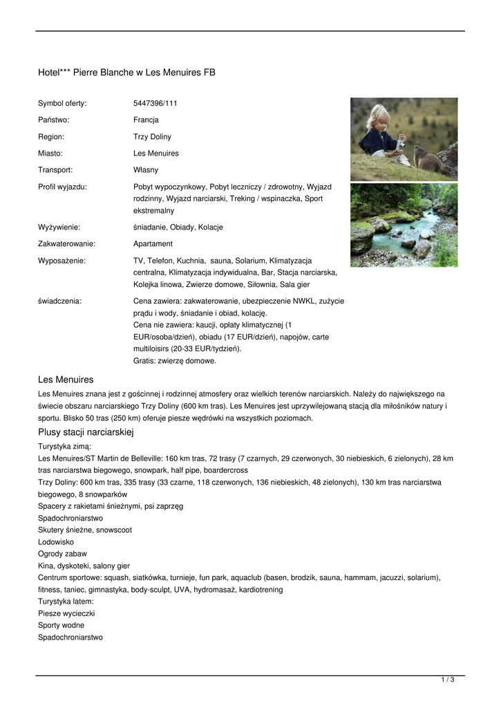 Hotel*** Pierre Blanche w Les Menuires FB Symbol oferty: 5447396/111 Państwo: Francja Region: Trzy Doliny Miasto: Les Menuires Transport: Własny Profil wyjazdu: Pobyt wypoczynkowy, Pobyt leczniczy / zdrowotny, Wyjazd rodzinny, Wyjazd narciarski, Treking / wspinaczka, Sport ekstremalny Wyżywienie: śniadanie, Obiady, Kolacje Zakwaterowanie: Apartament Wyposażenie: TV, Telefon, Kuchnia, sauna, Solarium, Klimatyzacja centralna, Klimatyzacja indywidualna, Bar, Stacja narciarska, Kolejka linowa, Zwierze domowe, Siłownia, Sala gier świadczenia: Cena zawiera: zakwaterowanie, ubezpieczenie NWKL, zużycie prądu i wody, śniadanie i obiad, kolację. Cena nie zawiera: kaucji, opłaty klimatycznej (1 EUR/osoba/dzień), obiadu (17 EUR/dzień), napojów, carte multiloisirs (20-33 EUR/tydzień). Gratis: zwierzę domowe. Les Menuires Les Menuires znana jest z gościnnej i rodzinnej atmosfery oraz wielkich terenów narciarskich. Należy do największego na świecie obszaru narciarskiego Trzy Doliny (600 km tras). Les Menuires jest uprzywilejowaną stacją dla miłośników natury i sportu. Blisko 50 tras (250 km) oferuje piesze wędrówki na wszystkich poziomach. Plusy stacji narciarskiej Turystyka zimą: Les Menuires/ST Martin de Belleville: 160 km tras, 72 trasy (7 czarnych, 29 czerwonych, 30 niebieskich, 6 zielonych), 28 km tras narciarstwa biegowego, snowpark, half pipe, boardercross Trzy Doliny: 600 km tras, 335 trasy (33 czarne, 118 czerwonych, 136 niebieskich, 48 zielonych), 130 km tras narciarstwa biegowego, 8 snowparków Spacery z rakietami śnieżnymi, psi zaprzęg Spadochroniarstwo Skutery śnieżne, snowscoot Lodowisko Ogrody zabaw Kina, dyskoteki, salony gier Centrum sportowe: squash, siatkówka, turnieje, fun park, aquaclub (basen, brodzik, sauna, hammam, jacuzzi, solarium), fitness, taniec, gimnastyka, body-sculpt, UVA, hydromasaż, kardiotrening Turystyka latem: Piesze wycieczki Sporty wodne Spadochroniarstwo 1/3 Jazda konna Hotel Hotel*** Pierre Blanche znajduje się u stóp tras, 200 m od wyciągów narciarskich i 100 m od galerii handlowej, w części najbardziej słonecznej w stacji, idealny dla rodzin. Do dyspozycji jest taras, bar i bilard. Apartamenty Wszystkie apartamenty znajdują się w 2 budynkach, w większości są to pokoje rodzinne, z balkonem na południe. Restauracja i bufet oferują specjalności kuchni alpejskiej. Wszystkie apartamenty wyposażone są w: łazienkę z wanną, WC, TV, telefon bezpośredni. Kategoria 1: ekspozycja pd, pd-zach., balkon. Kategoria 2: ekspozycja PN, bez balkonu. Do dyspozycji Sauna Siłownia Recepcja z sejfem Dojazd Pociąg: dworzec w Moutiers, TGV. Navette do Les Menuires. Samolot: lotnisko w Chambery, następnie skibus (100 km), Lyon ST Exupery (180 km), Genewa (145 km). TERMINY: od: 2017-06-17 do: 2017-06-24 (8 dni), miejsca: zamów cena od: 1312 PLN = 301 EUR od: 2017-06-17 do: 2017-07-01 (15 dni), miejsca: zamów cena od: 3661 PLN = 840 EUR od: 2017-06-24 do: 2017-07-01 (8 dni), miejsca: zamów cena od: 2349 PLN = 539 EUR od: 2017-06-24 do: 2017-07-08 (15 dni), miejsca: zamów cena od: 4698 PLN = 1078 EUR od: 2017-07-01 do: 2017-07-08 (8 dni), miejsca: zamów cena od: 2349 PLN = 539 EUR od: 2017-07-01 do: 2017-07-15 (15 dni), miejsca: zamów cena od: 4698 PLN = 1078 EUR od: 2017-07-08 do: 2017-07-15 (8 dni), miejsca: zamów cena od: 2349 PLN = 539 EUR od: 2017-07-08 do: 2017-07-22 (15 dni), miejsca: zamów cena od: 4698 PLN = 1078 EUR od: 2017-07-15 do: 2017-07-22 (8 dni), miejsca: zamów cena od: 2349 PLN = 539 EUR od: 2017-07-15 do: 2017-07-29 (15 dni), miejsca: zamów cena od: 4698 PLN = 1078 EUR od: 2017-07-22 do: 2017-07-29 (8 dni), miejsca: zamów cena od: 2349 PLN = 539 EUR od: 2017-07-22 do: 2017-08-05 (15 dni), miejsca: zamów cena od: 4698 PLN = 1078 EUR od: 2017-07-29 do: 2017-08-05 (8 dni), miejsca: zamów cena od: 2349 PLN = 539 EUR od: 2017-07-29 do: 2017-08-12 (15 dni), miejsca: zamów cena od: 4698 PLN = 1078 EUR od: 2017-08-05 do: 2017-08-12 (8 dni), miejsca: zamów cena od: 2349 PLN = 539 EUR od: 2017-08-05 do: 2017-08-19 (15 dni), miejsca: zamów cena od: 4393 PLN = 1008 EUR od: 2017-08-12 do: 2017-08-19 (8 dni), miejsca: zamów cena od: 2044 PLN = 469 EUR CENNIK: Długość pobytu: 8 dni 15 dni 8 dni 15 dni 8 dni Grupa cenowa: A A C B B 7 14 7 14 7 644 532 1204 602 (-) (-) (-) (-) 542 429 962 481 Ubezpieczenie (do wyboru) (*) ubezpieczenie NWKLSKI Rodzaj osoby (do wyboru) osoba dorosła w apartamencie 3-osobowym kat. 1 322 dziecko 0-3 lat (-) dziecko 4-11 lat w apartamencie 3-osobowym kat. 1 271 2/3 osoba dorosła w apartamencie 2-osobowym kat. 2 322 osoba dorosła w pokoju 1-osobowym 504 osoba dorosła w apartamencie 2-osobowym kat. 1 364 dziecko 4-11 lat w apartamencie 4-osobowym kat. 1 250 (*) osoba dorosła w apartamencie 4-osobowym kat. 1 294 Ubezpieczenie (opcjonalne) ubezpieczenie od kosztów rezygnacji 2.4 % 644 560 1260 630 1008 812 1764 882 728 602 1344 672 500 376 858 429 588 462 1064 532 2.4 % 2.4 % 2.4 % 2.4 % Waluta: EUR Aktualne ceny z systemu S.A.R.T. (-) - cena usługi, podatku kalkulowana przy osobie lub gratis (*) - kwota wliczona w cenę standardową 3/3