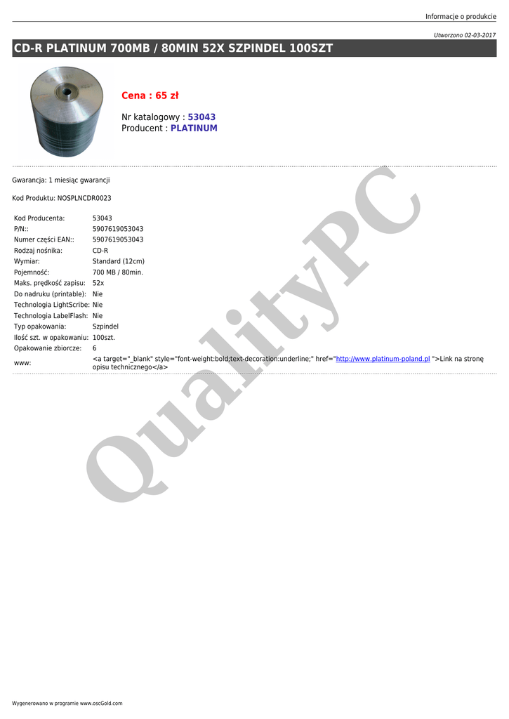 Informacje o produkcie Utworzono 02-03-2017 CD-R PLATINUM 700MB / 80MIN 52X SZPINDEL 100SZT Cena : 65 zł Nr katalogowy : 53043 Producent : PLATINUM Gwarancja: 1 miesiąc gwarancji 53043 P/N:: 5907619053043 Numer części EAN:: 5907619053043 Rodzaj nośnika: CD-R Wymiar: Standard (12cm) Pojemność: 700 MB / 80min. Maks. prędkość zapisu: 52x Do nadruku (printable): Nie Technologia LightScribe: Nie Typ opakowania: ua lit Technologia LabelFlash: Nie yP Kod Producenta: C Kod Produktu: NOSPLNCDR0023 Szpindel Ilość szt. w opakowaniu: 100szt. Opakowanie zbiorcze: <a target="_blank" style="font-weight:bold;text-decoration:underline;" href="http://www.platinum-poland.pl ">Link na stronę opisu technicznego</a> Q www: 6 Wygenerowano w programie www.oscGold.com