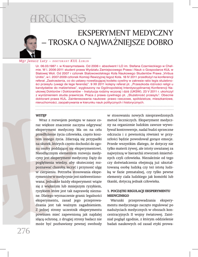 ARTICLES EKSPERYMENT MEDYCZNY – TROSKA O NAJWAŻNIEJSZE DOBRO Mg r Janusz L ut y – dok tor ant K UL L u b l i n Ur. 06.03.1987 r. w Krasnymstawie. Od 2006 r. absolwent I LO im. Stefana Czarnieckiego w Chełmie. W l. 2006-2011 student prawa Wydziału Zamiejscowego Prawa i Nauk o Gospodarce KUL w Stalowej Woli. Od 2007 r członek Stalowowolskiego Koła Naukowego Studentów Prawa „Viribus Unitis”, w l. 2007-2009 członek Komisji Rewizyjnej tegoż Koła. 18 IV 2011 przedłożył na konferencji referat „Zastrzeżenia, co do ustawy nowelizującej kodeks cywilny w zakresie ratio legis służebności przesyłu (uwagi de lege ferenda)”. 9 XII 2011 kolejny referat pt. „Przeszkoda różności religii u kandydatów do małżeństwa”, wygłoszony na Ogólnopolskiej Interdyscyplinarnej Konferencji Naukowej Doktorów i Doktorantów – Instytucja rodziny wczoraj i dziś (UKSW). 23 V 2011 r. ukończył z wyróżnieniem studia prawnicze. Praca z prawa cywilnego pt. „Służebność przesyłu”. Obecnie doktorant prawa KUL. Zainteresowania naukowe: prawo rzeczowe, spółdzielcze, mieszkaniowe, nieruchomości, zaopatrywania w kierunku nauk politycznych i historycznych. 276 Wstęp Wraz z rozwojem postępu w nauce coraz większe znaczenie zaczyna odgrywać eksperyment medyczny. Ma on na celu przedłużenie życia człowieka, często kosztem innego życia. Zdarzają się przypadki na skutek, których często dochodzi do zgonu osoby poddającej się eksperymentowi. Nieodłącznym elementem rozwoju medycyny jest eksperyment medyczny. Dąży do pogłębienia wiedzy, aby skuteczniej rozpoznawać choroby, leczyć i przynosić ulgę w cierpieniu. Potrzeba stosowania eksperymentów w medycynie jest niekwestionowana. Jednakże każdy eksperyment wiąże się z większym lub mniejszym ryzykiem, ryzykiem które jest tak naprawdę nieznane. Dlatego wyznaczenie granic legalności eksperymentu, zasad jego przeprowadzania jest tak ważnym zagadnieniem. Z jednej strony uczestnik eksperymentu powinien mieć zapewnioną jak najdalej idącą ochronę, z drugiej strony badacz nie może być pozbawiony pewnej swobody w stosowaniu nowych niesprawdzonych metod leczniczych. Eksperyment medyczny na organizmie ludzkim zawsze wywoływał kontrowersje, nadal budzi sprzeczne odczucia i z pewnością również w przyszłości będzie powodował gorące emocje. Przede wszystkim dlatego, że dotyczy nie tylko materii żywej, ale istoty uważanej za najwyższą w hierarchii stworzeń śmiertelnych czyli człowieka. Niezależnie od tego czy doświadczenia obejmują już ukształtowaną osobę ludzką czy też istotę ludzką w fazie prenatalnej, czy tylko pewne elementy ciała ludzkiego jak komórki lub tkanki, dotyczą jednak człowieka. 1. Początki regulacji eksperymentu medycznego Warunki przeprowadzania eksperymentu medycznego zaczęto regulować po nadużyciach medycznych w obozach koncentracyjnych II wojny światowej. Zaistniał pogląd zgodnie, z którym oddzielenie badań naukowych od zasad etyki prowa- ARTYKUŁY dzi do powstania zbrodni. Konsekwencją procesu zbrodniarzy wojennych (w tym 23 lekarzy) było uchwalenie Kodeksu Norymberskiego (1947) zawierającego m.in. dziesięć podstawowych zasad dopuszczalności doświadczeń na ludziach. Zasady te polegały na tym, że: pacjent musi wyrazić zgodę na eksperyment medyczny1, ma mieć zagwarantowaną możliwość jej cofnięcia na każdym etapie badań, zabieg musi być celowy i potrzebny, dobrze przygotowany, eksperymenty na człowieku powinny poprzedzać próby na zwierzętach, musi być całkowicie zagwarantowane bezpieczeństwo osoby poddającej się eksperymentowi, nie może zaistnieć narażenie na śmierć lub kalectwo, ryzyko badań powinno być rekompensowane wartością wyników, badania muszą być też prowadzone przez prawdziwych specjalistów, wzrost zagrożenia musi prowadzić do przerwania eksperymentu2. Unormowania te w skutek rozwoju nauki okazały się niewystarczające, pojawiły się kolejne kodyfikacje. Najbardziej powszechną stała się deklaracja helsińska (1964) oraz jej następne modyfikacje (m.in. Tokio 1954, Wenecja 1983, Hongkong 1989, Somerset 1996), w ramach Zjednoczonej Europy od 1997 roku obowiązuje Good Clinical Practice for Trials oraz Wytyczne i zalecenia dla europejskich 1 komisji etycznych (1995). Priorytetowym kryterium badań naukowych pozostaje zawsze dobro człowieka, a nie tylko dobro ludzkości, wymaga się dlatego rezygnacji z badań, które pozostają z nimi w kolizji. Są to m.in. badania uwłaczające godności, szkodzące człowiekowi lub uniemożliwiające integralny rozwój. Eksperyment medyczny w pierwszej kolejności musi mieć na celu poszanowanie godności człowieka i nienaruszalności jego życia. Musi stać w zgodności z prawem moralnym3. Deklaracja helsińska wprowadziła rozróżnienie eksperymentu medycznego ze względów na cel. Wyróżniła eksperyment kliniczny – prowadzony dla uzyskania bezpośredniej korzyści dla zdrowia chorego oraz eksperyment naukowo-badawczy mający na celu rozszerzenie wiedzy medycznej4. 2. Prawne uregulowanie eksperymentu medycznego Problematyka związana z eksperymentem medycznym dokonywanym na ludziach zawarta jest w wielu dokumentach międzynarodowych. Międzynarodowy Pakt Praw Obywatelskich i Politycznych5 zabrania przeprowadzania eksperymentów medycznych i naukowych bez dobrowolnej zgody osoby uczestniczącej. Inne akty stanowią zalecenia do stosowania w określonych państwach, są wzorcem M. Kośmicki, Uświadomiona zgoda chorego na udział w eksperymencie medycznym, w: Pacjent u schyłku XX wieku, Kielce 1997, s. 38 i n. Zob. również: E. Klee, Auschwitz. Medycyna III Rzeszy i jej ofiary, Kraków 2001. 2 Zob. szerzej: S. Kornas, Współczesne eksperymenty medyczne w ocenie etyki katolickiej, Częstochowa 1986. 3 K. Szczęsny, Godność człowieka jako zasadnicze kryterium oceny etycznej eksperymentu medycznego, Sosno- wieckie Studia Teologiczne 1995, nr 2 s. 1