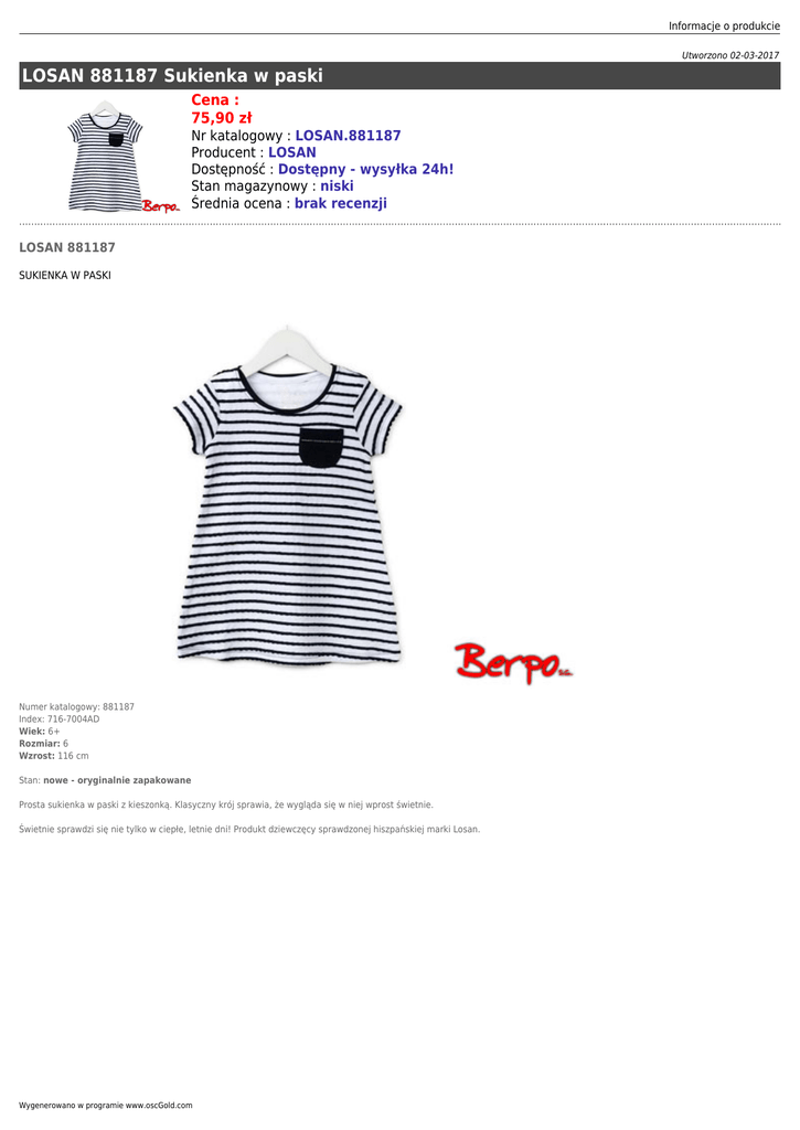 Informacje o produkcie Utworzono 02-03-2017 LOSAN 881187 Sukienka w paski Cena : 75,90 zł Nr katalogowy : LOSAN.881187 Producent : LOSAN Dostępność : Dostępny - wysyłka 24h! Stan magazynowy : niski Średnia ocena : brak recenzji LOSAN 881187 SUKIENKA W PASKI Numer katalogowy: 881187 Index: 716-7004AD Wiek: 6+ Rozmiar: 6 Wzrost: 116 cm Stan: nowe - oryginalnie zapakowane Prosta sukienka w paski z kieszonką. Klasyczny krój sprawia, że wygląda się w niej wprost świetnie. Świetnie sprawdzi się nie tylko w ciepłe, letnie dni! Produkt dziewczęcy sprawdzonej hiszpańskiej marki Losan. Wygenerowano w programie www.oscGold.com Informacje o produkcie Dostępność w salonach: Ilość: Sklep - Złotniki: 1 Sklep - zlikwidowany: 0 Sklep - Szczepankowo: 0 Dostępne opcje LOSAN 881187 Sukienka w paski » Wiek: 5 - 7 lat. Wygenerowano w programie www.oscGold.com