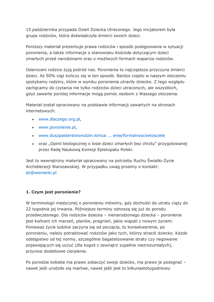 15 października przypada Dzień Dziecka Utraconego. Jego inicjatorem była grupa rodziców, która doświadczyła śmierci swoich dzieci. Poniższy materiał prezentuje prawa rodziców i sposób postępowania w sytuacji poronienia, a także informacje o stanowisku Kościoła dotyczącym dzieci zmarłych przed narodzinami oraz o możliwych formach wsparcia rodziców. Osieroceni rodzice żyją pośród nas. Poronienia to najczęstsza przyczyna śmierci dzieci. Aż 50% ciąż kończy się w ten sposób. Bardzo często w naszym otoczeniu spotykamy rodziny, które w wyniku poronienia utraciły dziecko. Z tego względu zachęcamy do czytania nie tylko rodziców dzieci utraconych, ale wszystkich, gdyż zawarte poniżej informacje mogą pomóc osobom z Waszego otoczenia. Materiał został opracowany na podstawie informacji zawartych na stronach internetowych: www.dlaczego.org.pl, www.poronienie.pl, www.duszpasterstworodzin.lomza ... enie/formalnosciwkosciele oraz „Opinii teologicznej o losie dzieci zmarłych bez chrztu” przygotowanej przez Radę Naukową Komisji Episkopatu Polski. Jest to wewnętrzny materiał opracowany na potrzeby Ruchu Światło-Życie Archidiecezji Warszawskiej. W przypadku uwag prosimy o kontakt: [email protected] 1. Czym jest poronienie? W terminologii medycznej o poronieniu mówimy, gdy dochodzi do utraty ciąży do 22 tygodnia jej trwania. Późniejsze terminy odnoszą się już do porodu przedwczesnego. Dla rodziców dziecka – nienarodzonego dziecka – poronienie jest końcem ich marzeń, planów, pragnień, jakie wiązali z nowym życiem. Ponieważ życie ludzkie zaczyna się od poczęcia, to konsekwentnie, po poronieniu, należy potraktować rodziców jako tych, którzy stracili dziecko. Każde odstępstwo od tej normy, szczególnie bagatelizowanie straty czy negowanie pojawiających się uczuć (dla kogoś z zewnątrz zupełnie niezrozumiałych), przynosi dodatkowe cierpienie. Po porodzie kobieta ma prawo zobaczyć swoje dziecko, ma prawo je pożegnać – nawet jeśli urodziło się martwe, nawet jeśli jest to kilkunastotygodniowy wcześniaczek. Dziecko nie przypomina wtedy takiej pyzy z reklamy, ale jest jedyne i niepowtarzalne, zaś pożegnanie z dzieckiem jest koniecznym elementem żałoby. Jeśli decyzja o braku takiego pożegnania nastąpiła z woli kobiety nikt nie ma prawa oceniać jej decyzji, jeśli jednak była ona wynikiem szoku bądź też (co gorsza) pożegnanie zostało kobiecie odmówione przez personel medyczny (klasyczne: „będzie pani bardziej cierpiała”) wtedy brak takiego pożegnania z dzieckiem znacząco utrudnia kobiecie przeżycie i zakończenie żałoby. Pożegnanie może być tylko dotknięciem główki, przytuleniem. Jeśli wiadomo, że dziecko może umrzeć zaraz po porodzie można poprosić o chrzest z wody. 2. Jakie są prawa rodziców? Obecna sytuacja prawna jest jasna: rodzice mają prawo odebrać ciało dziecka i pochować je, bez względu na czas trwania ciąży. Wątpliwości ostatecznie rozstrzygnęło rozporządzenie ministra zdrowia z dnia 21 grudnia 2006 r. zmieniające rozporządzenie w sprawie postępowania ze zwłokami i szczątkami ludzkimi, w którym stwierdzono, że za zwłoki uważa się ciała osób zmarłych i dzieci martwo urodzonych, bez względu na czas trwania ciąży. 1. Macie prawo do rejestracji dziecka w Urzędzie Stanu Cywilnego. Szpital wystawia w takiej sytuacji tzw. pisemne zgłoszenie urodzenia dziecka. Przysługuje ono każdemu dziecku, bez względu na czas zakończenia ciąży. W USC otrzymasz wtedy skrócony akt urodzenia dziecka z adnotacją, że urodziło się martwo. Aktu zgonu nie sporządza się. Akt urodzenia z odpowiednią adnotacją jest jednocześnie aktem zgonu. 2. Prawo do rejestracji dotyczy także tych dzieci, które zostały poronione/urodzone w domu. 3. Prawo do rejestracji dziecka w USC dotyczy także dzieci, które zostały poronione/urodzone poza granicami Polski, nawet jeśli państwo, w którym doszło do poronienia/porodu prawo to ogranicza np. ze względu na długość trwania ciąży. 4. Matka ma prawo do urlopu macierzyńskiego (lub zasiłku macierzyńskiego, jeśli przebywa na urlopie wychowawczym). W przypadku narodzin martwego dziecka kobiecie przysługuje 8 tygodni urlopu. W pracy należy przedstawić skrócony odpis aktu urodzenia dziecka. Nie ma potrzeby składania zaświadczenia lekarskiego o odbytym porodzie (urodzeniu). 5. Macie prawo do pochowania dziecka (jego ciała czy szczątków), bez względu na czas zakończenia ciąży. Szpital wydaje wtedy Kartę Zgonu. Dokument ten potrzebny jest na cmentarzu, aby pochować dziecko. 6. Macie prawo do uzyskania zasiłku pogrzebowego – bez względu na czas zakończenia ciąży. W ZUS-ie należy przedstawić dokumenty potwierdzające prawo do świadczeń oraz akt zgonu. W sytuacji, gdy akt zgonu nie został sporządzony (dziecko urodziło się martwo) przedstawia się akt urodzenia z adnotacją o martwych narodzinach. 7. W szpitalu macie prawo do uzyskania informacji. Macie prawo, jak każdy pacjent, do uzyskania dokumentacji medycznej. 3. Jak postępować w sytuacji straty dziecka? Jeśli rodzice dowiadują się w szpitalu, że ich dziecko zmarło, warto od razu zastrzec chęć odbioru jego ciała; pozwoli to uniknąć sytuacji, w której szpital zniszczy ciało dziecka bez ich wiedzy. Rodzice mogą je odebrać ze szpitala za pośrednictwem firmy pogrzebowej. Niezależnie od długości trwania ciąży, pracownik szpitala powinien wystawić pisemne zgłoszenie urodzenia martwego dziecka. Szpital ma obowiązek przekazać zgłoszenie do USC w terminie 3 dni lub może wydać je rodzicom do ręki. Wówczas mają oni także 3 dni od narodzin na złożenie pisma w USC. Dokument ten nie jest dokumentacją medyczną, dlatego nie ma w nim zastosowania rozróżnienie na poronienie i poród przedwczesny. W świetle prawa polskiego są to zawsze narodziny martwego dziecka. Przy wypełnianiu zgłoszenia urodzenia martwego dziec