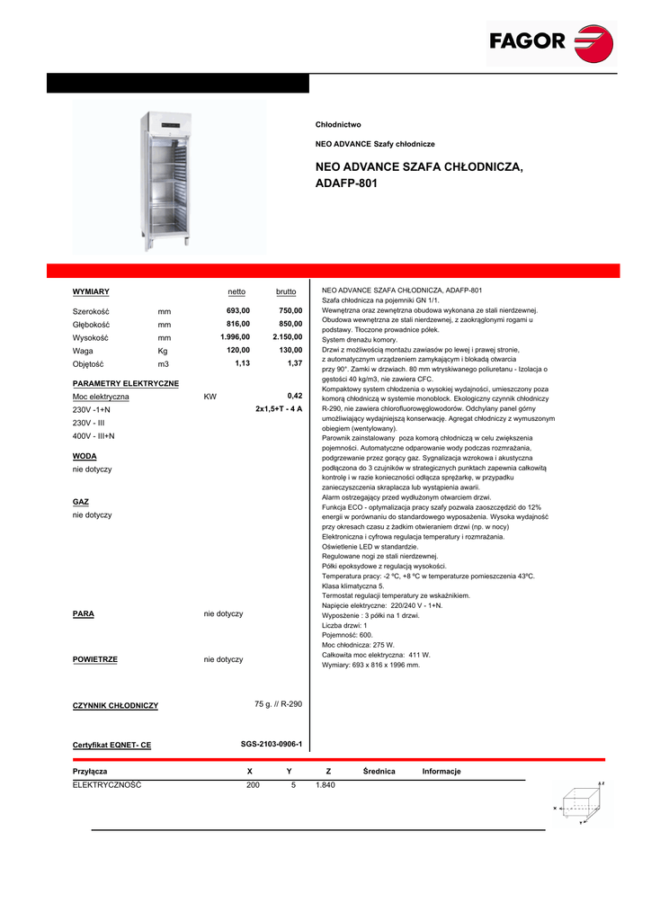 Chłodnictwo NEO ADVANCE Szafy chłodnicze NEO ADVANCE SZAFA CHŁODNICZA, ADAFP-801 netto WYMIARY brutto Szerokość mm 693,00 Głębokość mm 816,00 850,00 Wysokość mm 1.996,00 2.150,00 Waga Kg 120,00 130,00 Objętość m3 1,13 1,37 750,00 PARAMETRY ELEKTRYCZNE Moc elektryczna 0,42 KW 2x1,5+T - 4 A 230V -1+N 230V - III 400V - III+N WODA nie dotyczy GAZ nie dotyczy PARA nie dotyczy POWIETRZE nie dotyczy 75 g. // R-290 CZYNNIK CHŁODNICZY Certyfikat EQNET- CE NEO ADVANCE SZAFA CHŁODNICZA, ADAFP-801 Szafa chłodnicza na pojemniki GN 1/1. Wewnętrzna oraz zewnętrzna obudowa wykonana ze stali nierdzewnej. Obudowa wewnętrzna ze stali nierdzewnej, z zaokrąglonymi rogami u podstawy. Tłoczone prowadnice półek. System drenażu komory. Drzwi z możliwością montażu zawiasów po lewej i prawej stronie, z automatycznym urządzeniem zamykającym i blokadą otwarcia przy 90°. Zamki w drzwiach. 80 mm wtryskiwanego poliuretanu - Izolacja o gęstości 40 kg/m3, nie zawiera CFC. Kompaktowy system chłodzenia o wysokiej wydajności, umieszczony poza komorą chłodniczą w systemie monoblock. Ekologiczny czynnik chłodniczy R-290, nie zawiera chlorofluorowęglowodorów. Odchylany panel górny umożliwiający wydajniejszą konserwację. Agregat chłodniczy z wymuszonym obiegiem (wentylowany). Parownik zainstalowany poza komorą chłodniczą w celu zwiększenia pojemności. Automatyczne odparowanie wody podczas rozmrażania, podgrzewanie przez gorący gaz. Sygnalizacja wzrokowa i akustyczna podłączona do 3 czujników w strategicznych punktach zapewnia całkowitą kontrolę i w razie konieczności odłącza sprężarkę, w przypadku zanieczyszczenia skraplacza lub wystąpienia awarii. Alarm ostrzegający przed wydłużonym otwarciem drzwi. Funkcja ECO - optymalizacja pracy szafy pozwala zaoszczędzić do 12% energii w porównaniu do standardowego wyposażenia. Wysoka wydajność przy okresach czasu z żadkim otwieraniem drzwi (np. w nocy) Elektroniczna i cyfrowa regulacja temperatury i rozmrażania. Oświetlenie LED w standardzie. Regulowane nogi ze stali nierdzewnej. Półki epoksydowe z regulacją wysokości. Temperatura pracy: -2 ºC, +8 ºC w temperaturze pomieszczenia 43ºC. Klasa klimatyczna 5. Termostat regulacji temperatury ze wskaźnikiem. Napięcie elektryczne: 220/240 V - 1+N. Wyposżenie : 3 półki na 1 drzwi. Liczba drzwi: 1 Pojemność: 600. Moc chłodnicza: 275 W. Całkowita moc elektryczna: 411 W. Wymiary: 693 x 816 x 1996 mm. SGS-2103-0906-1 Przyłącza X ELEKTRYCZNOŚĆ 200 Y 5 Z 1.840 Średnica Informacje