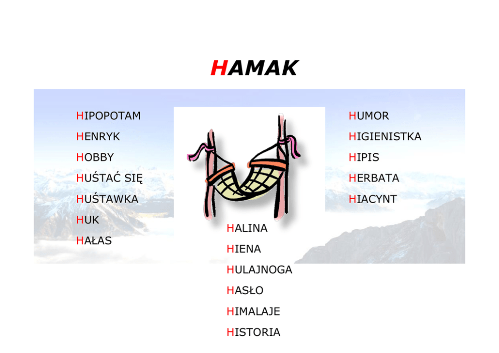 HAMAK HIPOPOTAM HUMOR HENRYK HIGIENISTKA HOBBY HIPIS HUŚTAĆ SIĘ HERBATA HUŚTAWKA HIACYNT HUK HAŁAS HALINA HIENA HULAJNOGA HASŁO HIMALAJE HISTORIA