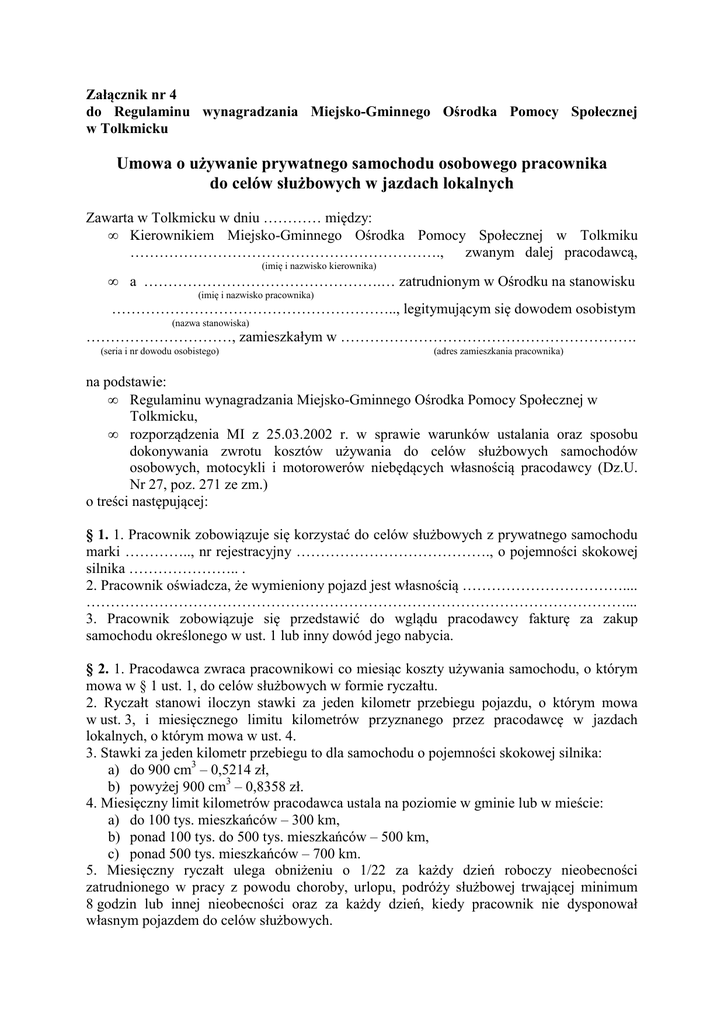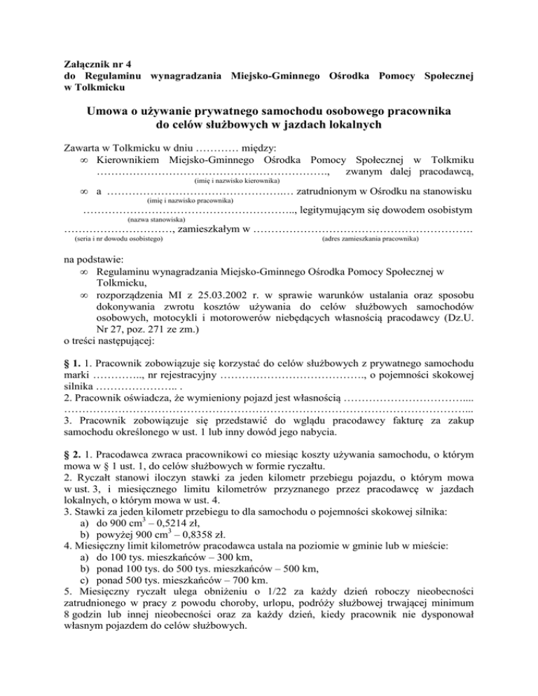 Załącznik nr 4 do Regulaminu wynagradzania Miejsko-Gminnego Ośrodka Pomocy Społecznej w Tolkmicku Umowa o używanie prywatnego samochodu osobowego pracownika do celów służbowych w jazdach lokalnych Zawarta w Tolkmicku w dniu ………… między: • Kierownikiem Miejsko-Gminnego Ośrodka Pomocy Społecznej w Tolkmiku ………………………………………………………., zwanym dalej pracodawcą, • (imię i nazwisko kierownika) a ………………………………………….… zatrudnionym w Ośrodku na stanowisku (imię i nazwisko pracownika) ………………………………………………….., legitymującym się dowodem osobistym (nazwa stanowiska) …………………………, zamieszkałym w ……………………………………………………. (seria i nr dowodu osobistego) (adres zamieszkania pracownika) na podstawie: • Regulaminu wynagradzania Miejsko-Gminnego Ośrodka Pomocy Społecznej w Tolkmicku, • rozporządzenia MI z 25.03.2002 r. w sprawie warunków ustalania oraz sposobu dokonywania zwrotu kosztów używania do celów służbowych samochodów osobowych, motocykli i motorowerów niebędących własnością pracodawcy (Dz.U. Nr 27, poz. 271 ze zm.) o treści następującej: § 1. 1. Pracownik zobowiązuje się korzystać do celów służbowych z prywatnego samochodu marki ………….., nr rejestracyjny …………………………………., o pojemności skokowej silnika ………………….. . 2. Pracownik oświadcza, że wymieniony pojazd jest własnością …………………………….... …………………………………………………………………………………………………... 3. Pracownik zobowiązuje się przedstawić do wglądu pracodawcy fakturę za zakup samochodu określonego w ust. 1 lub inny dowód jego nabycia. § 2. 1. Pracodawca zwraca pracownikowi co miesiąc koszty używania samochodu, o którym mowa w § 1 ust. 1, do celów służbowych w formie ryczałtu. 2. Ryczałt stanowi iloczyn stawki za jeden kilometr przebiegu pojazdu, o którym mowa w ust. 3, i miesięcznego limitu kilometrów przyznanego przez pracodawcę w jazdach lokalnych, o którym mowa w ust. 4. 3. Stawki za jeden kilometr przebiegu to dla samochodu o pojemności skokowej silnika: a) do 900 cm3 – 0,5214 zł, b) powyżej 900 cm3 – 0,8358 zł. 4. Miesięczny limit kilometrów pracodawca ustala na poziomie w gminie lub w mieście: a) do 100 tys. mieszkańców – 300 km, b) ponad 100 tys. do 500 tys. mieszkańców – 500 km, c) ponad 500 tys. mieszkańców – 700 km. 5. Miesięczny ryczałt ulega obniżeniu o 1/22 za każdy dzień roboczy nieobecności zatrudnionego w pracy z powodu choroby, urlopu, podróży służbowej trwającej minimum 8 godzin lub innej nieobecności oraz za każdy dzień, kiedy pracownik nie dysponował własnym pojazdem do celów służbowych. § 3. 1. Pracodawca wypłaca ryczałt pracownikowi po przedstawieniu przez niego do 3 dnia roboczego następnego miesiąca oświadczenia o używaniu własnego auta do celów służbowych w danym miesiącu. 2. Pracodawca ma prawo kontroli formalnej oświadczenia oraz jego zgodności z rzeczywistością. 3. Pracodawca wypłaca pracownikowi ryczałt z tytułu używania prywatnego samochodu do celów służbowych najpóźniej do 10 dnia następnego miesiąca. 4. Jeśli pracodawca ma podejrzenia co do niezgodności z rzeczywistością informacji podanych w oświadczeniu, może: a) wstrzymać wypłatę ryczałtu do czasu wyjaśnienia wątpliwości, b) obniżyć kwotę ryczałtu stosownie do wyników kontroli. 5. Pracownik jest zobowiązany powiadomić pracodawcę niezwłocznie o każdej zmianie danych i sytuacji określonych w umowie o używanie do celów służbowych pojazdu prywatnego w jazdach lokalnych. § 4. W sprawach nieuregulowanych w umowie stosuje się odpowiednio rozporządzenie MI z 25.03.2002 r. w sprawie warunków ustalania oraz sposobu dokonywania zwrotu kosztów używania do celów służbowych samochodów osobowych, motocykli i motorowerów niebędących własnością pracodawcy (Dz.U. Nr 27, poz. 271 ze zm.). § 5. Umowa obowiązuje na czas nieokreślony i ulega rozwiązaniu: a) w momencie ustania zatrudnienia pracownika z jakiegokolwiek powodu, b) po uprzednim zawiadomieniu pracownika o zaprzestaniu używania prywatnego samochodu, o którym mowa w § 1 ust. 1, do celów służbowych – od chwili tego zaprzestania, c) po wykryciu przez pracodawcę zaprzestania przez pracownika używania prywatnego auta, o którym mowa w § 1 ust. 1, do celów służbowych – od chwili tego zaprzestania lub od chwili jego wykrycia przez pracodawcę, d) po upływie miesięcznego wypowiedzenia złożonego przez pracodawcę z powodu nierzetelności popełnianych przez pracownika przy rozliczaniu kosztów używania samochodu. § 6. Wszelkie zmiany niniejszej umowy następują w formie pisemnego aneksu. § 7. Umowa została sporządzona w dwóch jednobrzmiących egzemplarzach, po jednym dla każdej ze stron. ……………………………………….. (podpis pracodawcy) …………………………………………. (podpis pracownika) Oświadczenie pracownika o używaniu pojazdu prywatnego do celów służbowych w miesiącu ……………. rok ………….. Pan …………………………………….. Tolkmicko, dnia ……………….. (imię i nazwisko pracownika) …………………………………………. (zajmowane stanowisko) Do Kierownika Miejsko-Gminnego Ośrodka Pomocy Społecznej w Tolkmicku 1. Oświadczam, że w miesiącu …………………………. roku ………… używałem do celów służbowych samochodu osobowego niebędącego własnością pracodawcy marki …………………………………….., o tablicy rejestracyjnej nr ……………………………… i o pojemności skokowej silnika ……………………………………………………………….. 2. W miesiącu tym byłem* nieobecny 