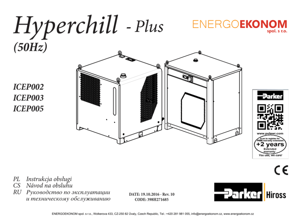 Hyperchill - Plus (50Hz) ICEP002 ICEP003 ICEP005 PL Instrukcja obsługi CS Návod na obsluhu RU Ðóêîâîäñòâî ïî ýêñïëóàòàöèè è òåõíè÷åñêîìó îáñëóæèâàíèþ DATE: 19.10.2016 - Rev. 10 CODE: 398H271685 ENERGOEKONOM spol. s r.o., Wolkerova 433, CZ-250 82 Úvaly, Czech Republic, Tel.: +420 281 981 055, [email protected], www.energoekonom.cz ENERGOEKONOM spol. s r.o., Wolkerova 433, CZ-250 82 Úvaly, Czech Republic, Tel.: +420 281 981 055, [email protected], www.energoekonom.cz Spis treści 1 Bezpieczeństwo 1 1.1 Istotność instrukcji ................................................................................ 1 1.2 Sygnalizacja ostrzegawcza ..................................................................... 1 1.3 Wskazówki dotyczšce bezpieczeństwa ................................................ 1 1.4 Ryzyka resztkowe ................................................................................... 1 2 Wprowadzenie 2 2.1 Transport ................................................................................................. 2 2.2 Przenoszenie ........................................................................................... 2 2.3 Inspekcja.................................................................................................. 2 2.4 Magazynowanie ...................................................................................... 2 3 Instalacja 2 3.1 Przestrzeń robocza ................................................................................. 2 3.2 Wersje ...................................................................................................... 2 3.3 Obwód hydrauliczny ............................................................................. 2 3.4 Obwód elektryczny ................................................................................ 3 4 Sterowanie 4 4.1 Panel sterowania..................................................................................... 4 4.2 Uruchamianie agregatu chłodniczego ................................................. 4 4.3 Zatrzymanie ............................................................................................ 4 4.4 Ustawienia parametrów......................................................................... 4 4.5 Zarządzanie parametrami ..................................................................... 5 4.6 Ustawianie zegara/daty.......................................................................... 6 4.7 Wyświetlanie czujników temperatury B1,B2, .................................... 6 4.8 Zarządzanie alarmami ........................................................................... 6 4.9 Historia alarmów/ostrzeżeń ................................................................. 7 4.10 Automatyczne powtórne uruchomienie ........................................... 7 5 Konserwacja 7 5.1 Uwagi ogólne .......................................................................................... 7 5.2 Konserwacja prewencyjna .................................................................... 7 5.3 Czynnik chłodniczy ............................................................................... 7 5.4 Demontaż ................................................................................................ 7 6 Wyszukiwanie usterek 7 7.1 7.2 7.3 7.4 7.5 7.6 7.7 Aneks Legenda Schemat instalacji Dane techniczne Wymiary Lista części zamiennych Schemat obwodu Schemat elektryczny Polski 1 Bezpieczeństwo 1.1 Istotność instrukcji • Przechowywać ją przez cały okres eksploatacji maszyny. • Przeczytać ją przed przystąpieniem do jakichkolwiek czynności. • Podlega zmianom: w celu aktualizacji informacji, zapoznać się z instrukcją dołączaną do maszyny. 1.2 Sygnalizacja ostrzegawcza ! Polecenie w celu wyeliminowania zagrożeń dla osób. Y Polecenie, którego należy przestrzegać w celu wyeliminowania ryzyka uszkodzenia urządzenia. Z Wymagana obecność upoważnionego, doświadczonego technika. , Podano symbole, których znaczenie jest w paragrafie 7. 1.3 Wskazówki dotyczšce bezpieczeństwa ! Każde urzšdzenie wyposażone jest w odłšcznik elektryczny umożliwiajšcy przeprowadzenia interwencji w bezpiecznych warunkach. Odłšcznika należy używać zawsze do wyeliminowania ryzyka podczas konserwacji. ! Instrukcja przeznaczona jest dla użytkownika końcowego i dotyczy wyłšcznie czynności wykonywanych przy zamkniętych panelach: czynności wymagajšce ich otwarcia przy pomocy narzędzi mogš być wykonywane przez doświadczony i wykwalifikowany personel. Y Nie przekraczać ograniczeń projektowych podanych na tabliczce znamionowej. ! Y Użytkownik jest zobowiązany nie dopuścić do działania innych obciążeń oprócz wewnętrznego ciśnienia statycznego. W razie zaistnienia niebezpieczeństwa wstrząsów sejsmicznych, należy odpowiednio zabezpieczyć urządzenie. Urzšdzenia należy używać wyłšcznie do zastosowań profesjonalnych i do celu, do którego zostało przeznaczone. Użytkownik ma obowišzek przeanalizowania wszystkich aspektów zastosowania i miejsca instalacji produktu, przestrzegania wszystkich stosownych standardów bezpieczeństwa przemysłowego oraz wszystkich zaleceń dotyczšcych produktu zawartych w instrukcji obsługi oraz wszelkiej innej dokumentacji dołšczonej do urzšdzenia. Przeróbki lub wymiana jakiegokolwiek komponentu przez osoby nieupoważnione i/lub nieprawidłowa obsługa urzšdzenia powodujš unieważnienie gwarancji i zwalniajš producenta z jakiejkolwiek odpowiedzialności. Producent nie ponosi odpowiedzialności teraz ani w przyszłości za szkody doznane przez osoby, mienie i samo urzšdzenie wynikłe z zaniedbań ze strony operatorów, nieprzestrzegania wskazówek podanych w niniejszej instrukcji oraz niezastosowania obowišzujšcych norm odnośnie bezpieczeństwa instalacji. Producent nie ponosi odpowiedzialności za ewentualne szkody wynikłe wskutek zmi
