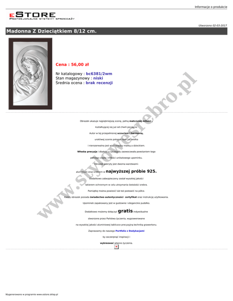 Informacje o produkcie Utworzono 02-03-2017 Madonna Z Dzieciątkiem 8/12 cm. Cena : 56,00 zł w es re b ro .p l Nr katalogowy : bc6381/2wm Stan magazynowy : niski Średnia ocena : brak recenzji Obrazek ukazuje najpiękniejszą scenę, pełną matczynej miłości , kształtującej się już od chwili poczęcia. Autor w tej przepełnionej uczuciem i harmonią, urokliwej scenie pokazał nam jak wielka i nierozerwalna jest więź między matką a dzieckiem. lo Włoska precyzja i dbałość o szczegóły zaowocowała powstaniem tego pełnego ciepła i miłości unikatowego upominku. .s ty Obrazek pokryty jest dwoma warstwami- aluminium oraz srebrem w najwyższej próbie 925. Dodatkowo zabezpieczony został wysokiej jakości w lakierem ochronnym w celu utrzymania świeżości srebra. Pamiątkę można powiesić lub też postawić na półce. w w Każdy obrazek posiada świadectwo autentyczności certyfikat oraz instrukcję użytkowania. Upominek zapakowany jest w gustowne i eleganckie pudełko. Dodatkowo możemy dołączyć gratis indywidualne stworzone przez Państwa życzenia, wygrawerowane na wysokiej jakości aluminiowej tabliczce precyzyjną techniką grawertonu. Zapraszamy do naszego Portfolio z Dedykacjami by zaczerpnąć inspiracji i wykreować własne życzenia. Wygenerowano w programie www.estore.sklep.pl