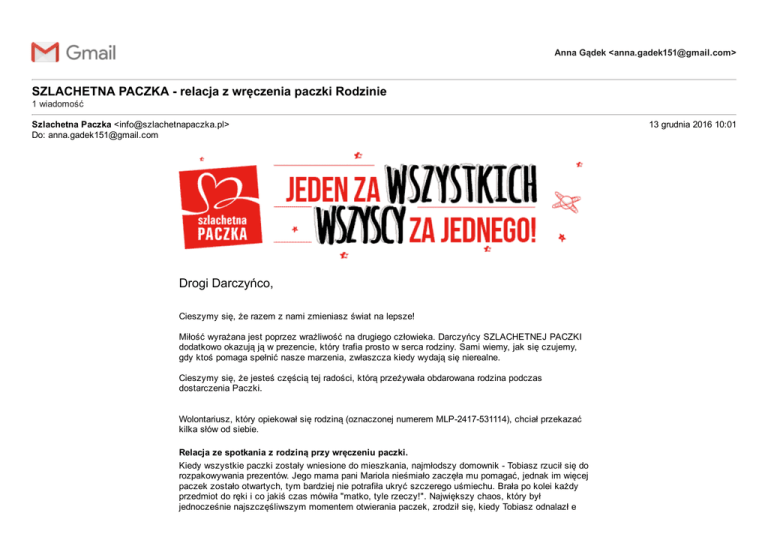Anna Gądek <[email protected]> SZLACHETNA PACZKA relacja z wręczenia paczki Rodzinie 1 wiadomość Szlachetna Paczka <[email protected]> Do: [email protected] Drogi Darczyńco, Cieszymy się, że razem z nami zmieniasz świat na lepsze! Miłość wyrażana jest poprzez wrażliwość na drugiego człowieka. Darczyńcy SZLACHETNEJ PACZKI dodatkowo okazują ją w prezencie, który trafia prosto w serca rodziny. Sami wiemy, jak się czujemy, gdy ktoś pomaga spełnić nasze marzenia, zwłaszcza kiedy wydają się nierealne. Cieszymy się, że jesteś częścią tej radości, którą przeżywała obdarowana rodzina podczas dostarczenia Paczki. Wolontariusz, który opiekował się rodziną (oznaczonej numerem MLP2417531114), chciał przekazać kilka słów od siebie. Relacja ze spotkania z rodziną przy wręczeniu paczki. Kiedy wszystkie paczki zostały wniesione do mieszkania, najmłodszy domownik Tobiasz rzucił się do rozpakowywania prezentów. Jego mama pani Mariola nieśmiało zaczęła mu pomagać, jednak im więcej paczek zostało otwartych, tym bardziej nie potrafiła ukryć szczerego uśmiechu. Brała po kolei każdy przedmiot do ręki i co jakiś czas mówiła "matko, tyle rzeczy!". Największy chaos, który był jednocześnie najszczęśliwszym momentem otwierania paczek, zrodził się, kiedy Tobiasz odnalazł e 13 grudnia 2016 10:01 Paczce album i karty z piłkarzami. Ile było krzyku i radości! Brat Jakub zażartował: "tylko zawału nie dostań", na co wszyscy buchnęliśmy śmiechem. Co chce przekazać Tobie wolontariusz: Ja ze swojej strony chciałam bardzo podziękować Wam wszystkim i każdemu z osobna za zaangażowanie w ten szczególny projekt. Wierzę, że prezenty, które przekazaliście, bardzo pomogą rodzinie pani Marioli w pokonywaniu życiowych przeszkód. Chcę podkreślić, że paczki sprawiły rodzinie bardzo wiele radości i wyzwoliły pozytywne emocje we wszystkich domownikach. Współpraca z Wami była dla mnie czystą przyjemnością, dzięki takim osobom, jak Wy wierzę, że są jeszcze ludzie, którzy potrafią i chcą pomagać. Życzę Wam, aby dobro, które przekazaliście za pośrednictwem Paczki, do Was wróciło, a nadchodzące święta pełne były radości i rodzinnego ciepła. Co chce powiedzieć od siebie rodzina: Pani Mariola chciała serdecznie podziękować za wszystkie prezenty i zaznaczyć, że na pewno bardzo się przydadzą. Z kolei Jakub i Tobiasz zgodnie twierdzą, iż "prezenty są super". Darczyńco, w załączniku emaila znajdziesz imienny certyfikat z podziękowaniem za udział w programie. certyfikat.pdf 5620K