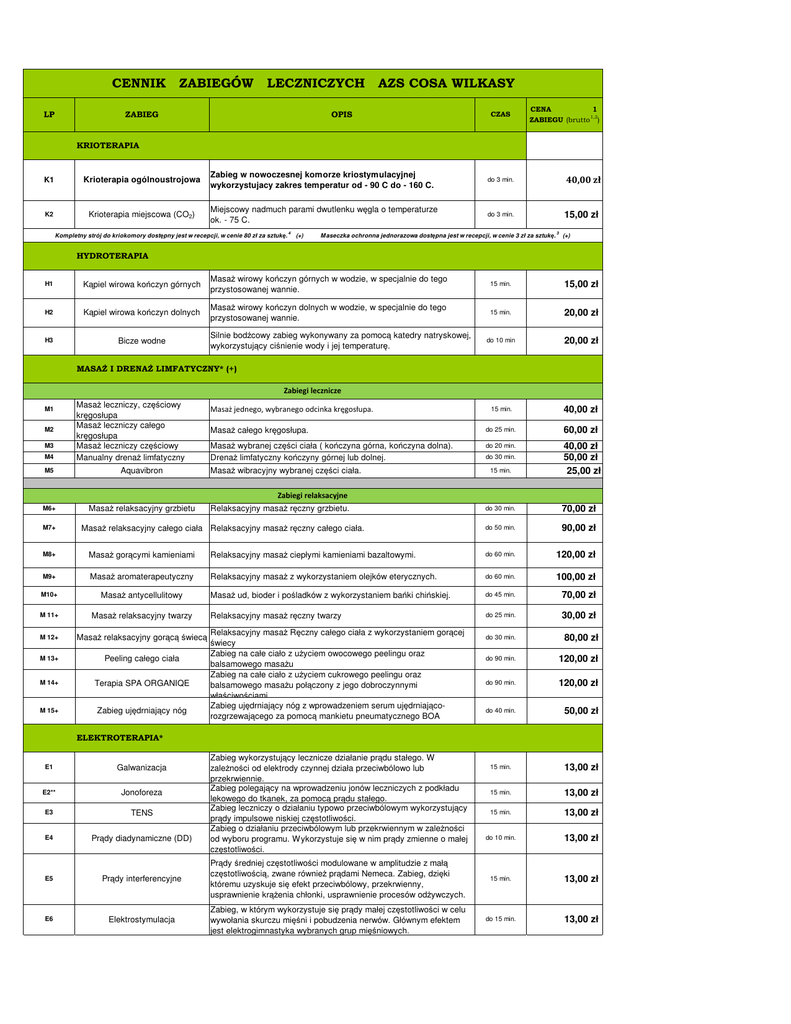 CENNIK LP ZABIEGÓW LECZNICZYCH ZABIEG AZS COSA WILKASY OPIS CZAS CENA 1 ZABIEGU (brutto 1,2) KRIOTERAPIA K1 Krioterapia ogólnoustrojowa Zabieg w nowoczesnej komorze kriostymulacyjnej wykorzystujacy zakres temperatur od - 90 C do - 160 C. do 3 min. K2 Krioterapia miejscowa (CO2) Miejscowy nadmuch parami dwutlenku węgla o temperaturze ok. - 75 C. do 3 min. Kompletny strój do kriokomory dostępny jest w recepcji, w cenie 80 zł za sztukę. 4 (+) M aseczka ochronna jednorazowa dostępna jest w recepcji, w cenie 3 zł za sztukę. 40,00 zł 15,00 zł 3 (+) HYDROTERAPIA H1 Kąpiel wirowa kończyn górnych Masaż wirowy kończyn górnych w wodzie, w specjalnie do tego przystosowanej wannie. 15 min. 15,00 zł H2 Kąpiel wirowa kończyn dolnych Masaż wirowy kończyn dolnych w wodzie, w specjalnie do tego przystosowanej wannie. 15 min. 20,00 zł H3 Bicze wodne do 10 min 20,00 zł 15 min. 40,00 zł Masaż całego kręgosłupa. do 25 min. 60,00 zł Masaż wybranej części ciała ( kończyna górna, kończyna dolna). Drenaż limfatyczny kończyny górnej lub dolnej. do 20 min. 40,00 zł 50,00 zł 25,00 zł Silnie bodźcowy zabieg wykonywany za pomocą katedry natryskowej, wykorzystujący ciśnienie wody i jej temperaturę. MASAś I DRENAś LIMFATYCZNY* (+) Zabiegi lecznicze M1 M2 M3 M4 Masaż leczniczy, częściowy kręgosłupa Masaż leczniczy całego kręgosłupa Masaż leczniczy częściowy Manualny drenaż limfatyczny M5 Aquavibron M6+ Masaż relaksacyjny grzbietu Masaż jednego, wybranego odcinka kręgosłupa. Masaż wibracyjny wybranej części ciała. do 30 min. 15 min. Zabiegi relaksacyjne M7+ Relaksacyjny masaż ręczny grzbietu. Masaż relaksacyjny całego ciała Relaksacyjny masaż ręczny całego ciała. do 30 min. 70,00 zł do 50 min. 90,00 zł M8+ Masaż gorącymi kamieniami Relaksacyjny masaż ciepłymi kamieniami bazaltowymi. do 60 min. 120,00 zł Relaksacyjny masaż z wykorzystaniem olejków eterycznych. do 60 min. 100,00 zł Masaż ud, bioder i pośladków z wykorzystaniem bańki chińskiej. do 45 min. 70,00 zł Relaksacyjny masaż ręczny twarzy do 25 min. 30,00 zł M9+ Masaż aromaterapeutyczny M10+ Masaż antycellulitowy M 11+ Masaż relaksacyjny twarzy M 12+ M 13+ M 14+ M 15+ Relaksacyjny masaż Ręczny całego ciała z wykorzystaniem gorącej Masaż relaksacyjny gorącą świecą świecy Zabieg na całe ciało z użyciem owocowego peelingu oraz Peeling całego ciała balsamowego masażu Zabieg na całe ciało z użyciem cukrowego peelingu oraz Terapia SPA ORGANIQE balsamowego masażu połączony z jego dobroczynnymi właściwościami. Zabieg ujędrniający nóg z wprowadzeniem serum ujędrniającoZabieg ujędrniający nóg rozgrzewającego za pomocą mankietu pneumatycznego BOA do 30 min. 80,00 zł do 90 min. 120,00 zł do 90 min. 120,00 zł do 40 min. 50,00 zł 15 min. 13,00 zł 15 min. 13,00 zł 15 min. 13,00 zł do 10 min. 13,00 zł ELEKTROTERAPIA* Zabieg wykorzystujący lecznicze działanie prądu stałego. W zależności od elektrody czynnej działa przeciwbólowo lub przekrwiennie. Zabieg polegający na wprowadzeniu jonów leczniczych z podkładu lekowego do tkanek, za pomocą prądu stałego. Zabieg leczniczy o działaniu typowo przeciwbólowym wykorzystujący prądy impulsowe niskiej częstotliwości. Zabieg o działaniu przeciwbólowym lub przekrwiennym w zależności od wyboru programu. Wykorzystuje się w nim prądy zmienne o małej częstotliwości. E1 Galwanizacja E2** Jonoforeza E3 TENS E4 Prądy diadynamiczne (DD) E5 Prądy interferencyjne Prądy średniej częstotliwości modulowane w amplitudzie z małą częstotliwością, zwane również prądami Nemeca. Zabieg, dzięki któremu uzyskuje się efekt przeciwbólowy, przekrwienny, usprawnienie krążenia chłonki, usprawnienie procesów odżywczych. 15 min. 13,00 zł E6 Elektrostymulacja Zabieg, w którym wykorzystuje się prądy małej częstotliwości w celu wywołania skurczu mięśni i pobudzenia nerwów. Głównym efektem jest elektrogimnastyka wybranych grup mięśniowych. do 15 min. 13,00 zł E7 Prądy Kotza E8 Prądy Traeberta Zabieg zwany "rosyjską stymulacją" wykorzystujacy prądy średniej częstotliwości zmodulowane do częstotliwości niskiej. Wywołują skurcz mięśni głębiej położonych, pobudzają wzrost siły i masy mięśniowej. Prądy impulsowe o przebiegu prostokątnym. Skutkiem ich działania jest efekt przeciwbólowy i przekrwienny. Prądy te przyspieszają procesy regeneracyjne. PRESOTERAPIA - terapia uciskowa* U1 Masaż uciskowy BOA U2 Thermopress do 15 min. 13,00 zł do 15 min. 13,00 zł CZAS CENA 1 ZABIEGU (brutto 1,2) Zabieg z użyciem mankietu pneumatycznego usuwający obrzęki kończyn górnych lub dolnych. do 30 min 24,00 zł Zabieg z użyciem mankietu uciskowego z możliwością ogrzewania lub ochładzania części ciała poddanych zabiegowi. do 20 min 20,00 zł do 5 min. 13,00 zł do 5 min. 13,00 zł do 10 min. 12,00 zł 15 min. 10,00 zł do 20 min. 13,00 zł 30 min. 25,00 zł do 30 min. 13,00 zł do 30 min. 13,00 zł 13,00 zł 30,00 zł SONOTERAPIA* S1 Ultradźwięki S2** Fonoforeza Drgania fal dźwiękowych o częstotliwości wyższej niż 16 kHz (przekraczają górny próg słyszalności dla człowieka) powodujące mikromasaz w miejscu zabiegowym. Zabieg ultradźwiękowy, w którym zamiast zwykłego żelu używa się maści lub żeli leczniczych (Fastum, Dicloratio, Veral). ŚWIATŁOLECZNICTWO* L1 L2 Laser Naświetlanie promieniami laserowymi, doprowadzającymi określoną ilość energii do miejsca objętego procesem chorobowym. Sollux Naświetlanie promieniami podczerwonymi (IR) z wykorzystaniem odpowiednich filtrów. Zabieg powoduje przekrwienie i rozluźnienie tkanek. TERAPIA POLEM MAGNETYCZNYM* P1 Pole magnetyczne P2 Magnetostymulacja Zabieg wykorzystujacy lecznicze działanie pola magnetycznego niskiej częstotliwości, dający efekt przeciwbólowy, przeciwzapalny i przeciwobrzękowy. Masaż wibracyjny na specjalnym materacu, połaczony z działaniem pola magn