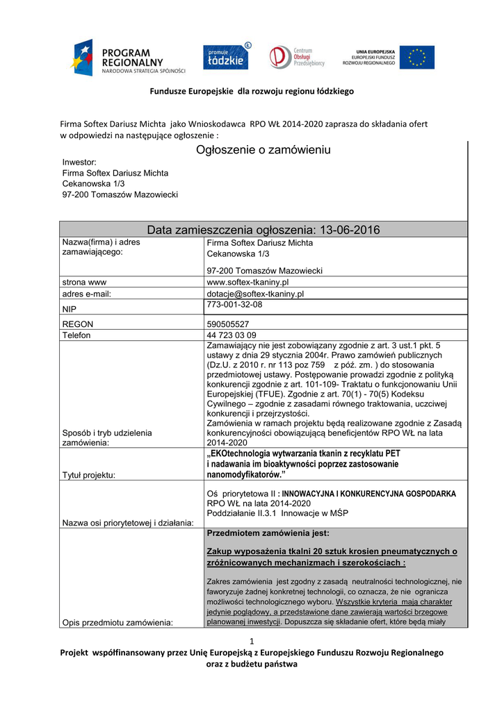 Fundusze Europejskie dla rozwoju regionu łódzkiego Firma Softex Dariusz Michta jako Wnioskodawca RPO WŁ 2014-2020 zaprasza do składania ofert w odpowiedzi na następujące ogłoszenie : Ogłoszenie o zamówieniu Inwestor: Firma Softex Dariusz Michta Cekanowska 1/3 97-200 Tomaszów Mazowiecki Data zamieszczenia ogłoszenia: 13-06-2016 Nazwa(firma) i adres zamawiającego: Firma Softex Dariusz Michta Cekanowska 1/3 strona www adres e-mail: 97-200 Tomaszów Mazowiecki www.softex-tkaniny.pl [email protected] 773-001-32-08 NIP REGON Telefon Sposób i tryb udzielenia zamówienia: 590505527 44 723 03 09 Zamawiający nie jest zobowiązany zgodnie z art. 3 ust.1 pkt. 5 ustawy z dnia 29 stycznia 2004r. Prawo zamówień publicznych (Dz.U. z 2010 r. nr 113 poz 759 z póź. zm. ) do stosowania przedmiotowej ustawy. Postępowanie prowadzi zgodnie z polityką konkurencji zgodnie z art. 101-109- Traktatu o funkcjonowaniu Unii Europejskiej (TFUE). Zgodnie z art. 70(1) - 70(5) Kodeksu Cywilnego – zgodnie z zasadami równego traktowania, uczciwej konkurencji i przejrzystości. Zamówienia w ramach projektu będą realizowane zgodnie z Zasadą konkurencyjności obowiązującą beneficjentów RPO WŁ na lata 2014-2020 Tytuł projektu: „EKOtechnologia wytwarzania tkanin z recyklatu PET i nadawania im bioaktywności poprzez zastosowanie nanomodyfikatorów.” Oś priorytetowa II : INNOWACYJNA I KONKURENCYJNA GOSPODARKA RPO WŁ na lata 2014-2020 Poddziałanie II.3.1 Innowacje w MŚP Nazwa osi priorytetowej i działania: Przedmiotem zamówienia jest: Zakup wyposażenia tkalni 20 sztuk krosien pneumatycznych o zróżnicowanych mechanizmach i szerokościach : Opis przedmiotu zamówienia: Zakres zamówienia jest zgodny z zasadą neutralności technologicznej, nie faworyzuje żadnej konkretnej technologii, co oznacza, że nie ogranicza możliwości technologicznego wyboru. Wszystkie kryteria mają charakter jedynie poglądowy, a przedstawione dane zawierają wartości brzegowe planowanej inwestycji. Dopuszcza się składanie ofert, które będą miały 1 Projekt współfinansowany przez Unię Europejską z Europejskiego Funduszu Rozwoju Regionalnego oraz z budżetu państwa Fundusze Europejskie dla rozwoju regionu łódzkiego wartości równoważne o tej samej funkcjonalności. Nie preferuje się żadnej technologii. Zakup krosien pneumatycznych krzywkowych 190- 4 sztuki Zakup krosien pneumatycznych krzywkowych 220- 4 sztuki Zakup krosien pneumatycznych nicielnicowych 190- 4 sztuki Zakup krosien pneumatycznych żakardowych 190 -220- 8 sztuk Krosna powinny posiadać ergonomiczny system ładowania nawojów do podajnika, który pozwala na obniżenie czasu ponownego załadunku do minimum i dodatkowo nie jest skomplikowane nawet dla mniej doświadczonych tkaczy. Każde krosno powinno posiadać 4 podawacze wątku+ 4 nawoje w zapasie, które w przypadku zerwania nawoju, pobiera z zapasu drugi wątek. Maszyny muszą posiadać specjalną ochronę dźwiękochłonną, która pozwala na obniżenie emisji hałasu w hali. Konstrukcja maszyny oparta powinna być oparta na intuicyjnym panelu do jej obsługiwania. Wszystkie przyciski łatwo dostępne, a wszelki parametry procesu tkackiego wyświetlane na prostym czytelnym ekranie, który pozwala na przejrzenie wszystkich parametrów bez zatrzymywania maszyny. Krosna muszą posiadać system automatycznego doboru prędkości tkania dla osiągnięcia optymalnej jakości i wydajności. Maszyny musi posiadać „ system powrotu i monitorowania wątku”, który pozwala na nadbudowę splotu w przypadku wystąpienia braku jakościowego w przędzy. Krosna kontrolowane przez mikroprocesor, który zapisuje dane o wydajności, popełnianych błędach, tkanych wzorach. Wątek podawany za pomocą dysz wydmuchujących go za pomocą sprzężonego powietrza, dodatkowo przędza, która nie jest wbijania do tkaniny powinna być przytrzymywana za pomocą systemu klamer, co pozwali na obniżenie zużycia powietrza jako medium produkcyjnego. Krosna muszą posiadać system kontroli krajek, napędzane przez oddzielne kroczące silniczki, które w pełni kontrolowane są przez system elektroniczny krosna. System podawania przędzy w krosnach musi być modularny , co oznacza, ze w każdym module czyli na jedną dyszę znajdują się dwie ścieżki podawania przędzy. System adaptacji domykania zaworów pozwala na automatyczny dobór parametrów tkania po zmianie filamentów zastosowanej przędzy. Miejsce dostawy: ul. Cekanowska 1/3, 97-200 Tomaszów Mazowiecki Termin realizacji projektu: 01.04.2016- 31.12.2017 Kryteria oceny i ich wagi: Cena netto 100% 2 Projekt współfinansowany przez Unię Europejską z Europejskiego Funduszu Rozwoju Regionalnego oraz z budżetu państwa Fundusze Europejskie dla rozwoju regionu łódzkiego Opis sposobu obliczania punktów w poszczególnych kryteriach: Opis sposobu obliczania ceny Ocena wg kryterium: C = ( Cmin /Cof) x 100% gdzie: Cmin – najniższa oferowana cena, Cof – cena oferenta. Podsumowanie kryteriów Zwycięzcą zostanie oferent, który uzyska najwyższą liczbę punktów. 1. strony oferty winny być ponumerowane w sposób ciągły, 2. oferta musi posiadać datę sporządzenia, Opis sposobu przygotowania oferty 3. winna być podpisana przez osobę upoważnioną do reprezentowania wykonawcy, wynikające z dokumentów rejestrowych, 4. jeden wykonawca może złożyć tylko jedną ofertę 5. oferta może przesłana za pośrednictwem poczty elektronicznej na adres: [email protected], poczty, kuriera lub też dostarczona osobiście na adres: 97-200 Tomaszów Maz., ul. Cekanowska 1/3 Termin ważności oferty : Oferta winna być ważna do 30-09-2016 Czas dostarczenia oferty: Oferta winna być dostarczona do dnia 13-07-2016. Decydować będzie data wpłynięcia ofert do siedziby Beneficjenta. Miejsce i termin otwarcia ofert: Dodatkowe informacje: Oferty zostaną rozpatrzone dnia 14-07-2016. Zwycięzcą zostanie oferent, którego oferta zdobędzie największą li