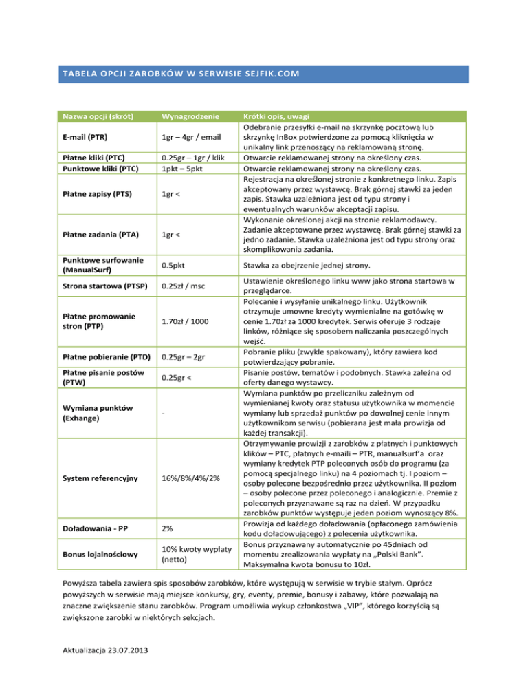 TABELA OPCJI ZAROBKÓW W SERWISIE SEJFIK.COM Nazwa opcji (skrót) Wynagrodzenie E-mail (PTR) 1gr – 4gr / email Płatne kliki (PTC) Punktowe kliki (PTC) 0.25gr – 1gr / klik 1pkt – 5pkt Płatne zapisy (PTS) 1gr < Płatne zadania (PTA) 1gr < Punktowe surfowanie (ManualSurf) 0.5pkt Strona startowa (PTSP) 0.25zł / msc Płatne promowanie stron (PTP) 1.70zł / 1000 Płatne pobieranie (PTD) 0.25gr – 2gr Płatne pisanie postów (PTW) 0.25gr < Wymiana punktów (Exhange) - System referencyjny 16%/8%/4%/2% Doładowania - PP 2% Bonus lojalnościowy 10% kwoty wypłaty (netto) Krótki opis, uwagi Odebranie przesyłki e-mail na skrzynkę pocztową lub skrzynkę InBox potwierdzone za pomocą kliknięcia w unikalny link przenoszący na reklamowaną stronę. Otwarcie reklamowanej strony na określony czas. Otwarcie reklamowanej strony na określony czas. Rejestracja na określonej stronie z konkretnego linku. Zapis akceptowany przez wystawcę. Brak górnej stawki za jeden zapis. Stawka uzależniona jest od typu strony i ewentualnych warunków akceptacji zapisu. Wykonanie określonej akcji na stronie reklamodawcy. Zadanie akceptowane przez wystawcę. Brak górnej stawki za jedno zadanie. Stawka uzależniona jest od typu strony oraz skomplikowania zadania. Stawka za obejrzenie jednej strony. Ustawienie określonego linku www jako strona startowa w przeglądarce. Polecanie i wysyłanie unikalnego linku. Użytkownik otrzymuje umowne kredyty wymienialne na gotówkę w cenie 1.70zł za 1000 kredytek. Serwis oferuje 3 rodzaje linków, różniące się sposobem naliczania poszczególnych wejść. Pobranie pliku (zwykle spakowany), który zawiera kod potwierdzający pobranie. Pisanie postów, tematów i podobnych. Stawka zależna od oferty danego wystawcy. Wymiana punktów po przeliczniku zależnym od wymienianej kwoty oraz statusu użytkownika w momencie wymiany lub sprzedaż punktów po dowolnej cenie innym użytkownikom serwisu (pobierana jest mała prowizja od każdej transakcji). Otrzymywanie prowizji z zarobków z płatnych i punktowych klików – PTC, płatnych e-maili – PTR, manualsurf’a oraz wymiany kredytek PTP poleconych osób do programu (za pomocą specjalnego linku) na 4 poziomach tj. I poziom – osoby polecone bezpośrednio przez użytkownika. II poziom – osoby polecone przez poleconego i analogicznie. Premie z poleconych przyznawane są raz na dzień. W przypadku zarobków punktów występuje jeden poziom wynoszący 8%. Prowizja od każdego doładowania (opłaconego zamówienia kodu doładowującego) z polecenia użytkownika. Bonus przyznawany automatycznie po 45dniach od momentu zrealizowania wypłaty na „Polski Bank”. Maksymalna kwota bonusu to 10zł. Powyższa tabela zawiera spis sposobów zarobków, które występują w serwisie w trybie stałym. Oprócz powyższych w serwisie mają miejsce konkursy, gry, eventy, premie, bonusy i zabawy, które pozwalają na znaczne zwiększenie stanu zarobków. Program umożliwia wykup członkostwa „VIP”, którego korzyścią są zwiększone zarobki w niektórych sekcjach. Aktualizacja 23.07.2013 Do regularnych konkursów należą: konkurs klikacza tj. osób z największą liczbą obejrzanych reklam w sekcji PTC w danym okresie (co miesięczny lub dwumiesięczny), kliki konkursowe tj. symboliczna nagroda losowana wśród osób oglądających reklamy w sekcji PTC konkursowe (konkurs w trybie stałym) konkurs aktywności globalnej promujący aktywność w wszystkich sekcjach serwisu nie tylko zarobkowych, ale też społecznościowych czy usługowych. Nieregularne: refkonkurs tj. konkurs na największą liczbę osób zaproszonych do programu Aktualizacja 23.07.2013