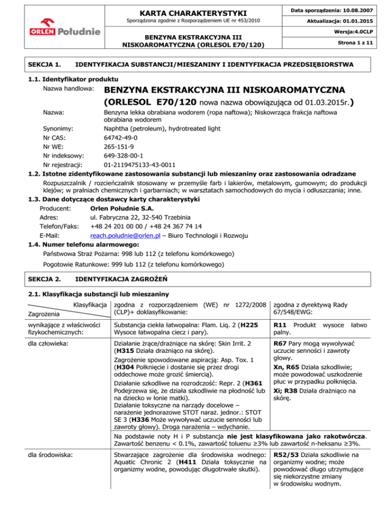 KARTA CHARAKTERYSTYKI Sporządzona zgodnie z Rozporządzeniem UE nr 453/2010 Data sporządzenia: 10.08.2007 Aktualizacja: 01.01.2015 Wersja:4.0CLP BENZYNA EKSTRAKCYJNA III NISKOAROMATYCZNA (ORLESOL E70/120) SEKCJA 1. Strona 1 z 11 IDENTYFIKACJA SUBSTANCJI/MIESZANINY I IDENTYFIKACJA PRZEDSIĘBIORSTWA 1.1. Identyfikator produktu Nazwa handlowa: BENZYNA EKSTRAKCYJNA III NISKOAROMATYCZNA (ORLESOL E70/120 nowa nazwa obowiązująca od 01.03.2015r.) Nazwa: Benzyna lekka obrabiana wodorem (ropa naftowa); Niskowrząca frakcja naftowa obrabiana wodorem Synonimy: Naphtha (petroleum), hydrotreated light Nr CAS: 64742-49-0 Nr WE: 265-151-9 Nr indeksowy: 649-328-00-1 Nr rejestracji: 01-2119475133-43-0011 1.2. Istotne zidentyfikowane zastosowania substancji lub mieszaniny oraz zastosowania odradzane Rozpuszczalnik / rozcieńczalnik stosowany w przemyśle farb i lakierów, metalowym, gumowym; do produkcji klejów; w pralniach chemicznych i garbarniach; w warsztatach samochodowych do mycia i odłuszczania; inne. 1.3. Dane dotyczące dostawcy karty charakterystyki Producent: Orlen Południe S.A. Adres: ul. Fabryczna 22, 32-540 Trzebinia Telefon/Faks: +48 24 201 00 00 / +48 24 367 74 14 E-Mail: [email protected] – Biuro Technologii i Rozwoju 1.4. Numer telefonu alarmowego: Państwowa Straż Pożarna: 998 lub 112 (z telefonu komórkowego) Pogotowie Ratunkowe: 999 lub 112 (z telefonu komórkowego) SEKCJA 2. IDENTYFIKACJA ZAGROŻEŃ 2.1. Klasyfikacja substancji lub mieszaniny Klasyfikacja Zagrożenia zgodna z rozporządzeniem (WE) nr 1272/2008 (CLP)+ doklasyfikowanie: zgodna z dyrektywą Rady 67/548/EWG: wynikające z właściwości fizykochemicznych: Substancja ciekła łatwopalna: Flam. Liq. 2 (H225 Wysoce łatwopalna ciecz i pary). R11 Produkt palny. dla człowieka: Działanie żrące/drażniące na skórę: Skin Irrit. 2 (H315 Działa drażniąco na skórę). R67 Pary mogą wywoływać uczucie senności i zawroty głowy. Zagrożenie spowodowane aspiracją: Asp. Tox. 1 (H304 Połknięcie i dostanie się przez drogi oddechowe może grozić śmiercią). Działanie szkodliwe na rozrodczość: Repr. 2 (H361 Podejrzewa się, że działa szkodliwie na płodność lub na dziecko w łonie matki). Działanie toksyczne na narządy docelowe – narażenie jednorazowe STOT naraż. jednor.: STOT SE 3 (H336 Może wywoływać uczucie senności lub zawroty głowy). Droga narażenia – wdychanie. wysoce łatwo Xn, R65 Działa szkodliwie; może powodować uszkodzenie płuc w przypadku połknięcia. Xi; R38 Działa drażniąco na skórę. Na podstawie noty H i P substancja nie jest klasyfikowana jako rakotwórcza. Zawartość benzenu < 0.1%, zawartość toluenu ≥3% lub zawartość n-heksanu ≥3%. dla środowiska: Stwarzające zagrożenie dla środowiska wodnego: Aquatic Chronic 2 (H411 Działa toksycznie na organizmy wodne, powodując długotrwałe skutki). R52/53 Działa szkodliwie na organizmy wodne; może powodować długo utrzymujące się niekorzystne zmiany w środowisku wodnym. Data sporządzenia: 10.08.2007 KARTA CHARAKTERYSTYKI Sporządzona zgodnie z Rozporządzeniem UE nr 453/2010 Aktualizacja: 01.01.2015 Wersja:4.0CLP BENZYNA EKSTRAKCYJNA III NISKOAROMATYCZNA (ORLESOL E70/120) Strona 2 z 11 2.2. Elementy oznakowania Piktogram: : GHS02 GHS07 GHS08 GHS09 Hasło ostrzegawcze: Niebezpieczeństwo Zwroty wskazujące rodzaj zagrożenia: H225 Wysoce łatwopalna ciecz i pary. H304 Połknięcie i dostanie się przez drogi oddechowe może grozić śmiercią. H315 Działa drażniąco na skórę. H336 Może wywoływać uczucie senności lub zawroty głowy. H361 Podejrzewa się, że działa szkodliwie na płodność lub na dziecko w łonie matki H411 Działa toksycznie na organizmy wodne, powodując długotrwałe skutki. Zwroty wskazujące środki ostrożności: P201 Przed użyciem zapoznać się ze specjalnymi środkami ostrożności. P210 Przechowywać z dala od źródeł ciepła/iskrzenia/ otwartego ognia/gorących powierzchni. – Palenie wzbronione. P280 Stosować rękawice ochronne/odzież ochronną/ ochronę oczu/ochronę twarzy. P301+P310 W PRZYPADKU POŁKNIĘCIA: Natychmiast skontaktować się z OŚRODKIEM ZATRUĆ lub z lekarzem. P403+P233 Przechowywać w dobrze wentylowanym miejscu. Przechowywać pojemnik szczelnie zamknięty. P501 Zawartość/pojemnik usuwać do firm posiadających odpowiednie uprawnienia. 2.3. Inne zagrożenia Substancja nie spełnia kryteriów PBT lub vPvB zgodnie z załącznikiem XIII rozporządzenia REACH. Pary tworzą z powietrzem mieszaniny wybuchowe. Wrażliwy na wyładowania elektrostatyczne. SEKCJA 3. SKŁAD/INFORMACJA O SKŁADNIKACH 3.1. Substancje Nazwa substancji Wzór % wagowy Nr CAS Nr WE Nr indeksowy Benzyna lekka obrabiana wodorem (ropa naftowa) Nie dotyczy 100 64742-49-0 265-151-9 649-328-00-1 Złożona mieszanina węglowodorów otrzymywana przez obróbkę frakcji ropy naftowej wodorem w obecności katalizatora. Składa się z węglowodorów o liczbie atomów węgla głównie w zakresie od C 4 do C11, wrzących w zakresie temp. od ok. minus 20°C do 190°C. Zawartość składników substancji: benzenu ≤ 0,01 %, toluenu ≤ 0,3 %, n-heksanu ≤ 1 %. SEKCJA 4. ŚRODKI PIERWSZEJ POMOCY 4.1. Opis środków pierwszej pomocy Wdychanie: Poszkodowanego usunąć (wyprowadzić/wynieść) z miejsca narażenia na świeże powietrze; zapewnić spokój i ciepło, rozluźnić uciskające części ubrania. Nieprzytomnego ułożyć w pozycji bocznej ustalonej; kontrolować i utrzymywać drożność dróg oddechowych. W przypadku zaburzeń w oddychaniu podawać tlen, w przypadku braku oddechu stosować sztuczne oddychanie. W przypadku utraty przytomności, zaburzeń oddychania lub utrzymującego się złego samopoczucia natychmiast zapewnić pomoc lekarską. Kontakt ze skórą: Natychmiast zdjąć zanieczyszczoną/nasiąkniętą odzież i buty. Zanieczyszczoną skórę umyć dokładnie wodą z mydłem lub łagodnym detergentem, a następnie spłukać dużą ilością wody. W przypadku wystąpi