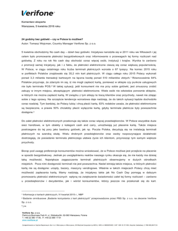 Komentarz eksperta Warszawa, 5 kwietnia 2016 roku 24 godziny bez gotówki – czy w Polsce to możliwe? Autor: Tomasz Wejcman, Country Manager Verifone Sp. z o.o. 5 kwietnia obchodzimy No cash day – dzień bez gotówki. Inicjatywa narodziła się w 2011 roku we Włoszech i jej celem było promowanie płatności bezgotówkowych oraz informowanie o przewagach tej formy rozliczeń nad gotówką. Z roku na rok No cash day obchodzi coraz więcej osób, instytucji i krajów. Wynika to zarówno z promocji samej inicjatywy, jak i z faktu, że płatności elektroniczne cieszą się coraz większą popularnością. W Polsce, w ciągu ostatniego roku liczba terminali płatniczych wzrosła o 67 tysięcy. Na koniec 2015 roku w portfelach Polaków znajdowało się 35,2 mln kart płatniczych. W ciągu całego roku 2015 Polacy wykonali ponad 3,3 miliarda transakcji kartowych na łączna kwotę ponad 510 miliardów złotych. 1 Równocześnie 64% Polaków przyznaje, że zdarzyło im się, iż nie mogli zapłacić kartą, ponieważ w sklepie czy punkcie usługowych nie było terminala POS.2 W takiej sytuacji, jeśli konsument nie ma przy sobie gotówki, jest zmuszony zrobić zakupy w innym miejscu, akceptującym płatności elektroniczne. Wiele osób nie odwiedza ponownie sklepów, w których nie można zapłacić kartą. W związku z tym sklepy te tracą klientów oraz przychody, nawet nie zdając sobie z tego sprawy. Na szczęście tendencja wzrostowa daje nadzieję, że do takich sytuacji będzie dochodziło coraz rzadziej. Tym bardziej, że Polacy lubią i chcą płacić kartą. 83% rodaków uważa, że płatności elektroniczne są bezpieczne, a prawie 50% chciałoby płacić wyłącznie kartą, gdyby terminale płatnicze były powszechnie dostępne.3 Do zalet płatności elektronicznych przekonuje się także coraz więcej przedsiębiorców. W Polsce wszystkie duże sieci handlowe, w tym obiekty z kategorii cash and carry, umożliwiają już płacenie kartą. Także miejsca postrzegane do tej pory jako bastiony gotówki, jak np. Poczta Polska, decydują się na instalację terminali płatniczych na szeroką skalę. Wielu drobnych przedsiębiorców oraz osoby rozpoczynające działalność dostrzegają, że posiadanie terminala płatniczego ułatwia życie ich klientom, przynosząc tym samym większe przychody. Biorąc pod uwagę preferencje konsumentów można wnioskować, że w Polsce możliwe jest przejście na płacenie w sposób bezgotówkowy. Jednak po uwzględnieniu realiów naszego rynku okazuje się, że nie każdy ma dzisiaj taką możliwość. Największe zagęszczenie terminali płatniczych obserwujemy w dużych ośrodkach miejskich. Poza nimi dostępność terminali nie jest powszechna. Nadal istnieją także miejsca, w których płatności kartą nie są dostępne: urzędy, bazary, maszyny vendingowe. Właśnie w takich miejscach Polacy chcą mieć możliwość zapłacenia kartą. Mamy nadzieję, że inicjatywy takie jak No Cash Day pomogą w dalszym promowaniu płatności elektronicznych wpłyną na zwiększenie świadomości zalet tej formy rozliczeń – zarówno u przedsiębiorców i decydentów, jak i wśród konsumentów, którzy jeszcze nie przekonali się do kart. 1 Informacja o kartach płatniczych, IV kwartał 2015 r., NBP 2 Badanie omnibusowe „Badanie korzystania z kart płatniczych” przeprowadzone przez PBS Sp. z o.o. na zlecenie Verifone Sp. z o.o. 3 j.w. Liczymy, że No Cash Day na stałe wpisze się w kalendarze Polaków i z biegiem czasu nie będą potrzebowali specjalnego święta, by zapomnieć o gotówce. O Verifone Verifone jest wiodącym dostawcą bezpiecznych rozwiązań płatniczych, w tym wszechstronnych terminali do akceptowania płatności. Firma wspiera także rozwój branży handlowej poprzez przekształcanie codziennych transakcji elektronicznych w nowe możliwości zwiększenia dochodów dla branży retail. Poprzez systemy łączące urządzenia płatnicze z chmurą oraz bogate doświadczenie zarówno w obszarze handlu tradycyjnego, jak i online, tworzy nową generację rozwiązań pozwalających na zwiększenie zaangażowania klientów w punkcie sprzedaży. Opierając się na 30-letnim doświadczeniu związanym z dystrybucją najbezpieczniejszych rozwiązań płatniczych, Verifone zarządza siecią 29 milionów urządzeń i terminali na całym świecie, w tym terminalami stacjonarnymi, przenośnymi, multimedialnymi i samoobsługowymi. Wyspecjalizowani doradcy Verifone służą klientom swoją wiedzą i doświadczeniem, dostosowując ofertę firmy do indywidualnych potrzeb każdego biznesu. W gronie naszych klientów i partnerów znajdują się najbardziej znane marki, instytucje finansowe i agenci rozliczeniowi z ponad 150 państw świata. Verifone.com | (NYSE: PAY) | @verifone Dodatkowe informacje: Agata Adamczewska-Grudzień Marketing Programs Manager Verifone Sp. z o.o. T. +48 784 575 042 E. [email protected]
