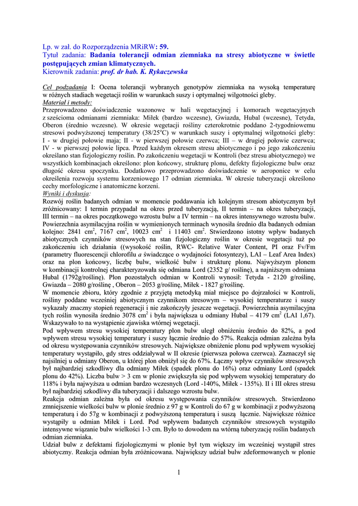 Lp. w zał. do Rozporządzenia MRiRW: 59. Tytuł zadania: Badania tolerancji odmian ziemniaka na stresy abiotyczne w świetle postępujących zmian klimatycznych. Kierownik zadania: prof. dr hab. K. Rykaczewska Cel podzadania I: Ocena tolerancji wybranych genotypów ziemniaka na wysoką temperaturę w różnych stadiach wegetacji roślin w warunkach suszy i optymalnej wilgotności gleby. Materiał i metody: Przeprowadzono doświadczenie wazonowe w hali wegetacyjnej i komorach wegetacyjnych z sześcioma odmianami ziemniaka: Miłek (bardzo wczesne), Gwiazda, Hubal (wczesne), Tetyda, Oberon (średnio wczesne). W okresie wegetacji rośliny czterokrotnie poddano 2-tygodniowemu stresowi podwyższonej temperatury (38/25oC) w warunkach suszy i optymalnej wilgotności gleby: I - w drugiej połowie maja; II - w pierwszej połowie czerwca; III – w drugiej połowie czerwca; IV - w pierwszej połowie lipca. Przed każdym okresem stresu abiotycznego i po jego zakończeniu określano stan fizjologiczny roślin. Po zakończeniu wegetacji w Kontroli (bez stresu abiotycznego) we wszystkich kombinacjach określono: plon końcowy, strukturę plonu, defekty fizjologiczne bulw oraz długość okresu spoczynku. Dodatkowo przeprowadzono doświadczenie w aeroponice w celu określenia rozwoju systemu korzeniowego 17 odmian ziemniaka. W okresie tuberyzacji określono cechy morfologiczne i anatomiczne korzeni. Wyniki i dyskusja: Rozwój roślin badanych odmian w momencie poddawania ich kolejnym stresom abiotycznym był zróżnicowany: I termin przypadał na okres przed tuberyzacją, II termin – na okres tuberyzacji, III termin – na okres początkowego wzrostu bulw a IV termin – na okres intensywnego wzrostu bulw. Powierzchnia asymilacyjna roślin w wymienionych terminach wynosiła średnio dla badanych odmian kolejno: 2841 cm2, 7167 cm2, 10023 cm2 i 11403 cm2. Stwierdzono istotny wpływ badanych abiotycznych czynników stresowych na stan fizjologiczny roślin w okresie wegetacji tuż po zakończeniu ich działania ((wysokość roślin, RWC- Relative Water Content, PI oraz Fv/Fm (parametry fluorescencji chlorofilu a świadczące o wydajności fotosyntezy), LAI – Leaf Area Index) oraz na plon końcowy, liczbę bulw, wielkość bulw i strukturę plonu. Najwyższym plonem w kombinacji kontrolnej charakteryzowała się odmiana Lord (2352 g/ roślinę), a najniższym odmiana Hubal (1792g/roślinę). Plon pozostałych odmian w Kontroli wynosił: Tetyda - 2120 g/roślinę, Gwiazda – 2080 g/roślinę , Oberon – 2053 g/roślinę, Miłek - 1827 g/roślinę. W momencie zbioru, który zgodnie z przyjętą metodyką miał miejsce po dojrzałości w Kontroli, rośliny poddane wcześniej abiotycznym czynnikom stresowym – wysokiej temperaturze i suszy wykazały znaczny stopień regeneracji i nie zakończyły jeszcze wegetacji. Powierzchnia asymilacyjna tych roślin wynosiła średnio 3078 cm2 i była największa u odmiany Hubal – 4179 cm2 (LAI 1,67). Wskazywało to na wystąpienie zjawiska wtórnej wegetacji. Pod wpływem stresu wysokiej temperatury plon bulw uległ obniżeniu średnio do 82%, a pod wpływem stresu wysokiej temperatury i suszy łącznie średnio do 57%. Reakcja odmian zależna była od okresu występowania czynników stresowych. Największe obniżenie plonu pod wpływem wysokiej temperatury wystąpiło, gdy stres oddziaływał w II okresie (pierwsza połowa czerwca). Zaznaczył się najsilniej u odmiany Oberon, u której plon obniżył się do 67%. Łączny wpływ czynników stresowych był najbardziej szkodliwy dla odmiany Miłek (spadek plonu do 16%) oraz odmiany Lord (spadek plonu do 42%). Liczba bulw > 3 cm w plonie zwiększyła się pod wpływem wysokiej temperatury do 118% i była najwyższa u odmian bardzo wczesnych (Lord -140%, Miłek - 135%). II i III okres stresu był najbardziej szkodliwy dla tuberyzacji i dalszego wzrostu bulw. Reakcja odmian zależna była od okresu występowania czynników stresowych. Stwierdzono zmniejszenie wielkości bulw w plonie średnio z 97 g w Kontroli do 67 g w kombinacji z podwyższoną temperaturą i do 57g w kombinacji z podwyższoną temperaturą i suszą łącznie. Największe różnice wystąpiły u odmian Miłek i Lord. Pod wpływem badanych czynników stresowych wystąpiło intensywne wiązanie bulw wielkości 1-3 cm. Było to dowodem na wtórną tuberyzację roślin badanych odmian ziemniaka. Udział bulw z defektami fizjologicznymi w plonie był tym większy im wcześniej wystąpił stres abiotyczny. Reakcja odmian była zróżnicowana. Największy udział bulw zdeformowanych w plonie 1 wystąpił u odmiany Hubal – 40,0% w przypadku stresu wysokiej temperatury, a najmniejszy u odmiany Tetyda (średnio 3%). Najpoważniejszym defektem plonu była obecność bulw chronologicznie młodszych – niedojrzałych, z bardzo cienką skórką. Im wcześniej wystąpił stres abiotyczny, tym udział bulw chronologicznie młodszych w plonie był większy. Spoczynek bulw badanych odmian w Kontroli kończył się między 5 września a 25 października. Stres wysokiej temperatury i suszy oddziaływujący na rośliny w I i II okresie powodował wydłużenie spoczynku dochodzące do 54 dni (Tetyda), ale stres ten działający na rośliny w III i IV okresie spowodował znaczne skrócenie spoczynku bulw dochodzące do 46 dni (Miłek). Rozwój systemu korzeniowego badanych odmian ziemniaka roślin rosnących w urządzeniu do aeroponicznej produkcji bulw był wysoce istotnie zróżnicowany. Długość korzeni 17 badanych odmian ziemniaka w czasie tuberyzacji (11 lipca) wynosiła średnio 82,6 cm i wahała się od 109,3 cm u odmiany Hubal do 44,0 cm u odmiany Miłek. Uszeregowanie odmian pod względem długości korzeni jest następujące: Hubal, Michalina, Kuba, Gandawa, Stasia, Denar, Etiuda, Justa, Aruba, Tetyda, Lord, Gwiazda, Etola, Oberon, Bila Finezja, Miłek. Nie stwierdzono istotnej korelacji między długością a masą korzeni badanych odmian (współczynnik 
