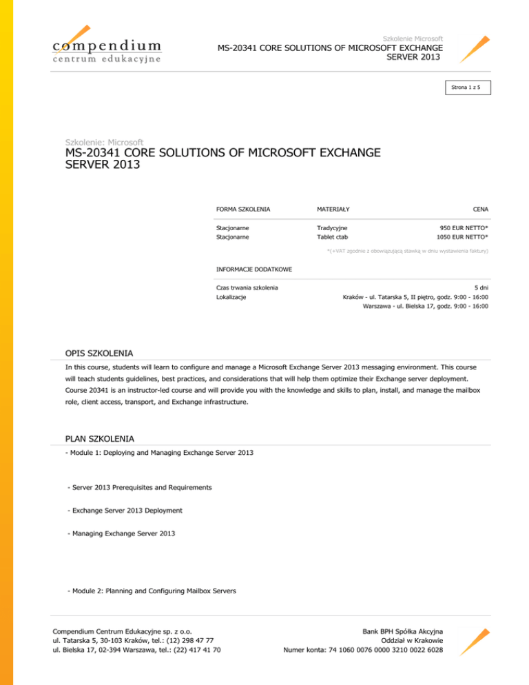 Szkolenie Microsoft MS-20341 CORE SOLUTIONS OF MICROSOFT EXCHANGE SERVER 2013 Strona 1 z 5 Szkolenie: Microsoft MS-20341 CORE SOLUTIONS OF MICROSOFT EXCHANGE SERVER 2013 FORMA SZKOLENIA MATERIAŁY CENA Stacjonarne Tradycyjne 950 EUR NETTO* Stacjonarne Tablet ctab 1050 EUR NETTO* *(+VAT zgodnie z obowiązującą stawką w dniu wystawienia faktury) INFORMACJE DODATKOWE Czas trwania szkolenia Lokalizacje 5 dni Kraków - ul. Tatarska 5, II piętro, godz. 9:00 - 16:00 Warszawa - ul. Bielska 17, godz. 9:00 - 16:00 OPIS SZKOLENIA In this course, students will learn to configure and manage a Microsoft Exchange Server 2013 messaging environment. This course will teach students guidelines, best practices, and considerations that will help them optimize their Exchange server deployment. Course 20341 is an instructor-led course and will provide you with the knowledge and skills to plan, install, and manage the mailbox role, client access, transport, and Exchange infrastructure. PLAN SZKOLENIA - Module 1: Deploying and Managing Exchange Server 2013 - Server 2013 Prerequisites and Requirements - Exchange Server 2013 Deployment - Managing Exchange Server 2013 - Module 2: Planning and Configuring Mailbox Servers Compendium Centrum Edukacyjne sp. z o.o. ul. Tatarska 5, 30-103 Kraków, tel.: (12) 298 47 77 ul. Bielska 17, 02-394 Warszawa, tel.: (22) 417 41 70 Bank BPH Spółka Akcyjna Oddział w Krakowie Numer konta: 74 1060 0076 0000 3210 0022 6028 Szkolenie Microsoft MS-20341 CORE SOLUTIONS OF MICROSOFT EXCHANGE SERVER 2013 Strona 2 z 5 - Overview of the Mailbox Server Role - Planning the Mailbox Server Deployment - Configuring Mailbox Servers - Module 3: Managing Recipient Objects - Managing Exchange Server 2013 Recipients - Managing Exchange Recipients - Managing Address Lists and Policies on Mailbox Server Role - Module 4: Planning and Deploying Client Access Servers - Planning Client Access Server Deployment - Configuring the Client Access Server Role - Managing Client Access Services - Module 5: Planning and Configuring Messaging Client Connectivity - Client Connectivity to Client Access Server - Configuring Outlook Web App - Planning and Configuring Mobile Messaging Compendium Centrum Edukacyjne sp. z o.o. ul. Tatarska 5, 30-103 Kraków, tel.: (12) 298 47 77 ul. Bielska 17, 02-394 Warszawa, tel.: (22) 417 41 70 Bank BPH Spółka Akcyjna Oddział w Krakowie Numer konta: 74 1060 0076 0000 3210 0022 6028 Szkolenie Microsoft MS-20341 CORE SOLUTIONS OF MICROSOFT EXCHANGE SERVER 2013 Strona 3 z 5 - Configuring Secure Internet Access for Client Access Server - Configuring Secure Internet Access for Client Access Server - Module 6: Planning and Configuring Message Transport - Overview of Message Transport - Planning and Configuring Message Transport - Managing Transport Rules - Module 7: Planning and Implementing High Availability - High Availability on Exchange Server 2013 - Configuring Highly Available Mailbox Databases - Configuring Highly Available Client Access Servers - Module 8: Planning and Implementing Disaster Recovery - Planning for Disaster Mitigation - Planning and Implementing Exchange Server 2013 Backup - Planning and Implementing Exchange Server 2013 Recovery Compendium Centrum Edukacyjne sp. z o.o. ul. Tatarska 5, 30-103 Kraków, tel.: (12) 298 47 77 ul. Bielska 17, 02-394 Warszawa, tel.: (22) 417 41 70 Bank BPH Spółka Akcyjna Oddział w Krakowie Numer konta: 74 1060 0076 0000 3210 0022 6028 Szkolenie Microsoft MS-20341 CORE SOLUTIONS OF MICROSOFT EXCHANGE SERVER 2013 Strona 4 z 5 - Module 9: Planning and Configuring Message Security Options - Planning Messaging Security - Implementing an Antivirus Solution for Exchange Server 2013 - Implementing an Antispam Solution for Exchange Server 2013 - Module 10: Planning and Configuring Administrative Security and Auditing - Configuring Role-Based Access Control - Configuring Audit Logging - Module 11: Monitoring and Troubleshooting Exchange Server 2013 - Monitoring Exchange Server 2013 - Maintaining Exchange Server 2013 - Troubleshooting Exchange Server 2013 WYMAGANIA DLA UCZESTNIKA Before attending this course, students must have: - Minimum of two years of experience administering Windows Server, including Windows Server 2008 R2 or Windows Server 2012. - Minimum of two years of experience working with Active Directory Domain Services (AD DS). - Minimum of two years of experience working with name resolution, including DNS. Compendium Centrum Edukacyjne sp. z o.o. ul. Tatarska 5, 30-103 Kraków, tel.: (12) 298 47 77 ul. Bielska 17, 02-394 Warszawa, tel.: (22) 417 41 70 Bank BPH Spółka Akcyjna Oddział w Krakowie Numer konta: 74 1060 0076 0000 3210 0022 6028 Szkolenie Microsoft MS-20341 CORE SOLUTIONS OF MICROSOFT EXCHANGE SERVER 2013 Strona 5 z 5 - Experience working with certificates, including PKI certificates. CERTYFIKATY The participants will obtain Microsoft certificates. PROWADZĄCY Microsoft Certified Trainer. Compendium Centrum Edukacyjne sp. z o.o. ul. Tatarska 5, 30-103 Kraków, tel.: (12) 298 47 77 ul. Bielska 17, 02-394 Warszawa, tel.: (22) 417 41 70 Bank BPH Spółka Akcyjna Oddział w Krakowie Numer konta: 74 1060 0076 0000 3210 0022 6028