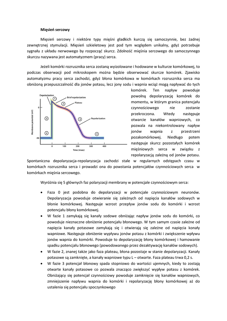 Mięsień sercowy Mięsień sercowy i niektóre typy mięśni gładkich kurczą się samoczynnie, bez żadnej zewnętrznej stymulacji. Mięsień szkieletowy jest pod tym względem unikalny, gdyż potrzebuje sygnału z układu nerwowego by rozpocząć skurcz. Zdolność mięśnia sercowego do samoczynnego skurczu nazywana jest automatyzmem (pracy) serca. Jeżeli komórki rozrusznika serca zostaną wyizolowane i hodowane w kulturze komórkowej, to podczas obserwacji pod mikroskopem można będzie obserwować skurcze komórek. Zjawisko automatyzmu pracy serca zachodzi, gdyż błona komórkowa w komórkach rozrusznika serca ma obniżoną przepuszczalność dla jonów potasu, lecz jony sodu i wapnia wciąż mogą napływać do tych komórek. Ten napływ powoduje powolną depolaryzację komórek do momentu, w którym granica potencjału czynnościowego nie zostanie przekroczona. Wtedy następuje otwarcie kanałów wapniowych, co pozwala na niekontrolowany napływ jonów wapnia z przestrzeni pozakomórkowej. Niedługo potem następuje skurcz pozostałych komórek mięśniowych serca w związku z repolaryzacją zależną od jonów potasu. Spontaniczna depolaryzacja-repolaryzacja zachodzi stale w regularnych odstępach czasu w komórkach rozrusznika serca i prowadzi ona do powstania potencjałów czynnościowych serca w komórkach mięśnia sercowego. Wyróżnia się 5 głównych faz polaryzacji membrany w potencjale czynnościowym serca: Faza 0 jest podobna do depolaryzacji w potencjale czynnościowym neuronów. Depolaryzacja powoduje otwieranie się zależnych od napięcia kanałów sodowych w błonie komórkowej. Następuje wzrost przepływ jonów sodu do komórki i wzrost potencjału błony komórkowej. W fazie 1 zamykają się kanały sodowe obniżając napływ jonów sodu do komórki, co powoduje nieznaczne obniżenie potencjału błonowego. W tym samym czasie zależne od napięcia kanały potasowe zamykają się i otwierają się zależne od napięcia konały wapniowe. Następuje obniżenie wypływu jonów potasu z komórki i zwiększenie wpływu jonów wapnia do komórki. Powoduje to depolaryzację błony komórkowej i hamowanie spadku potencjału błonowego (powodowanego przez dezaktywację kanałów sodowych). W fazie 2, znanej także jako faza plateau, błona pozostaje w stanie depolaryzacji. Kanały potasowe są zamknięte, a kanały wapniowe typu L – otwarte. Faza plateau trwa 0,2 s. W fazie 3 potencjał błonowy spada stopniowo do wartości ujemnych, kiedy to zostają otwarte kanały potasowe co pozwala znacząco zwiększyć wypływ potasu z komórek. Obniżający się potencjał czynnościowy powoduje zamknięcie się kanałów wapniowych, zmniejszenie napływu wapnia do komórki i repolaryzację błony komórkowej aż do ustalenia się potencjału spoczynkowego W fazie 4 potencjał spoczynkowy jest osiągnięty w mięśniu sercowym i jest utrzymywany aż do następnej fali depolaryzacji z komórek rozrusznika serca. W przypadku mięśni szkieletowych może nastąpić sumowanie się bodźców (związane jest to ze zjawiskiem refrakcji względnej) i wtedy skurcz takiego mięśnia jest dużo mocniejszy niż skurcz w wyniku pojedynczego bodźca. Kiedy bodźce są oddzielone bardzo krótkimi przerwami mięsień może osiągać stan stężenia, kiedy skurcze pomiędzy poszczególnymi bodźcami nie są już rozróżnialne. Takie stężenie występuje w mięśniach szkieletowych, gdyż mają one stosunkowo krótki całkowity okres refrakcji (okres, w trakcie którego potencjały czynnościowe nie mogą być wytworzone, niezależnie od siły bodźca). Mięsień sercowy ma z kolei relatywnie długi okres refrakcji i w związku z tym nie występuje w nim zjawisko sumowania siły bodźców. Zasadniczo mięsień sercowy nie jest w stanie zareagować na jakikolwiek bodziec, dopóki nie osiągnie połowy fazy 3. Czas pomiędzy zapoczątkowaniem potencjału czynnościowego serca, a połową fazy 3 jest całkowitym okresem refrakcji. Czas pomiędzy środkiem fazy 3 a fazą 4 jest zwany względnym okresem refrakcji. Całkowity okres refrakcji w mięśniu sercowym wynosi 0,2 – 0,25 s. – niemalże tyle, ile sam skurcz. Autonomiczny układ nerwowy ma dwa odgałęzienia: współczulny układ nerwowy i przywspółczulny układ nerwowy. Podczas spoczynku obie gałęzie układu nerwowego pracują, lecz układ przywspółczulny jest bardziej aktywny. Współczulny układ nerwowy staje się bardziej aktywny wtedy, gdy jest potrzebny, na przykład: podczas ćwiczeń lub w niebezpieczeństwie. Serce odbiera impulsy zarówno ze współczulnego jak i przywspółczulnego układu nerwowego. Stymulacja serca ze współczulnego układu nerwowego zwiększa częstotliwość i siłę skurczów serca. Stymulacja serca ze strony przywspółczulnego układu nerwowego obniża częstotliwość pracy serca bez zmiany siły skurczu serca. Nerw błędny (nerw czaszkowy X) doprowadza sygnał do serca. Jeśli stymulacja nerwu błędnego jest zbyt intensywna, serce może przestać bić. Po krótkim czasie komory znów zaczną bić. Wznowienie pracy serca nazywane jest ucieczką nerwu błędnego i może być wynikiem aktywności układu współczulnego lub inicjacją pracy serca z włókien Purkiniego. Węzeł przedsionkowy jest zespołem komórek w ścianie prawego przedsionka serca. Węzeł ten ma największą szybkość spontanicznej depolaryzacji i z tego względu jest nazywany rozrusznikiem serca. Przy braku stymulacji z układu przywspółczulnego, układu współczulnego i układu hormonalnego, węzeł przedsionkowy generuje potencjał czynnościowy ok. 100 razy na minutę. Pomimo, że serce nie potrzebuje informacji z zewnątrz by bić, może być poddane zewnętrznym wpływom, zwłaszcza z autonomicznego układu nerwowego. Współczulny układ nerwowy i współczulne włókna nerwowe wydzielają norepinefrynę (znaną także jako noradrenalina) i epinefrynę (adrenalinę) z synaps. Norepinefryna i epinefryna zwięk