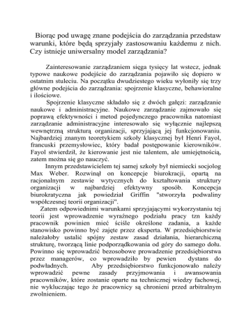 Biorąc pod uwagę znane podejścia do zarządzania przedstaw warunki, które będą sprzyjały zastosowaniu każdemu z nich. Czy istnieje uniwersalny model zarządzania? Zainteresowanie zarządzaniem sięga tysięcy lat wstecz, jednak typowe naukowe podejście do zarządzania pojawiło się dopiero w ostatnim stuleciu. Na początku dwudziestego wieku wyłoniły się trzy główne podejścia do zarządzania: spojrzenie klasyczne, behawioralne i ilościowe. Spojrzenie klasyczne składało się z dwóch gałęzi: zarządzanie naukowe i administracyjne. Naukowe zarządzanie zajmowało się poprawą efektywności i metod pojedynczego pracownika natomiast zarządzanie administracyjne interesowało się wyłącznie najlepszą wewnętrzną strukturą organizacji, sprzyjającą jej funkcjonowaniu. Najbardziej znanym teoretykiem szkoły klasycznej był Henri Fayol, francuski przemysłowiec, który badał postępowanie kierowników. Fayol stwierdził, że kierowanie jest nie talentem, ale umiejętnością, zatem można się go nauczyć. Innym przedstawicielem tej samej szkoły był niemiecki socjolog Max Weber. Rozwinął on koncepcje biurokracji, opartą na racjonalnym zestawie wytycznych do kształtowania struktury organizacji w najbardziej efektywny sposób. Koncepcja biurokratyczna jak powiedział Griffin "stworzyła podwaliny współczesnej teorii organizacji". Zatem odpowiednimi warunkami sprzyjającymi wykorzystaniu tej teorii jest wprowadzenie wyraźnego podziału pracy tzn każdy pracownik powinien mieć ściśle określone zadania, a każde stanowisko powinno być zajęte przez eksperta. W przedsiębiorstwie należałoby ustalić spójny zestaw zasad działania, hierarchiczną strukturę, tworzącą linie podporządkowania od góry do samego dołu. Powinno się wprowadzić bezosobowe prowadzenie przedsiębiorstwa przez managerów, co wprowadziło by pewien dystans do podwładnych. Aby przedsiębiorstwo funkcjonowało należy wprowadzić pewne zasady przyjmowania i awansowania pracowników, które zostanie oparte na technicznej wiedzy fachowej, nie wykluczając tego że pracownicy są chronieni przed arbitralnym zwolnieniem. Podczas gdy w nurcie klasycznym przywiązywano wagę wyłącznie do aspektów technicznych działania organizacji, szkoła behawioralna zwraca się w kierunku człowieka. Spojrzenie behawioralne rozwijane było przez wielu autorów i przedstawicieli kierunków teoretycznych. Najwybitniejszym przedstawicielem tego kierunku był Elton Mayo, który prowadził doświadczenia w firmie Western Electric. Eksperymenty, znane dziś pod nazwa "eksperymentów Hawthorne", doprowadziły do ważnego wniosku: ludzkie zachowanie ma ogromne znaczenie w miejscu pracy. W eksperymencie dowiedziono iż motywującą rolę dla pracownika ma nadzór nad wykonywanymi zadaniami. Duże znaczenie ma także wpływ nieformalnych grup (np. związki zawodowe). Dzięki behawiorystom udało się przejść od koncepcji technicznej do podejścia społecznego, podkreślono znaczenie kształtowania się stosunków międzyludzkich w miejscu pracy. Douglas McGregor wyróżnił dwa założenia, dotyczące zachowań pracowników: teorię X i Y. Założenie teorii X zakłada, że pracownicy są z gruntu leniwi i nie lubią przejmować inicjatywy. Zatem praca jest dla nich czymś nie przyjemnym, dlatego należy ich motywować siłą , pieniędzmi albo pochwałami. Natomiast teoria Y zakłada, że ludzie z natury są motywowani do pracy i do dobrego wykonywania zadań. Jednak McGregor stwierdził, że w latach 50-tych XX wieku kierowanie według teorii Y zostało przytłumione spojrzeniem tradycyjnym (teoria X). Jeżeli firma miała by być kierowana zgodnie z zasadami behawioryzmu menadżerowie w odpowiedni sposób powinni wytyczyć wspólne cele dla pracowników i kadry kierowniczej (wzajemne wspieranie się pracowników). A co za tym idzie podwładni winni mieć zaufanie do pracodawców jak i pracodawcy do podwładnych. W firmie takiej proces decyzyjny powinien zostać zdecentralizowany np. podczas wprowadzenia nowej linii produkcyjnej już wytwarzanego wyrobu nie powinien decydować tylko główny technolog ale także pracownicy ponieważ oni mają już swoje metody pracy, które im ją ułatwiają a nawet poprawiają szybkość i pewność montażu. Należało by również wprowadzić odpowiedni system karania i wynagradzania pracowników. Najnowszą z trzech głównych szkół myślenia o zarządzaniu jest spojrzenie ilościowe. Spojrzenie ilościowe powstało stosunkowo późno, bo dopiero w czasie II wojny światowej. Jest to podejście do zarządzania, w którym stosuje się techniki ilościowe (matematyczne), wykorzystując obliczenia i modele komputerowe. Wyróżniamy tu dwie szkoły: ilościową teorię zarządzania oraz zarządzanie operacyjne. Ilościowa teoria zarządzania koncentruje się na opracowaniu modeli matematycznych, natomiast zarządzanie operacyjne zajmuje się wspomaganiem organizacji w efektywnym wytwarzaniu produktów i usług. Aby w odpowiedni sposób wykorzystać założenia teorii ilościowej należałoby w firmie stworzyć odpowiednie zespoły specjalistów z różnych dziedzin, które analizowały by dane sytuacje i przedstawiały propozycje działań. Przykładowo firma ma zamiar produkować nowy wyrób, zespół specjalistów powinien określić czy na danym rynku jest popyt, jaką należy zastosować linie produkcyjną aby wyprodukować tyle towarów by nie zalegały one na magazynach. Decyzje te są podejmowane na podstawie modeli matematycznych. Czy istnieje uniwersalny model zarządzania? Ja uważam, że nie ma uniwersalnego modelu zarządzania. Firmy maja różne cele na rynku, różne zobowiązania, funkcjonują w różnych społecznościach i warunkach ekonomicznych. Trudno jest zadowolić wszystkich stosując tylko jeden model zarządzania. Każda z przedstawionych powyżej teorii, w zależności od istniejących realiów jest poprawna. Według mnie zarządzanie firm
