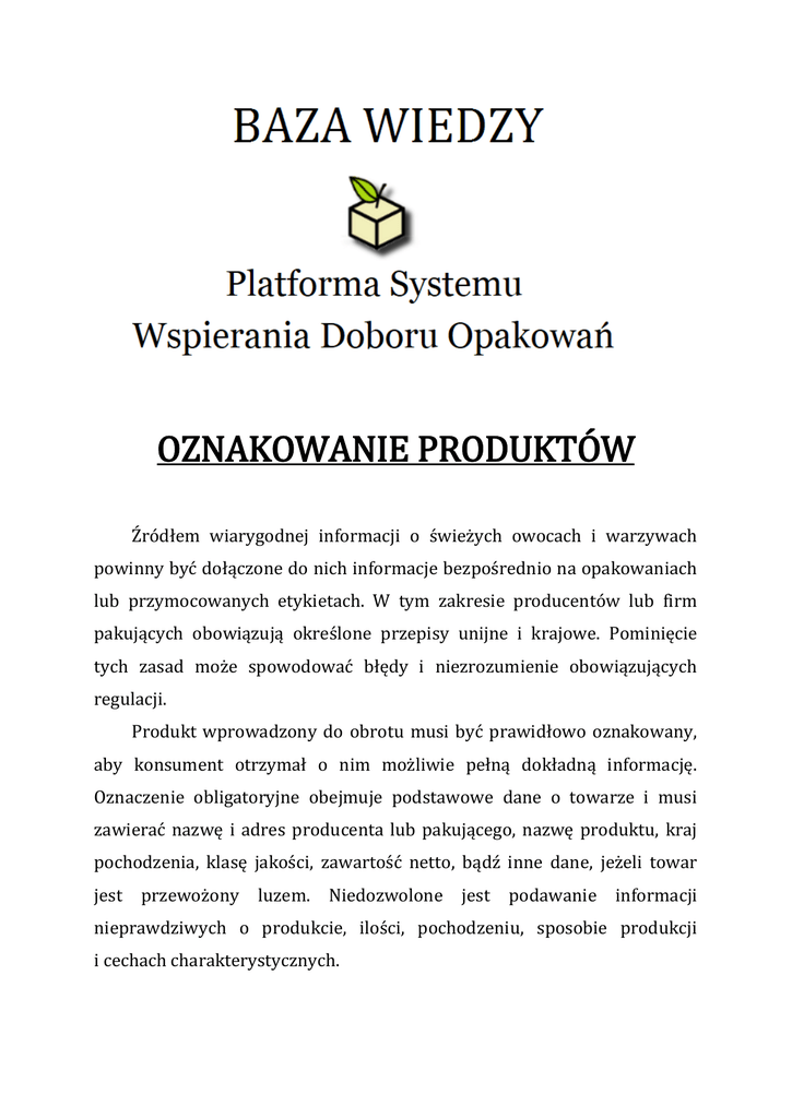 OZNAKOWANIE PRODUKTÓW Źródłem wiarygodnej informacji o świeżych owocach i warzywach powinny być dołączone do nich informacje bezpośrednio na opakowaniach lub przymocowanych etykietach. W tym zakresie producentów lub firm pakujących obowiązują określone przepisy unijne i krajowe. Pominięcie tych zasad może spowodować błędy i niezrozumienie obowiązujących regulacji. Produkt wprowadzony do obrotu musi być prawidłowo oznakowany, aby konsument otrzymał o nim możliwie pełną dokładną informację. Oznaczenie obligatoryjne obejmuje podstawowe dane o towarze i musi zawierać nazwę i adres producenta lub pakującego, nazwę produktu, kraj pochodzenia, klasę jakości, zawartość netto, bądź inne dane, jeżeli towar jest przewożony luzem. Niedozwolone jest podawanie informacji nieprawdziwych o produkcie, ilości, pochodzeniu, sposobie produkcji i cechach charakterystycznych. 2 Oznaczenie obligatoryjne ma zawierać nazwę i adres producenta lub pakującego, nazwę produktu, kraj pochodzenia, klasę jakości i zawartość netto. Środki spożywcze wprowadzone do obrotu powinny być znakowane. Ten wymóg zawiera art. 45 ust. 1 ustawy z 25 sierpnia 2006 r. ( Dz.U., 2010 r., nr 136, poz.914 z późn. zm.). Produkty przygotowane do sprzedaży powinny być oznakowane według szczegółowych zasad które stanowią: Rozporządzenie wykonawcze Komisji UE nr 543/2011 z 7 czerwca 2011 roku w odniesieniu do sektora owoców i warzyw oraz sektora przetworzonych owoców i warzyw (Dz. Urz. UE L 157 z 15 czerwca 2011 r. z późn. zm.). Rozporządzenie Ministra Rolnictwa i Rozwoju Wsi z 10 lipca 2007 r. w sprawie znakowania środków spożywczych (Dz. U. z 2007 r. nr 137, poz. 966 z późn. zm.). 3 Produkty świeże, nieprzeznaczone do przetwórstwa, powinny mieć czytelne informacje podane w widocznym miejscu, w formie nieusuwalnego nadruku umieszczonego na jednej stronie opakowania lub na etykiecie, która powinna stanowić integralną część opakowania lub być do niego przymocowana. Oznakowanie winno być użyteczne i zrozumiałe. Pierwszeństwo przed przepisami krajowymi mają regulacje UE. Artykuły rolno-spożywcze należy oznaczyć w języku polskim, w sposób czytelny, zrozumiały i widoczny. Każdy artykuł wprowadzony do obrotu trzeba oznakować umieszczające: nazwę odmiany, wybór, masę, nazwę dostawy i datę pakowania. Najważniejsze są oznaczenia obligatoryjne, prawnie wymagane i niezbędne, aby towar mógł być wprowadzony do obrotu. Oznakowania nieobligatoryjne mogą służyć celom edukacyjnym, ale też czysto promocyjnym – stanowić reklamę sprzedawanego towaru. 4 Obejmują one podstawowe informacje dotyczące towaru, takie jak: nazwa produktu, kraj pochodzenia, klasa jakości, dane producenta, zawartość netto. Ważną rolę pełnią jednak również inne oznakowania, tzw. nieobligatoryjne, a więc dobrowolnie stosowane przez sprzedającego, np. o charakterze promocyjnym czy edukacyjnym. W ten sposób można zareklamować produkt, co korzystnie wpłynie na jego pozycję na rynku. Znaki informacyjne i reklamowe oraz znaki rozpoznawcze umieszczone na opakowaniach transportowych umożliwiają identyfikację towarów w całym cyklu logistycznym. Brak znakowania może spowodować kłopoty organizacyjne, a nawet doprowadzić do strat ilościowych bądź jakościowych, wskutek opóźnienia dostaw świeżych owoców i warzyw, tym bardziej że na jednej palecie dostarcza się niekiedy różne gatunki. Szczególną uwagę warto zwrócić na promocję produktów eksportowanych z Polski. W UE funkcjonuje system certyfikacji, który ma na celu ochronę nazw produktów regionalnych i tradycyjnych oraz zapewnienie ich atrakcyjności. Znane są produkty oznaczone certyfikatem, np. „Chroniona Nazwa Pochodzenia”, „Chronione Oznaczenie Geograficzne”. Rejestracja produktu we wspólnotowym systemie jest dla konsumenta gwarancją jakości i bezpieczeństwa żywności. Aby atrakcyjne produkty oznaczone certyfikatem UE trafiły do odbiorcy w kraju lub na rynek Zachodniej Europy muszą być umieszczone w standardowych opakowaniach. Więcej na temat znakowania: Hasło Ogrodnicze nr 3/2012. dr inż. Tadeusz Cąderek © COBRO