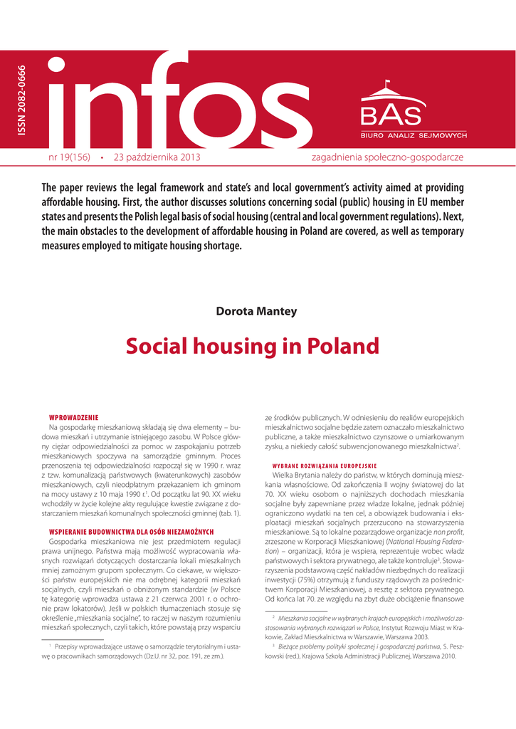 ISSN 2082‑0666 nr 19(156) • 23 października 2013 zagadnienia społeczno‑gospodarcze The paper reviews the legal framework and state’s and local government’s activity aimed at providing affordable housing. First, the author discusses solutions concerning social (public) housing in EU member states and presents the Polish legal basis of social housing (central and local government regulations). Next, the main obstacles to the development of affordable housing in Poland are covered, as well as temporary measures employed to mitigate housing shortage. Dorota Mantey Social housing in Poland Wprowadzenie Na gospodarkę mieszkaniową składają się dwa elementy – budowa mieszkań i utrzymanie istniejącego zasobu. W Polsce główny ciężar odpowiedzialności za pomoc w zaspokajaniu potrzeb mieszkaniowych spoczywa na samorządzie gminnym. Proces przenoszenia tej odpowiedzialności rozpoczął się w 1990 r. wraz z tzw. komunalizacją państwowych (kwaterunkowych) zasobów mieszkaniowych, czyli nieodpłatnym przekazaniem ich gminom na mocy ustawy z 10 maja 1990 r.1. Od początku lat 90. XX wieku wchodziły w życie kolejne akty regulujące kwestie związane z dostarczaniem mieszkań komunalnych społeczności gminnej (tab. 1). Wspieranie budownictwa dla osób niezamożnych Gospodarka mieszkaniowa nie jest przedmiotem regulacji prawa unijnego. Państwa mają możliwość wypracowania własnych rozwiązań dotyczących dostarczania lokali mieszkalnych mniej zamożnym grupom społecznym. Co ciekawe, w większości państw europejskich nie ma odrębnej kategorii mieszkań socjalnych, czyli mieszkań o obniżonym standardzie (w Polsce tę kategorię wprowadza ustawa z 21 czerwca 2001 r. o ochronie praw lokatorów). Jeśli w polskich tłumaczeniach stosuje się określenie „mieszkania socjalne”, to raczej w naszym rozumieniu mieszkań społecznych, czyli takich, które powstają przy wsparciu Przepisy wprowadzające ustawę o samorządzie terytorialnym i ustawę o pracownikach samorządowych (Dz.U. nr 32, poz. 191, ze zm.). 1 ze środków publicznych. W odniesieniu do realiów europejskich mieszkalnictwo socjalne będzie zatem oznaczało mieszkalnictwo publiczne, a także mieszkalnictwo czynszowe o umiarkowanym zysku, a niekiedy całość subwencjonowanego mieszkalnictwa2. Wybrane rozwiązania europe jskie Wielka Brytania należy do państw, w których dominują mieszkania własnościowe. Od zakończenia II wojny światowej do lat 70. XX wieku osobom o najniższych dochodach mieszkania socjalne były zapewniane przez władze lokalne, jednak później ograniczono wydatki na ten cel, a obowiązek budowania i eksploatacji mieszkań socjalnych przerzucono na stowarzyszenia mieszkaniowe. Są to lokalne pozarządowe organizacje non profit, zrzeszone w Korporacji Mieszkaniowej (National Housing Federation) – organizacji, która je wspiera, reprezentuje wobec władz państwowych i sektora prywatnego, ale także kontroluje3. Stowarzyszenia podstawową część nakładów niezbędnych do realizacji inwestycji (75%) otrzymują z funduszy rządowych za pośrednictwem Korporacji Mieszkaniowej, a resztę z sektora prywatnego. Od końca lat 70. ze względu na zbyt duże obciążenie finansowe 2 Mieszkania socjalne w wybranych krajach europejskich i możliwości zastosowania wybranych rozwiązań w Polsce, Instytut Rozwoju Miast w Krakowie, Zakład Mieszkalnictwa w Warszawie, Warszawa 2003. 3 Bieżące problemy polityki społecznej i gospodarczej państwa, S. Peszkowski (red.), Krajowa Szkoła Administracji Publicznej, Warszawa 2010. Tab. 1. Ustawy regulujące gospodarkę mieszkaniową w gminach Ustawa Zmiany wprowadzone przez ustawę Ustawa z 2 lipca 1994 r. o najmie lokali Ustawa przenosi z poziomu centralnego na poziom gminny obowiązek kształtowania polityki czynszowej mieszkalnych i dodatkach mieszkanio‑ oraz odpowiedzialność za pomoc w zaspokajaniu potrzeb mieszkaniowych najsłabszych grup ludności wych zamieszkujących na terenie gminy. Ustawa nakłada na gminy nowe zadanie własne – obowiązek wypłacania dodatków mieszkaniowych, na które gminy otrzymują dotacje celowe z budżetu państwa w granicach kwot określonych na ten cel w ustawie budżetowej. Ustawa z 26 października 1995 r. o nie‑ Ustawa daje gminom możliwość uzyskania preferencyjnego kredytu na rozbudowę infrastruktury pod których formach popierania budownic‑ budownictwo mieszkaniowe, a także reguluje kwestie zakładania i funkcjonowania towarzystw budowtwa mieszkaniowego oraz zmieniająca ją nictwa społecznego (również tych z udziałem gmin). ustawa z 19 sierpnia 2011 r. Ustawa z 21 czerwca 2001 r. o dodatkach Ustawa uchyla przepisy ustawy z 1994 r. o najmie lokali mieszkalnych i dodatkach mieszkaniowych dotymieszkaniowych czące kwestii dodatków mieszkaniowych i wprowadza ich nowelizację (planuje się stopniowe likwidowanie pomocy mieszkańcom przyznawanej w formie dodatków mieszkaniowych). Ustawa z 21 czerwca 2001 r. o ochronie praw lokatorów, mieszkaniowym zaso‑ bie gminy i o zmianie Kodeksu cywilne‑ go wraz z późniejszymi zmianami (ustawy zmieniające tę ustawę z 2009 r. i 2011 r.) oraz obowiązującym od 1 stycznia 2007 r. nowym art. 18 dotyczącym wysokości odszkodowań Ustawa określa zasady gospodarowania zasobem mieszkaniowym gminy. Gmina powinna zaspokajać potrzeby mieszkaniowe gospodarstw domowych o niskich dochodach, m.in. tworząc i wykorzystując w tym celu mieszkaniowy zasób gminy, a także zarządzać i dysponować własnym zasobem mieszkań. Do zadań gminy należy wydzielenie z zasobu mieszkaniowego części lokali, które przeznacza się na wynajem jako lokale socjalne. Umowę najmu lokalu socjalnego zawiera się na czas oznaczony (w przeciwieństwie do lokali komunalnych, które otrzymuje się na czas nieokreślony) z osobą, która nie ma tytułu prawnego do lokalu i której dochody gospodarstwa domowego nie przekraczają wysokości określonej w uchwale rady gminy. 