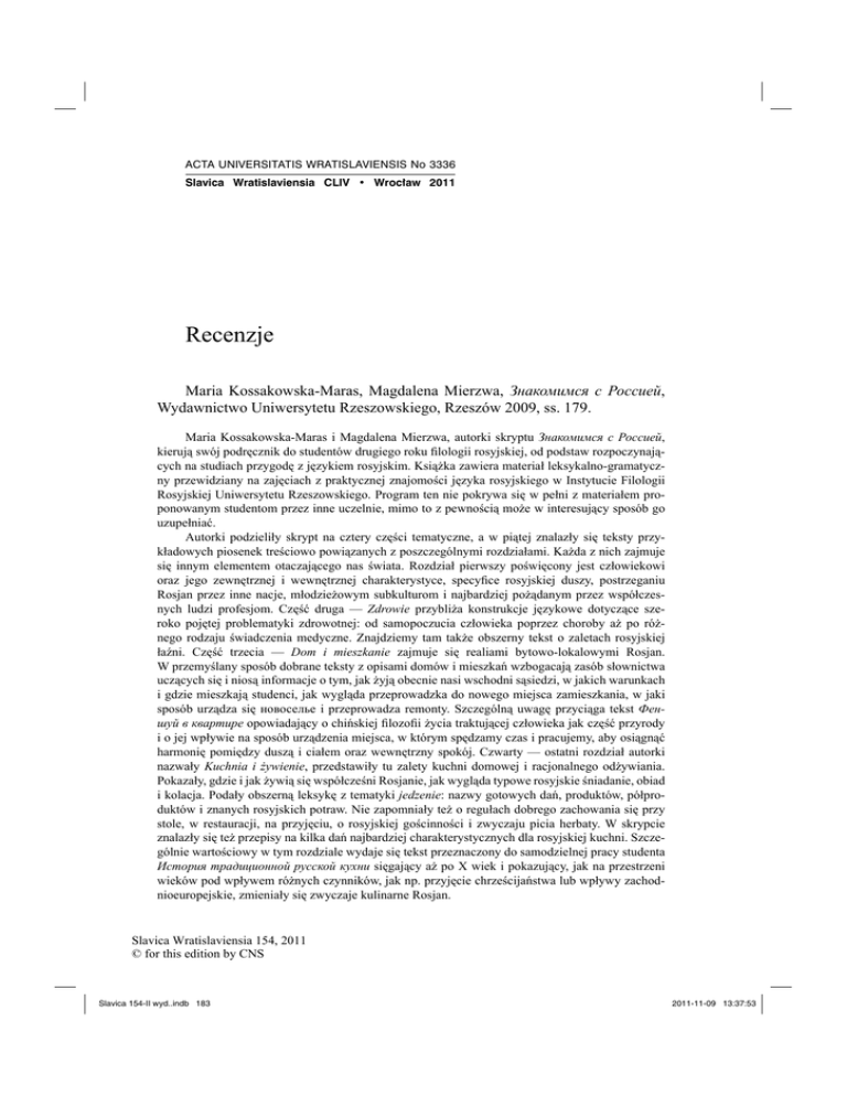ACTA UNIVERSITATIS WRATISLAVIENSIS No 3336 Slavica Wratislaviensia CLIV • Wroc³aw 2011 Recenzje Maria Kossakowska-Maras, Magdalena Mierzwa, Знакомимся с Россией, Wydawnictwo Uniwersytetu Rzeszowskiego, Rzeszów 2009, ss. 179. Maria Kossakowska-Maras i Magdalena Mierzwa, autorki skryptu Знакомимся с Россией, kierują swój podręcznik do studentów drugiego roku filologii rosyjskiej, od podstaw rozpoczynających na studiach przygodę z językiem rosyjskim. Książka zawiera materiał leksykalno-gramatyczny przewidziany na zajęciach z praktycznej znajomości języka rosyjskiego w Instytucie Filologii Rosyjskiej Uniwersytetu Rzeszowskiego. Program ten nie pokrywa się w pełni z materiałem proponowanym studentom przez inne uczelnie, mimo to z pewnością może w interesujący sposób go uzupełniać. Autorki podzieliły skrypt na cztery części tematyczne, a w piątej znalazły się teksty przykładowych piosenek treściowo powiązanych z poszczególnymi rozdziałami. Każda z nich zajmuje się innym elementem otaczającego nas świata. Rozdział pierwszy poświęcony jest człowiekowi oraz jego zewnętrznej i wewnętrznej charakterystyce, specyfice rosyjskiej duszy, postrzeganiu Rosjan przez inne nacje, młodzieżowym subkulturom i najbardziej pożądanym przez współczesnych ludzi profesjom. Część druga — Zdrowie przybliża konstrukcje językowe dotyczące szeroko pojętej problematyki zdrowotnej: od samopoczucia człowieka poprzez choroby aż po różnego rodzaju świadczenia medyczne. Znajdziemy tam także obszerny tekst o zaletach rosyjskiej łaźni. Część trzecia — Dom i mieszkanie zajmuje się realiami bytowo-lokalowymi Rosjan. W przemyślany sposób dobrane teksty z opisami domów i mieszkań wzbogacają zasób słownictwa uczących się i niosą informacje o tym, jak żyją obecnie nasi wschodni sąsiedzi, w jakich warunkach i gdzie mieszkają studenci, jak wygląda przeprowadzka do nowego miejsca zamieszkania, w jaki sposób urządza się новоселье i przeprowadza remonty. Szczególną uwagę przyciąga tekst Феншуй в квартире opowiadający o chińskiej filozofii życia traktującej człowieka jak część przyrody i o jej wpływie na sposób urządzenia miejsca, w którym spędzamy czas i pracujemy, aby osiągnąć harmonię pomiędzy duszą i ciałem oraz wewnętrzny spokój. Czwarty — ostatni rozdział autorki nazwały Kuchnia i żywienie, przedstawiły tu zalety kuchni domowej i racjonalnego odżywiania. Pokazały, gdzie i jak żywią się współcześni Rosjanie, jak wygląda typowe rosyjskie śniadanie, obiad i kolacja. Podały obszerną leksykę z tematyki jedzenie: nazwy gotowych dań, produktów, półproduktów i znanych rosyjskich potraw. Nie zapomniały też o regułach dobrego zachowania się przy stole, w restauracji, na przyjęciu, o rosyjskiej gościnności i zwyczaju picia herbaty. W skrypcie znalazły się też przepisy na kilka dań najbardziej charakterystycznych dla rosyjskiej kuchni. Szczególnie wartościowy w tym rozdziale wydaje się tekst przeznaczony do samodzielnej pracy studenta История традиционной русской кухни sięgający aż po X wiek i pokazujący, jak na przestrzeni wieków pod wpływem różnych czynników, jak np. przyjęcie chrześcijaństwa lub wpływy zachodnioeuropejskie, zmieniały się zwyczaje kulinarne Rosjan. Slavica Wratislaviensia 154, 2011 © for this edition by CNS Slavica 154-II wyd..indb 183 2011-11-09 13:37:53 184 • Recenzje Przybliżając skrypt Marii Kossakowskiej-Maras i Magdaleny Mierzwy potencjalnym użytkownikom, warto poświęcić kilka słów konstrukcji opracowanych przez nie jednostek tematycznych. Każda z nich, chociaż ma jeden temat przewodni, to rozpatruje go na różnych płaszczyznach i pod wieloma kątami, rozszerzając tym samym jego zakres leksykalno-gramatyczny. Ma to oczywiście pozytywny wpływ na rozwój kompetencji komunikacyjnej i socjokulturowej studentów. Autorki przyjęły pewien schemat, podając najpierw podstawowy zakres leksykalny do danego tematu. Następnie pojawiają się ćwiczenia mające za zadanie zastosowanie go w dialogach, opisie, tłumaczeniu z języka polskiego na rosyjski i w dłuższych wypowiedziach pisemnych na proponowane przez nie tematy. W każdej jednostce korzystający z podręcznika znajdzie po kilkanaście tekstów powiązanych z tematem przewodnim, a po nich ćwiczenia sprawdzające ich zrozumienie i wspomagające przyswojenie użytych form oraz wybór tekstów do samodzielnej pracy studenta (тексты для самостоятельного чтения). Niepodważalnym atutem wybranych przez Marię Kossakowską-Maras i Magdalenę Mierzwę tekstów jest ich głębokie osadzenie w realiach rosyjskich, gdyż są one zaczerpnięte ze współczesnej prasy rosyjskiej, literatury i przede wszystkim z internetu. Ostatnią częścią skryptu jest zbiór rosyjskich piosenek treścią związanych z proponowaną tematyką. Znajdziemy tu między innymi piosenki: Улыбка, Всё могут короли, Антошка i kilka ballad Władimira Wysockiego. Podręcznik kończy lista polecanych przez autorki rosyjskich edukacyjnych stron internetowych. Знакомимся с Россией na pewno zasługuje na to, by znaleźć się w biblioteczce studenta rusycystyki, szkoda tylko, że autorki proponują w swojej książce taki skromny zestaw tematów. Danuta Pytel-Pandey Lesław Cirko, Akceptacja w komunikowaniu się. Między preskryptywizmem a permisywizmem, Oficyna Wyd. ATUT, Wrocławskie Wydawnictwo Oświatowe, Wrocław 2009, ss. 297. Od połowy ubiegłego wieku wśród językoznawców systematycznie rośnie zainteresowanie zagadnieniami związanymi z komunikacją językową w ujęciu teoretycznym i praktycznym. Akceptacja w komunikowaniu się jest jedną z wielu prac poświęconych tej tematyce. Na czym jednak polega jej wyjątkowość? Otóż, Lesław Cirko pr