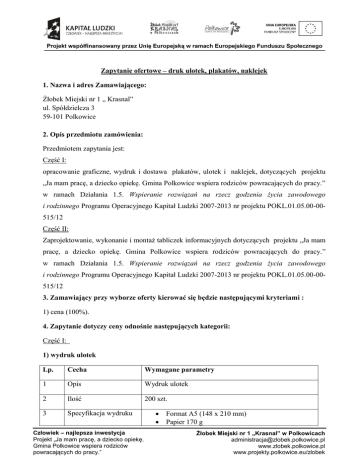 Zapytanie ofertowe – druk ulotek, plakatów, naklejek 1. Nazwa i adres Zamawiającego: Żłobek Miejski nr 1 „ Krasnal” ul. Spółdzielcza 3 59-101 Polkowice 2. Opis przedmiotu zamówienia: Przedmiotem zapytania jest: Część I: opracowanie graficzne, wydruk i dostawa plakatów, ulotek i naklejek, dotyczących projektu „Ja mam pracę, a dziecko opiekę. Gmina Polkowice wspiera rodziców powracających do pracy.” w ramach Działania 1.5. Wspieranie rozwiązań na rzecz godzenia życia zawodowego i rodzinnego Programu Operacyjnego Kapitał Ludzki 2007-2013 nr projektu POKL.01.05.00-00515/12 Część II: Zaprojektowanie, wykonanie i montaż tabliczek informacyjnych dotyczących projektu „Ja mam pracę, a dziecko opiekę. Gmina Polkowice wspiera rodziców powracających do pracy.” w ramach Działania 1.5. Wspieranie rozwiązań na rzecz godzenia życia zawodowego i rodzinnego Programu Operacyjnego Kapitał Ludzki 2007-2013 nr projektu POKL.01.05.00-00515/12 3. Zamawiający przy wyborze oferty kierować się będzie następującymi kryteriami : 1) cena (100%). 4. Zapytanie dotyczy ceny odnośnie następujących kategorii: Część I: 1) wydruk ulotek Lp. Cecha Wymagane parametry 1 Opis Wydruk ulotek 2 Ilość 200 szt. 3 Specyfikacja wydruku Człowiek – najlepsza inwestycja Projekt „Ja mam pracę, a dziecko opiekę. Gmina Polkowice wspiera rodziców powracających do pracy.” Format A5 (148 x 210 mm) Papier 170 g Żłobek Miejski nr 1 „Krasnal” w Polkowicach [email protected] www.zlobek.polkowice.pl www.projekty.polkowice.eu/zlobek Kreda połysk Druk pełen kolor, CMYK, dwustronny opracowanie graficzne ulotki, skład własny wykonawcy, zgodny z treścią przedstawioną przez Zleceniodawcę dostarczoną w momencie podpisywania umowy z Zleceniobiorcą projekt graficzny ulotki oddający charakter projektu. 4 Nadruk 5 Opakowanie Zgodny z wytycznymi i projektem graficznym dostarczonym przez Zamawiającego ( załączony projekt ulotki może ulec zmianie). Dostarczenie w pudełku, zabezpieczonym przed zniszczeniem 2) wydruk plakatów Lp. Cecha Wymagane parametry 1 Opis Wydruk plakatów 2 Ilość 50 szt. 3 Specyfikacja wydruku Format A2 (700 x 525 mm) Papier 170 g Kreda połysk Druk pełen kolor, CMYK , jednostronny Opracowanie graficzne plakatu·( projekt graficzny plakatu oddający charakter projektu – załączony projekt plakatu może ulec zmianie.) skład własny wykonawcy, zgodny z treścią przedstawioną przez Zleceniodawcę dostarczoną w momencie podpisywania umowy z Zleceniobiorcą, 4 Nadruk Zgodny z wytycznymi i projektem graficznym dostarczonym przez Zamawiającego. 5 Opakowanie Dostarczenie w pudełku, zabezpieczonym przed zniszczeniem Człowiek – najlepsza inwestycja Projekt „Ja mam pracę, a dziecko opiekę. Gmina Polkowice wspiera rodziców powracających do pracy.” Żłobek Miejski nr 1 „Krasnal” w Polkowicach [email protected] www.zlobek.polkowice.pl www.projekty.polkowice.eu/zlobek 3) wydruk naklejek Lp. Cecha Wymagane parametry 1 Opis Wydruk naklejek 2 Ilość 300 szt. 3 Specyfikacja wydruku rozmiar (40 x 60 mm), druk: pełen kolor jednostronnie, na papierze samoprzylepnym (w momencie dostawy: wycięte z arkusza- pojedyncze naklejki), opracowanie graficzne naklejki, 4 Nadruk Skład własny wykonawcy, zgodny z treścią przedstawioną przez zleceniodawcę dostarczoną w momencie podpisywania umowy z zleceniobiorcą. 5 Opakowanie Dostarczenie w pudełku, zabezpieczonym przed zniszczeniem Część II : tabliczka informacyjna Lp. Cecha Wymagane parametry 1 Opis Zaprojektowanie, wykonanie i montaż tabliczek informacyjnych jednostronnych 2 Ilość 4 szt. 3 Specyfikacja 4 Opakowanie Człowiek – najlepsza inwestycja Projekt „Ja mam pracę, a dziecko opiekę. Gmina Polkowice wspiera rodziców powracających do pracy.” 3 szt.- wymiary ok. 20 x 15 cm – dokładna treść do uzgodnienia po zawarciu umowy 1 szt. 70 x 40 cm – wg załączonego wzoru napisy, znaki i logotypy umieszczone na tablicy powinny być wykonane w sposób trwały i czytelny. Wszystkie tablice wykonane z pleksi Dostarczenie w pudełku, zabezpieczonym przed zniszczeniem Żłobek Miejski nr 1 „Krasnal” w Polkowicach [email protected] www.zlobek.polkowice.pl www.projekty.polkowice.eu/zlobek 5. Warunki składania ofert: 1) Dopuszcza się możliwość składania ofert częściowych. 2) Termin składania ofert: do 23.09.2013r. do godziny 11:00 za pomocą: poczty elektronicznej na adres: [email protected] - temat należy wpisać zgodny z nazwą części, na którą składana jest oferta, faksu 76 746-32-81 lub wersję „papierową” z dopiskiem na kopercie zgodnym z częścią, na którą składana jest oferta na adres: Żłobek Miejski nr 1 „KRASNAL”, ul. Spółdzielcza 3, 59-101 Polkowice. 3) Oferta cenowa musi być podana w złotych polskich, w rozbiciu na: cenę netto, kwotę podatku VAT - za całość poszczególnych części na załączonych formularzach ofertowych – załącznik nr 1, załącznik nr 2. 6. Informacje dodatkowe: Pod numerem tel. 76 749 87 00 Wykonanie do dnia 27.09.2013 r. Człowiek – najlepsza inwestycja Projekt „Ja mam pracę, a dziecko opiekę. Gmina Polkowice wspiera rodziców powracających do pracy.” Żłobek Miejski nr 1 „Krasnal” w Polkowicach [email protected] www.zlobek.polkowice.pl www.projekty.polkowice.eu/zlobek