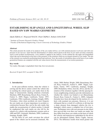 Problems of Forensic Sciences 2015, vol. 101, 39–55 Establishing slip anglE and longitudinal whEEl slip basEd on yaw marks gEomEtry Jakub Zębala1, Wojciech Wach1, Piotr ciępka1, Robert JancZur2 1 2 Institute of Forensic Research, Kraków, Poland Faculty of Mechanical Engineering, Cracow University of Technology, Kraków, Poland abstract This article presents the results of an analysis of the yaw marks left by a car with nominal pressure in all tyres and with zero pressure in one rear tyre. apart from the determination of vehicle critical speed on the basis of yaw mark curvature commonly used in road accident reconstruction, a new method is applied in the analysis. in this method the slip angle and longitudinal wheel slip can be determined on the basis of the geometry of the striations which are an integral element of yaw marks. The aim of the research was reached by performing bench and road tests. next, the results of calculations done on the basis of yaw marks geometrical features are compared with the real values known from the measurements of car motion parameters. key words Yaw marks; Slip angle; longitudinal wheel slip; Zero tyre pressure. Received 10 April 2015; accepted 31 May 2015 1. introduction in the post-collision motion, when the vehicle is yawing and the driver cannot control the vehicle due to reaching the critical speed, yaw marks form in the shape of characteristic slanting striations (amirault, Maclnnis, 2009; beauchamp, hessel, rose, Fenton r., Fenton S., 2009; hague, lambourn, Turner, 1997; lambourn, 1986; lambourn, Jennings, knight, 2009). nowadays, when clean accidents are more frequent, the yaw marks are of great importance in accident reconstruction because they can be the only marks that enable the reconstruction of vehicle motion. it should be emphasised that such marks are also left by the wheels of a vehicle with mechatronic systems such as abS and ESp (amirault, Maclnnis, 2009; lambourn, Jennings, knight, 2009). On the basis of yaw mark curvature the critical speed of the vehicle can be assessed (amirault, Ma- clnnis, 2009; barlett, Wright, 2009; beauchamp, hessel, rose, Fenton r., Fenton S., 2009; hague, lambourn, Turner, 1997; lambourn, Jennings, knight, 2009; richardson, Orton, Josevski, 2012), and the orientation of the striations together with the spacing between neighbouring striations provide information on whether the vehicle was braked or not (beauchamp, hessel, rose, Fenton r., Fenton S., 2009). adequate formulas have been developed for the motion of a vehicle with nominal tyre pressure. however, it is not infrequent that as a result of a collision or driving into a sharp element from damaged vehicles the tyre is damaged, which causes a complete loss of tyre pressure. Preliminary tests with zero pressure in one wheel have proved that even then yaw marks are made, but they differ from those yaw marks on the basis of which the velocity and manoeuvres undertaken by the driver can be determined (Zębala, Wach, ciępka, Janczur, 2013). The difference results from much greater side 40 J. Zębala, W. Wach, P. Ciępka, R. Janczur deformation and the tyre with reduced pressure sliding across the rim due to lateral forces acting during the vehicle motion. Despite many studies and research works on the analysis of yaw marks there is no information whether, on the basis of the analysis of the marks made by a tyre with zero pressure, it is possible to determine the critical speed of the car and decide if the car was braked. The solution to the problem was possible only by performing tests with a vehicle in which one wheel had zero pressure. Such tests were performed within the research project of the institute of Forensic research. (Zębala, Wach, ciępka, 2011). They covered an analysis of yaw marks left by a car with nominal pressure in all wheels and zero pressure in one rear wheel. 2. yaw marks in road accident reconstruction in accident reconstruction the so-called the critical speed formula is commonly used to determine the velocity of a car at the beginning of yaw marks deposited on the road surface (hague, lambourn, Turner, 1997): v μ g R, (1) where: µ – coefficient of friction between tyres and the road; g – gravity acceleration; R – radius of a circular course. This dependence results from the condition of a steady-state circular test, at friction limit, in which the mark’s average radius is taken as being equal to the radius of the circle. Slanting striations are a distinguishing feature of yaw marks, whose orientation in reference to the vehicle motion direction makes it possible to determine whether in yawing the vehicle was accelerated or braked. On the basis of the analysis of the striations’ geometry the slip angle and longitudinal slip of the wheel leaving the yaw mark can be determined after the dependencies (beauchamp, hessel, rose, Fenton r., Fenton S., 2009): SD sin θ α arcsin (2) θ, TD S tanα 100% , tan (θ α) (3) where: (Figure 1): α – slip angle; θ – striation angle; SD – spacing distance between one striation and adjacent striation, measured along tyre mark direction; TD – spacing distance between one striation and adjacent striation, defined parallel to side area of the wheel. Fig. 1. bird’s eye view of a tyre leaving a striated yaw mark (beauchamp, hessel, rose, Fenton r., Fenton S., 2009). additional notation: ψ – angle between wheel lateral surface and striations orientation. These dependencies have been introduced on the assumption that the striations formed as a result of the friction of the tyre tread shoulder, a stiff tyre model and neglecting the variable value of tread elements and variable spacing between these elements on the tyre shoulder. angle θ and spacing SD can be defined by a direct measurement of yaw marks striations geometry, while spacing TD can be measured on the tyre. after the wheel slip angle has been calculated, the wheel angular position during the deposition of the mark c