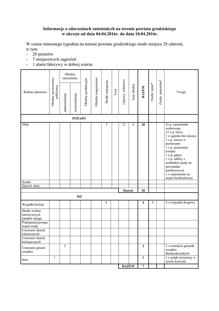 Informacje o zdarzeniach zaistniałych na terenie powiatu grodziskiego w okresie od dnia 04.04.2016r. do dnia 10.04.2016r. RAZEM 6 20 Osoby śmiertelne* Inne obiekty 12 Osoby ranne* Uprawy, rolnictwo Lasy Środki transportu Obiekty magazynowe Obiekty produkcyjne wielorodzinne Obiekty mieszkalne jednorodzinne Rodzaj zdarzenia Obiekty użyteczności publicznej W czasie minionego tygodnia na terenie powiatu grodziskiego miało miejsce 28 zdarzeń, w tym: - 20 pożarów - 7 miejscowych zagrożeń - 1 alarm fałszywy w dobrej wierze Uwagi POŻARY Mały 2 2x p. samochodu osobowego 12 x p. trawy 1 x ognisko bez dozoru 1 x p. śmieci w pustostanie 1 x p. pustostanu (szopa) 1 x p. gałęzi 1 x p. tablicy z rozkładem jazdy na przystanku autobusowym 1 x zadymienie na myjni bezdotykowej Średni Duży/b. duży Razem 20 MZ 4 Wypadki/kolizje 4 4 4 x wypadek drogowy Skutki wichur, intensywnych opadów śniegu Podtopienia/pompo wania wody Usuwanie skażeń chemicznych Usuwanie skażeń biologicznych 2 Usuwanie gniazd owadów Inne 2 1 1 RAZEM 7 2 x usunięcie gniazda owadów błonkoskrzydłych 1 x gołąb uwięziony w rynnie kościoła