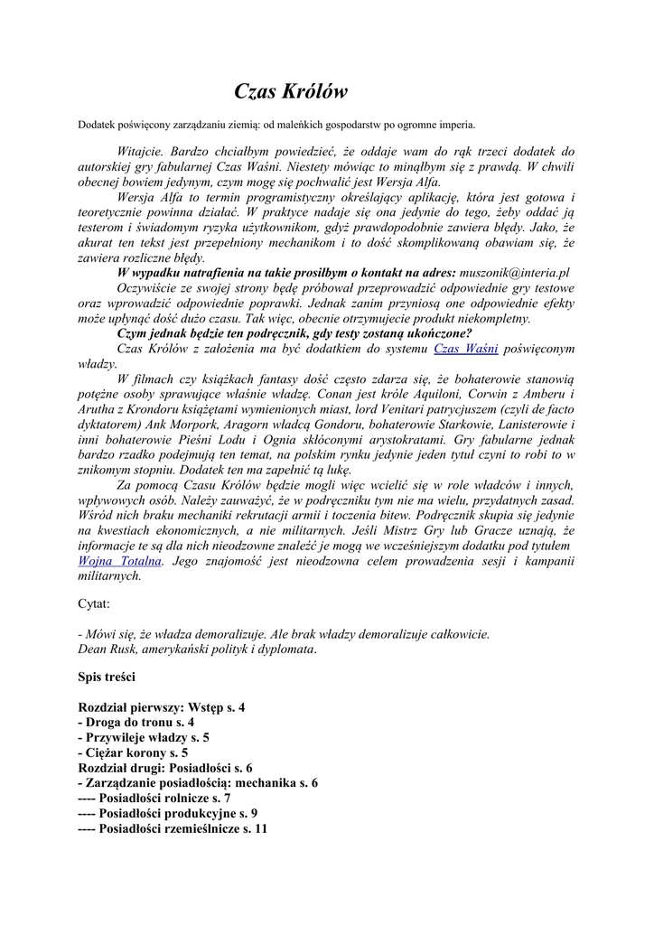 Czas Królów Dodatek poświęcony zarządzaniu ziemią: od maleńkich gospodarstw po ogromne imperia. Witajcie. Bardzo chciałbym powiedzieć, że oddaje wam do rąk trzeci dodatek do autorskiej gry fabularnej Czas Waśni. Niestety mówiąc to minąłbym się z prawdą. W chwili obecnej bowiem jedynym, czym mogę się pochwalić jest Wersja Alfa. Wersja Alfa to termin programistyczny określający aplikację, która jest gotowa i teoretycznie powinna działać. W praktyce nadaje się ona jedynie do tego, żeby oddać ją testerom i świadomym ryzyka użytkownikom, gdyż prawdopodobnie zawiera błędy. Jako, że akurat ten tekst jest przepełniony mechanikom i to dość skomplikowaną obawiam się, że zawiera rozliczne błędy. W wypadku natrafienia na takie prosiłbym o kontakt na adres: [email protected] Oczywiście ze swojej strony będę próbował przeprowadzić odpowiednie gry testowe oraz wprowadzić odpowiednie poprawki. Jednak zanim przyniosą one odpowiednie efekty może upłynąć dość dużo czasu. Tak więc, obecnie otrzymujecie produkt niekompletny. Czym jednak będzie ten podręcznik, gdy testy zostaną ukończone? Czas Królów z założenia ma być dodatkiem do systemu Czas Waśni poświęconym władzy. W filmach czy książkach fantasy dość często zdarza się, że bohaterowie stanowią potężne osoby sprawujące właśnie władzę. Conan jest króle Aquiloni, Corwin z Amberu i Arutha z Krondoru książętami wymienionych miast, lord Venitari patrycjuszem (czyli de facto dyktatorem) Ank Morpork, Aragorn władcą Gondoru, bohaterowie Starkowie, Lanisterowie i inni bohaterowie Pieśni Lodu i Ognia skłóconymi arystokratami. Gry fabularne jednak bardzo rzadko podejmują ten temat, na polskim rynku jedynie jeden tytuł czyni to robi to w znikomym stopniu. Dodatek ten ma zapełnić tą lukę. Za pomocą Czasu Królów będzie mogli więc wcielić się w role władców i innych, wpływowych osób. Należy zauważyć, że w podręczniku tym nie ma wielu, przydatnych zasad. Wśród nich braku mechaniki rekrutacji armii i toczenia bitew. Podręcznik skupia się jedynie na kwestiach ekonomicznych, a nie militarnych. Jeśli Mistrz Gry lub Gracze uznają, że informacje te są dla nich nieodzowne znaleźć je mogą we wcześniejszym dodatku pod tytułem Wojna Totalna. Jego znajomość jest nieodzowna celem prowadzenia sesji i kampanii militarnych. Cytat: - Mówi się, że władza demoralizuje. Ale brak władzy demoralizuje całkowicie. Dean Rusk, amerykański polityk i dyplomata. Spis treści Rozdział pierwszy: Wstęp s. 4 - Droga do tronu s. 4 - Przywileje władzy s. 5 - Ciężar korony s. 5 Rozdział drugi: Posiadłości s. 6 - Zarządzanie posiadłością: mechanika s. 6 ---- Posiadłości rolnicze s. 7 ---- Posiadłości produkcyjne s. 9 ---- Posiadłości rzemieślnicze s. 11 ---- Magazyny s. 13 ---- Posiadłości handlowe s. 14 ---- Kultura i rozrywka s. 16 ---- Posiadłości naukowe i edukacyjne s. 18 ---- Posiadłości militarne s. 20 ---- Posiadłości religijne s. 22 ---- Miejsca mocy s. 29 ---- Posiadłości magiczne s. 38 ---- Ochrona zdrowia s. 44 ---- Transport s. 45 ---- Administracja s. 46 ---- Użyteczność prywatna s. 47 ---- Posiadłości użyteczności publicznej s. 50 ---- Posiadłości nielegalne s. 52 ---- Posiadłości potworów i ciemnych mocy s. 55 ---- Ruchomości s. 57 ---- Inne posiadłości s. 59 - Rozmiar posiadłości s. 61 - Jakość posiadłości s. 61 - Zalety konstrukcji s. 61 - Wady konstrukcji s. 66 - Tworzenie posiadłości: Rys końcowy s. 69 - Zarządzanie posiadłością s. 70 ---- Dodatkowe akcje s. 71 ---- Mechanika posiadłości. Budowa tury s. 72 ---- Wydarzenia losowe s. 72 Rozdział trzeci: Prowincja s. 73 - Ziemie s. 75 ---- Rodzaj terenu s. 75 ---- Ukształtowanie terenu s. 77 ---- Szata roślinna s. 78 ---- Stopień zagospodarowania s. 79 ---- Cechy specjalne s. 80 - Ludność s. 86 ---- Rasa mieszkańców s. 87 ---- Liczba ludności. Jednostki populacji s. 94 ---- Wykorzystanie ludności s. 94 ---- Potrzeby ludności s. 95 ---- Biedni, Niezadowoleni i Przestępcy s. 95 ---- Przestępczość s. 97 ---- Niewolnicy s. 97 - Morale, Dyscyplina i Nastawienie s. 98 - Rodzaj sprawowanej władzy s. 104 - Budowa Prowincji s. 105 ---- Wady i Zalety prowincji s. 106 ---- Tworzenie prowincji: Rys końcowy s. 111 - Przyrost naturalny s. 113 - Zarządzanie prowincją. Dodatkowe akcje s. 113 - Mechanika prowincji: Budowa tury s. 116 Rozdział czwarty: Organizacje s. 117 - Majątki s. 117 - Specjaliści s. 117 ---- Stopień wyszkolenia specjalistów s. 118 ---- Lista specjalistów s. 118 - Szlaki handlowe s. 170 ---- Wytyczenie szlaku s. 178 ---- Korzyści z posiadania szlaku. Zapotrzebowanie na towary s. 178 ---- Stworzenie centrum produkcji i miejsc zapotrzebowania s. 179 - Budowanie Organizacji s. 182 ---- Zalety s. 182 ---- Wady s. 185 ---- Statut s. 188 ---- Tworzenie organizacji: Rys Końcowy s. 191 - Zarządzanie organizacją s. 192 - Mechanika organizacji. Budowa tury s. 193 Rozdział 5: Ustrój polityczny Laruzji s. 194 - Ludzie s. 194 - Elfy s. 200 - Krasnoludy s. 206 - Gnomy s. 207 - Niziołki s. 208 - Skrzydlaci s. 209 - Orkowie s. 210 - Gobliny s. 211 - Ogry i Trolle s. 212 - Smokowcy s. 213 - Zwierzoludzie i centaury s. 213 - Nieumarli i nieśmiertelni s. 214 Rozdział 6: Prowadzenie przygód i rola Mistrza Gry s. 214 - O korzyściach płynących z prowadzenia Potężnym Postaciom s. 215 - Jak prowadzić wpływowym postaciom? s. 217 - Styl 1: Dom, do którego można powrócić s. 217 - Styl 2: Wędrujący kupcy s. 217 - Styl 3: Wsi spokojna! Wsi wesoła! s. 218 - Styl 4: Król Aragorn I! s. 219 - Styl 5: eXplore, eXpand, eXploit and EXTERMINATE!!! s. 220 - Tury i Rzuty s. 221 - Podróże na duże dystanse s. 221 Rozdział 7: Wrogowie i sojusznicy s. 225 - Miejsca i instytucje s. 225 - Wojska i siły zbrojne s. 231 - Osoby s. 237 - Potwory s. 242 Appendix 1: Nowe zdolności s. 244 Appendix 2: Nowe zalety s. 274 Appendix 3: Now