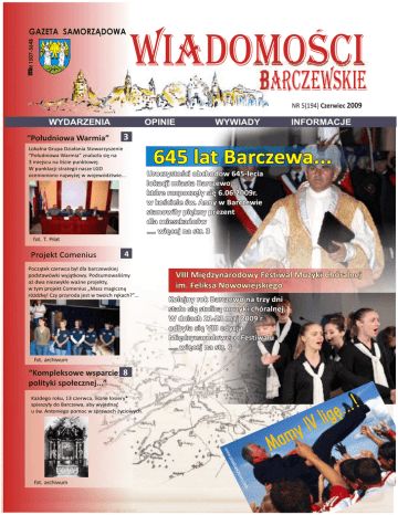NR 5(194) Czerwiec 2009 WYDARZENIA “Południowa Warmia” OPINIE WYWIADY INFORMACJE 3 Lokalna Grupa Działania Stowarzyszenie “Południowa Warmia” znalazła się na 3 miejscu na liście punktowej. W punktacji strategii nasze LGD ocenioniono najwyżej w województwie... fot. T. Piłat Projekt Comenius 4 Początek czerwca był dla barczewskiej podstawówki wyjątkowy. Podsumowaliśmy aż dwa niezwykle ważne projekty, w tym projekt Comenius „Masz magiczną różdżkę! Czy przyroda jest w twoich rękach?”... fot. archiwum “Kompleksowe wsparcie 8 polityki społecznej...” Każdego roku, 13 czerwca, liczne łosiery* spieszyły do Barczewa, aby wyjednać u św. Antoniego pomoc w sprawach życiowych. ww w cze bar isa w.p om o.c fot. archiwum ! . . . ę g i l IV y m a M Informacje Kto pamięta... Barczewo w obiektywie Dziś prezentujemy Czytelnikom dwie fotografie, przedstawiające ten sam budynek znajdujący się przy ul. Wojska Polskiego nr 7. Obiekt wybudowany został w latach 1980-1982 dla potrzeb Gminnej Spółdzielni „Samopomoc Chłopska” w Barczewie. Po jego zbudowaniu mieściły się w nim biura Spółdzielni, a na parterze tzw. sklep metalowy. Wystarczy przyjrzeć się fotografiom, aby przekonać się, że za sprawą Wspólnoty Mieszkaniowej zapomniany przez lata budynek przestał straszyć swą szpetotą. Kiedy prawa rynku stały się nieubłagane i udział Spółdzielni na rzecz społeczności gminnej systematycznie zaczął maleć, w budynku zamieszkali nowi lokatorzy. Co więcej, fotografie także obrazują postęp motoryzacji w naszym mieście. W grudniowym numerze „Wiadomości Barczewskich” zamieściliśmy grupową fotografię, wykonaną w maju 1938 roku, w Olsztynie. Przedstawia ona uczestników kursu bibliotekarstwa. Na odpowiedź Czytelników nie musieliśmy długo czekać. Na adres Redakcji dotarła informacja, że szóstą osobą, licząc od prawej strony jest pani Jadwiga Gnatowska ze Skajbot, która wraz z innymi mieszkańcami naszej gminy uczestniczyła w kursie bibliotekarzy. W połowie kwietnia dotarły kolejne dwie informacje. Pierwsza pochodziła od zamieszkałych w Barczewie dalszych krewnych pani Jadwigi Gnatowskiej. Uzyskane wiadomości pozwoliły uzupełnić biografię pani Jadwigi. Okazało się, że po wybuchu wojny, w 1940 roku przebywała ona w Königsbergu. W r o k u 1 9 4 2 zamieszkiwała w Berlinie, pod koniec wojny przebywała w Skajbotach i Patrykach, a 22 stycznia 1945 roku została wywieziona za Ural na przymusowe roboty. Tam też zmarła. Druga informacja zawiera w części nazwiska polskich bibliotekarzy i organizatorów czytelnictwa, działających w okresie międzywojennym na terenie gminy Barczewo. Warto wspomnieć, że tamtym okresie polskie biblioteki znajdowały się w takich miejscowościach jak: Barczewo, Barczewko, Kaplityny, Bartołty Wielkie, Jedzbark, Leszno, Łapka, Ramsowo czy Skajboty. Z tych miejscowości wiele osób mogło uczestniczyć w kursie bibliotekarzy, jaki odbył się w maju 1938 roku w Olsztynie. Na fotografii mogą być uwiecznieni m.in.: Maria i Józef Krakor – prowadzili bibliotekę w Lesznie, Oskar Kruk w Barczewie, Jan Kuzina w Ramsowie, Maria Orłowska w Barczewie i Kaplitynach, Maksymilian Brzeszczyński w Barczewku, Józef Fox w Łapce, Maria Kensbock i Antoni Lorenckowski w Skajbotach. Zwracamy się do naszych Czytelników z prośbą o pomoc w powiązaniu tych nazwisk z osobami upamiętnionymi na fotografii oraz w ustaleniu w jakich okolicznościach zdjęcie zostało wykonane. Galeria jednego obrazu Beata Stochmal z Barczewa Tekst i fot. Wojciech Zenderowski zaproszenie Mieszkańcy Mokin WIADOMOSCI BARCZEWSKIE Współpraca: Redaktor naczelny: Mariola Łukowska Redaktor Wojciech Zenderowski e-mail: [email protected] e-mail: [email protected] Redaktor Anna Rok Skład DTP: Zbigniew Kozłowski Redaktor Jan Krakowiak Korekta: Joanna Truszkowska Tomasz Piłat, Monika Piętka, Lidia Zelman, Joanna Bonus, Małgorzata Jasiukewicz, Aleksander Jasiukiewicz, Małgorzata Rukszan, Agnieszka Chojnowska, Magdalena Łowkiel, Jarosław Bonus, Szymon Kurdynowski, Robert Ostaszewski, Włodzimierz Zdaniuk. Wydawca: Centrum Kultury i Promocji Gminy Adres: Barczewo, ul. Słowackiego 5 Tel. / fax 089 514-82-81, Druk: Drukarnia “Mazur-PRINT” Olsztyn ul. Żołnierska Redakcja nie ponosi odpowiedzialności za treść ogłoszeń i rekalm, nie zwraca tekstów nie zamówionych oraz zastrzega sobie prawo skracania i opracowywania tekstów. Redakcja informuje o możliwości zamieszczenia reklam. www.gazeta.barczewo.pl 2 GAZETA SAMORZĄDOWA 5(194) czerwiec 2009 Wydarzenia Dla uczczenia i upamiętnienia rocznicy... naszego miasta. W tym dniu zarówno kościół św. Anny jak i sala konferencyjna Urzędu Miejskiego w Barczewie były bardzo odświętnie ustrojone. Punktualnie o 16.45 przy dźwiękach odgrywanego na trąbce „Hymnu Warmii”, do kościoła zostały wprowadzone poczty sztandarowe: Urzędu Miejskiego, Zakładu Karnego w Barczewie, Ochotniczej Straży Pożarnej, Szkoły Podstawowej w Barczewie i naszego Ginmazjum, za którymi kroczyły władze miejskie. Po odprawieniu przez fot. A. Jasiukiewicz dyrektor CKiPG Mariola Łukowska. Materiały źródłowe zostały zebrane i opracowane przez historyka i miłośnika archeologii Roberta Klimka, natomiast graficznie wykonane przez Sylwię i Zbigniewa Kozłowskich. Nad powstaniem drugiej publikacji, tj. albumuprzewodnika „Barczewomiasto wielu kultur” pracował zespół redakcyjny w składzie : Mariola Łukowska, Joanna Truszkowska, Anna Rok, Wojciech Zenderowski i Zbigniew Kozłowski. Wszyscy uczestnicy tej niezwykłej uroczystości otrzymali także pamiątkowe egzemplarze obu wydawnictw, o których mogli porozmawiać konsumując wykwintne potrawy przygotowane na tę uroczystość przez panią Ewę Pietkiewicz. redakcja 645 lat Barczewa fot. Zb. Kozłowski Uroczystości obchodów 645-lecia lokacji miasta Barczewo, które rozpoczęły się 6.06.2009 r. w kościele św
