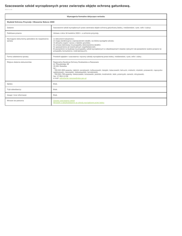 Szacowanie szkód wyrządzonych przez zwierzęta objęte ochroną gatunkową. 2013-11-18 Wymagania formalne dotyczące wniosku Wydział Ochrony Przyrody i Obszarów Natura 2000 Zadanie Szacowanie szkód wyrządzonych przez zwierzęta objęte ochroną gatunkową (bobry, niedźwiedzie, rysie, wilki i żubry). Podstawa prawna Ustawa z dnia 16 kwietnia 2004 r. o ochronie przyrody. Wymagane dokumenty potrzebne do rozpatrzenia sprawy 1) dokument tożsamości; 2) mapa ewidencyjna z zaznaczeniem działki, na której wystąpiła szkoda; 3) aktualny wypis i wyrys z rejestru gruntów; 4) umowa dzierżawy (w przypadku dzierżawienia działki); 5) upoważnienia od ewentualnych współwłaścicieli; 6) pozwolenie na budowę (w przypadku szkód wyrządzonych w obwałowaniach stawów rybnych) lub pozwolenie wodno-prawne (w przypadku korzystania z wód płynących). Forma załatwienia sprawy Protokół oględzin i szacowania i wyceny szkody wyrządzonej przez bobry, niedźwiedzie, rysie, wilki i żubry . Miejsce złożenia dokumentów Regionalna Dyrekcja Ochrony Środowiska w Rzeszowie Al. Piłsudskiego 38 35-001 Rzeszów tel.: - 783-921-900 powiaty: dębicki, jarosławski, kolbuszowski, leżajski, lubaczowski, łańcucki, mielecki, niżański, przeworski, ropczyckosędziszowski, rzeszowski, stalowowolski, tarnobrzeski, - 783-921-790 powiaty: bieszczadzki, brzozowski, jasielski, krośnieński, leski, przemyski, sanocki, strzyżowski, fax: 17 852-11-09 e-mail: [email protected] Opłata Brak. Tryb odwoławczy Brak. Uwagi / inne informacje Brak. Wnioski do pobrania Zasady szacowania szkód Wniosek o odszkodowanie za szkody wyrządzone przez bobry