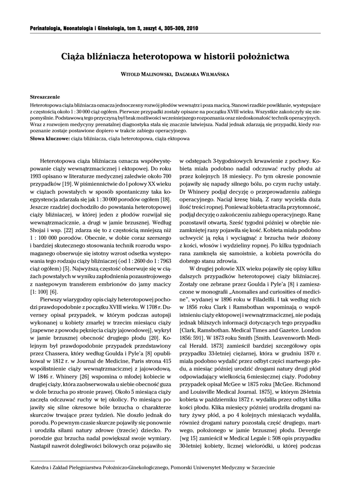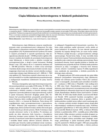 Perinatologia, Neonatologia i Ginekologia, tom 3, zeszyt 4, 305-309, 2010 Ciąża bliźniacza heterotopowa w historii położnictwa WITOLD MALINOWSKI, DAGMARA WILMAŃSKA Streszczenie Heterotopowa ciąża bliźniacza oznacza jednoczesny rozwój płodów wewnątrz i poza macicą. Stanowi rzadkie powikłanie, występujące z częstością około 1 : 30 000 ciąż ogółem. Pierwsze przypadki zostały opisane na początku XVIII wieku. Wszystkie zakończyły się niepomyślnie. Podstawową tego przyczyną był brak możliwości wcześniejszego rozpoznania oraz niedoskonałość technik operacyjnych. Wraz z rozwojem medycyny prenatalnej diagnostyka stała się znacznie łatwiejsza. Nadal jednak zdarzają się przypadki, kiedy rozpoznanie zostaje postawione dopiero w trakcie zabiegu operacyjnego. Słowa kluczowe: ciąża bliźniacza, ciąża heterotopowa, ciąża ektopowa Heterotopowa ciąża bliźniacza oznacza współwystępowanie ciąży wewnątrzmacicznej i ektopowej. Do roku 1993 opisano w literaturze medycznej zaledwie około 700 przypadków [19]. W piśmiennictwie do I połowy XX wieku w ciążach powstałych w sposób spontaniczny taka koegzystencja zdarzała się jak 1 : 30 000 porodów ogółem [18]. Jeszcze rzadziej dochodziło do powstania heterotopowej ciąży bliźniaczej, w której jeden z płodów rozwijał się wewnątrzmacicznie, a drugi w jamie brzusznej. Według Shojai i wsp. [22] zdarza się to z częstością mniejszą niż 1 : 100 000 porodów. Obecnie, w dobie coraz szerszego i bardziej skutecznego stosowania technik rozrodu wspomaganego obserwuje się istotny wzrost odsetka występowania tego rodzaju ciąży bliźniaczej (od 1 : 2600 do 1 : 7963 ciąż ogółem) [5]. Najwyższą częstość obserwuje się w ciążach powstałych w wyniku zapłodnienia pozaustrojowego z następowym transferem embrionów do jamy macicy [1: 100] [6]. Pierwszy wiarygodny opis ciąży heterotopowej pochodzi prawdopodobnie z początku XVIII wieku. W 1708 r. Duverney opisał przypadek, w którym podczas autopsji wykonanej u kobiety zmarłej w trzecim miesiącu ciąży [zapewne z powodu pęknięcia ciąży jajowodowej], wykrył w jamie brzusznej obecność drugiego płodu [20]. Kolejnym był prawdopodobnie przypadek przedstawiony przez Chassera, który według Goulda i Pyle’a [8] opublikował w 1812 r. w Journal de Medicine, Paris strona 415 współistnienie ciąży wewnątrzmacicznej z jajowodową. W 1846 r. Whinery [26] wspomina o młodej kobiecie w drugiej ciąży, która zaobserwowała u siebie obecność guza w dole brzucha po stronie prawej. Około 5 miesiąca ciąży zaczęła odczuwać ruchy w tej okolicy. Po miesiącu pojawiły się silne okresowe bóle brzucha o charakterze skurczów trwające przez tydzień. Nie doszło jednak do porodu. Po pewnym czasie skurcze pojawiły się ponownie i urodziła siłami natury zdrowe (trzecie) dziecko. Po porodzie guz brzucha nadal powiększał swoje wymiary. Nastąpił nawrót dolegliwości bólowych oraz pojawiło się w odstępach 3-tygodniowych krwawienie z pochwy. Kobieta miała podobno nadal odczuwać ruchy płodu aż przez kolejnych 18 miesięcy. Po tym okresie ponownie pojawiły się napady silnego bólu, po czym ruchy ustały. Dr Whinery podjął decyzję o przeprowadzeniu zabiegu operacyjnego. Naciął kresę białą. Z rany wyciekła duża ilość treści ropnej. Ponieważ kobieta straciła przytomność, podjął decyzję o zakończeniu zabiegu operacyjnego. Ranę pozostawił otwartą. Sześć tygodni później w obrębie niezamkniętej rany pojawiła się kość. Kobieta miała podobno uchwycić ją ręką i wyciągnąć z brzucha twór złożony z kości, włosów i wydzieliny ropnej. Po kilku tygodniach rana zamknęła się samoistnie, a kobieta powróciła do dobrego stanu zdrowia. W drugiej połowie XIX wieku pojawiły się opisy kilku dalszych przypadków heterotopowej ciąży bliźniaczej. Zostały one zebrane przez Goulda i Pyle’a [8] i zamieszczone w monografii „Anomalies and curiosities of medicine”, wydanej w 1896 roku w Filadelfii. I tak według nich w 1856 roku Clark i Ramsbothan wspominają o współistnieniu ciąży ektopowej i wewnątrzmacicznej, nie podają jednak bliższych informacji dotyczących tego przypadku [Clark, Ramsbothan. Medical Times and Gazetce. London 1856: 591]. W 1873 roku Smith [Smith. Leavenworth Medical Herald. 1873] zamieścił bardziej szczegółowy opis przypadku 33-letniej ciężarnej, która w grudniu 1870 r. miała podobno wydalić przez odbyt części martwego płodu, a miesiąc później urodzić drogami natury drugi płód odpowiadający wielkością 6-miesięcznej ciąży. Podobny przypadek opisał McGee w 1875 roku [McGee. Richmond and Louisville Medical Journal. 1875], w którym 28-letnia kobieta w październiku 1872 r. wydaliła przez odbyt kilka kości płodu. Klika miesięcy później urodziła drogami natury żywy płód, a po 4 kolejnych miesiącach wydaliła, również drogami natury pozostałą część drugiego, martwego, położonego w jamie brzusznej płodu. Devergie [wg 15] zamieścił w Medical Legale i: 508 opis przypadku 30-letniej kobiety, licznej wieloródki, u której podczas Katedra i Zakład Pielęgniarstwa Położniczo-Ginekologicznego, Pomorski Uniwersytet Medyczny w Szczecinie 306 W. Malinowski, D. Wilmańska sekcji zwłok (nie podano przyczyny zgonu) …znaleziono w prawym dole biodrowym męski płód ważący ponad 5 funtów, 8,5 cala długi, około 5-miesięczny, a w obrębie macicy również męski płód wyglądający na 3-miesięczny. Beach w 1871 roku w Journal of Gynaecological Society of Boston opisał przypadek kobiety, u której w 6. tygodniu ciąży doszło do poronienia ciąży wewnątrzmacicznej, a 4 lata później do wydalenia przez ściany brzucha płodu położonego pozamacicznie. Wspomniani wcześniej Gould i Pyle [8] w swojej monografii przytaczają opisany w 1893 roku przez Sangera [Sanger, Centralblatt für Gynäkologie, Leipzig 1893] prz