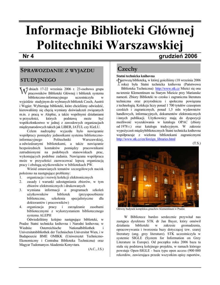Informacje Biblioteki Głównej Politechniki Warszawskiej Nr 4 SPRAWOZDANIE Z WYJAZDU STUDYJNEGO W dniach 17-22 września 2006 r. 23-osobowa grupa pracowników Biblioteki Głównej i bibliotek systemu biblioteczno-informacyjnego uczestniczyła w wyjeździe studyjnym do wybranych bibliotek Czech, Austrii i Węgier. Wybierając biblioteki, które chcieliśmy odwiedzić, kierowaliśmy się chęcią wymiany doświadczeń związanych m.in. z pracą w Alephie, a także wspólnymi działaniami w przyszłości, których podstawą może być współczłonkostwo w jednej z zawodowych organizacjach międzynarodowych takich jak LIBER, IATUL czy IGeLU. Celem nadrzędny wyjazdu było nawiązanie współpracy pomiędzy jednostkami systemu bibliotecznoinformacyjnego Politechniki Warszawskiej, a odwiedzanymi bibliotekami, a także nawiązanie bezpośrednich kontaktów pomiędzy pracownikami zatrudnionymi na podobnych stanowiskach prac, wykonujących podobne zadania. Nawiązana współpraca może w przyszłości zaowocować lepszą organizacją pracy i obsługą użytkowników w bibliotekach PW. Wśród omawianych tematów szczegółowych nacisk położono na następujące problemy: 1. organizacja i rozwój kolekcji elektronicznych 2. zasady i warunki udostępniania zbiorów, w tym zbiorów elektronicznych i drukowanych 3. wymiana informacji o programach szkoleń użytkowników bibliotek (przysposobienie biblioteczne, szkolenia specjalistyczne dla doktorantów i pracowników) 4. organizacja pracy i zarządzanie zasobami bibliotecznymi z wykorzystaniem bibliotecznego systemu ALEPH Odwiedziliśmy kolejno następujące biblioteki, w Pradze Statni technicka knihovna i Narodni knihovna; w Wiedniu: Osterreichische Nationalbibliothek i Universitatsbibliothek der Technischen Universitat Wien, i w Budapeszcie BME OMIKK (Uniwersytet TechnicznoEkonomiczny i Centralna Biblioteka Techniczna) oraz Magyar Tudomanyos Akademia Konyvtara. (A.C., J.S.) grudzień 2006 Czechy Statni technicka knihovna ierwszą biblioteką, w której gościliśmy (18 września 2006 roku) była Statni technicka knihovna (Państwowa Biblioteka Techniczna) http://www.stk.cz Mieści się ona na terenie Klementinum na Starym Mieście przy Marianske namesti. Zbiory Biblioteki to czeska i zagraniczna literatura techniczna oraz przyrodnicza i społeczna powiązana z technologią. Kolekcja liczy ponad 1 700 tytułów czasopism czeskich i zagranicznych, ponad 1,5 mln wydawnictw handlowych, informacyjnych, dokumentów elektronicznych i innych publikacji. Użytkownicy mają do dyspozycji możliwość wyszukiwania w katalogu OPAC (zbiory od 1978 r.) oraz katalogu tradycyjnym. W zakresie wypożyczeń międzybibliotecznych Statni technicka knihovna współpracuje z wieloma bibliotekami zagranicznymi http://www.stk.cz/en/foreign_libraries.html (T.S.) P Główny budynek kompleksu gmachów Klementinum w Pradze W Bibliotece bardzo serdecznie przywitał nas zastępca dyrektora STK dr Jan Bayer, który omówił działania biblioteki w zakresie gromadzenia, opracowywania i tworzenia bazy dotyczącej tzw. szarej literatury (ang. grey literature). STK uczestniczyła w systemie SIGLE (System for Information on Grey Literature in Europe). Od początku roku 2006 baza ta stała się podstawą kolejnego projektu, w ramach którego powstaje Open-SIGLE - baza typu open access (900 000 rekordów, zawierająca przede wszystkim opisy raportów, 2 > http://www.bg.pw.edu.pl/informacjeBGPW.html < sprawozdań, dysertacji i niepublikowanych materiałów konferencyjnych). Na podstawie zgromadzonych doświadczeń w bibliotece STK powstał projekt Narodowego Repozytorium Szarej Literatury (National Repository for Grey Literaure - NRGL). Będą go tworzyć repozytoria wyższych uczelni, Narodowe Archiwum Prac Doktorskich i Magisterskich, Akademia Nauk, pozostałości z bazy SIGLE znajdujące się w STK oraz prywatne i zakładowe ośrodki badawcze. Projekt ten nie jest jeszcze realizowany, ale jest przygotowany i oczekuje na odpowiednie fundusze. STK wraz z 40 innymi czeskimi bibliotekami tworzy Wirtualną Bibliotekę Politechniczną (Virtuální http://www.vpk.cz polytechnická knihovna-VPK). Wirtualnie połączone zbiory czasopism tych bibliotek są przeszukiwalne we wspólnym katalogu. Na ich podstawie prowadzone są usługi biblioteczne dla społeczności zainteresowanej techniką. Informacje Biblioteki Głównej Pracownicy STL bardzo dokładnie przygotowali się do naszej wizyty. Planując ją, zaproponowaliśmy obszar zagadnień związany z elektronicznym obliczem biblioteki (biblioteki cyfrowe, repozytoria, źródła elektroniczne) oraz praktyką szkoleń użytkowników w tym zakresie. Ciekawi byliśmy również doświadczeń związanych z komputerowym systemem Aleph. Interesującą nas problematykę przedstawiono nam na specjalnie przygotowanych prezentacjach. Nasze spotkanie odbywało się w Centrum Szkoleniowym STK. Powstało ono w 1999 roku. Jego podstawowym celem jest profesjonalne kształcenie bibliotekarzy STK, użytkowników biblioteki oraz pozostałych przedstawicieli środowiska bibliotekarskiego. Centrum zajmuje pomieszczenie (obliczone maksymalnie na 50 miejsc), w którym znajduje się 10 stanowisk komputerowych, duży ekran (tzw. SmartBoard) interaktywna tablica elektroniczna połączona z komputerem i projektorem komputerowym. Jedna z czytelń Statni Technicka Knihovna (aut. E.Mroczek) Najbardziej żywotnym problemem biblioteki w chwili obecnej jest stworzenie Narodowej Biblioteki Technicznej Czech (NTK). Na mocy podpisanego w 2001 roku porozumienia biblioteka STL wraz z ČVUT (Ceske vysoke uceni technicke v Praze) i Usredni knihovna VSCHT (Vysoka skola chemicko-technicka) połączyły swoje zbiory i będą stanowić jedną instytucję, dla której zaplanowano bardzo nowoczesny obiekt. Na stronie domowej http://www.stk.cz/ntk/projekt.html znajdują się informacje o projekcie jej nowego gmachu. Wyposażenie Centrum (odpowiednie fundusze) było możliwe dzięki udzia