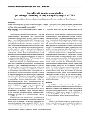 Perinatologia, Neonatologia i Ginekologia, tom 2, zeszyt 1, 48-49, 2009 Kurczliwość komór serca płodów po zabiegu laserowej okluzji naczyń łączących w TTTS KRZYSZTOF PREIS, KATARZYNA LESZCZYŃSKA, MAŁGORZATA ŚWIĄTKOWSKA-FREUND, ZOFIA PANKRAC Streszczenie Autorzy badali frakcję skracania lewej i prawej komory serca w zespole TTTS u biorcy i dawcy przed- i po zabiegu laserowej okluzji naczyń łączących w łożysku. Wyniki wskazują na prawidłowy trend zmiany kurczliwości serca dawcy i biorcy po zabiegu, choć zmiana ta była istotna tylko dla lewej komory biorcy. Słowa kluczowe: zespół przetoczenia krwi między płodami, TTTS, kurczliwość serca, frakcja skracania, laserowa okluzja naczyń, fetoskopia, SLPCV Zespół przetoczenia krwi między płodami (TTTS) jest najpoważniejszym powikłaniem ciąży wielopłodowej jednokosmówkowej. Rozwija się on w około 10% takich ciąż, co w populacji Polski dotyka ok. 150 ciężarnych rocznie. Jego przyczyną jest niezrównoważony przepływ krwi pomiędzy płodami poprzez połączenia naczyniowe w łożysku zwane anastomozami głębokimi oraz powierzchownymi. Taki brak równowagi hemodynamicznej powoduje, że jeden z płodów staje się „dawcą”, jest oliguryczny i hipowolemiczny, a drugi – biorca jest hiperwolemiczny i poliuryczny. Obydwa płody cechują zaburzenia funkcji układu sercowo-naczyniowego spowodowane odmiennym od prawidłowego obciążeniem; zaburzenia te mogą być wyrażone z różną siłą. Nieleczony TTTS prowadzi do ponad 80% śmiertelności płodów [1, 7, 8]. Pierwszym objawem tych odchyleń może być stwierdzana już w I trymestrze ciąży różnica w przezierności karkowej (NT) lub w spektrum przepływu krwi w przewodzie żylnym. Dalej może dojść do znaczącego zaburzenia perfuzji nerek i różnej od typowej produkcji moczu. W worku owodniowym oligowolemicznego dawcy prowadzi to do małowodzia. Z kolei hiperwolemiczny biorca cechuje się obecnością dużego pęcherza moczowego i towarzyszy mu wielowodzie. Ta dysproporcja między ilością płynu owodniowego w obu workach owodniowych jest podstawą rozpoznania zespołu przetoczenia krwi. Jeżeli największa kieszeń płynowa (MVP – maximal vertical pocket) w worku owodniowym dawcy wynosi poniżej 2 cm, a kieszeń w worku biorcy powyżej 8 cm, stwierdzamy tzw. I stopień zaawansowania TTTS w skali Rubena Quintero. Na tym etapie jeszcze nie stwierdza się istotnej oligurii dawcy ani zaburzeń w przepływach krwi w typowych diagnostycznie miejscach. Jednakże dogłębne badania echokardiograficzne potrafią wykryć dyskretne zmiany w pracy serca [3-5, 8, 9]. Wypróbowano wiele metod leczenia, spośród których jedyną metodą przyczynową jest rozdzielenie krążeń obu bliźniąt. Obecnie metodą z wyboru jest laserowa selektywna fotokoagulacja naczyń łączących (SLPCV) na powierzchni płyty łożyskowej wykonana do 26. tygodnia trwania ciąży. Metoda ta polega na wprowadzeniu płaszcza z fetoskopem do jamy owodniowej (zwykle do worka owodniowego biorcy) oraz identyfikacji naczyń łączących na powierzchni łożyska. Następnie przez dodatkowy tunel w płaszczu wprowadza się włókno światłowodowe i światłem laserowym o długości fali odpowiedniej dla podczerwieni dokonuje się fotokoagulacji wybranych naczyń krwionośnych. Celem zabiegu jest uzyskanie separacji krążeń obu płodów i tym samym zamiana ciąży jednokosmówkowej na hemodynamicznie dwukosmówkową [2, 4, 6, 7]. Skutecznie przeprowadzony zabieg SLPCV– laserowej fotokoagulacji naczyń łączących (wykonywany w Polsce od 2005 roku) nie jest gwarancją sukcesu i zależy od wielu jeszcze niepoznanych czynników. Nie do końca znana jest historia naturalna przebiegu ciąży po zabiegu laserowej okluzji naczyń łączących. Nie ma skutecznego czynnika prognostycznego, który potrafiłby wydzielić a priori grupę gorzej rokującą przeżyciem po tym zabiegu. Separacja krążeń obu płodów, mimo prowadzenia do sytuacji normalnej, wprowadza gwałtowne zmiany w obciążeniu serc płodów i zmiany w ich pracy. Nie wiadomo do końca dlaczego taka normalizacja krążeń, choć powinna poprawić stan płodu, prowadzi niekiedy do jego szybkiego zgonu? Celem pracy jest analiza funkcji serca w ciążach bliźniaczych po laserowej okluzji naczyń łączących w przebiegu zespołu TTTS. Materiał Spośród 66 pacjentek z ciążą wielopłodową powikłaną zespołem przetoczenia krwi między płodami hospitalizowanych w Klinice Położnictwa Katedry Perinatologii Gdańskiego Uniwersytetu Medycznego, u których wykonano zabieg laserowej okluzji naczyń łączących, wydzielono 64 przypadki ciąż bliźniaczych. Do analizy funkcji serca wzięto wyniki wszystkich płodów zbadanych po zabiegu. Metoda Wśród wielu zbieranych danych, na potrzeby tego opracowania skoncentrowano się na funkcji serca płodów ocenianej 1 dzień przed i 1 dzień po zabiegu laserowej Klinika Położnictwa, Katedra Perinatologii, Gdański Uniwersytet Medyczny Kurczliwość komór serca płodów po zabiegu laserowej okluzji naczyń łączących w TTTS okluzji naczyń łączących u biorcy i dawcy. Serce każdego badanego płodu uwidoczniono w przekroju poprzecznym i w prezentacji M-mode zapisano co najmniej 3 ewolucje serca. Znacznikami zaznaczono i zmierzono szerokość komory lewej i prawej w skurczu i rozkurczu. Z pomiarów wyliczano tzw. frakcję skurczową komory lewej (LVSF) i prawej (RVSF). Porównano średnie wartości frakcji skurczowej osobno u dawcy i biorcy oraz osobno dla komory lewej i prawej. Wyniki Uzyskane wyniki frakcji skracania dla komory lewej (LVSF) i prawej serca (RVSF) u dawcy i biorcy przedstawiono w tabelach. Tabela 1. Średnie wartości frakcji skracania dla lewej komory (LVSF) u dawcy i biorcy przed- i po zabiegu laserowej okluzji naczyń łączących Płód Biorca Dawca LVSF przed SLPCV (śr.) 39% 51% LVSF po SLPCV (śr.) 47% 46% Zmiana p 8 21% 9 11% 0,003 0,056 Tabela 2