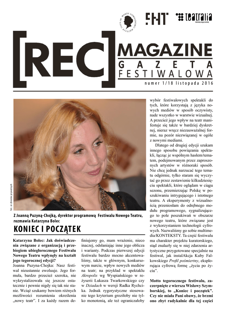 fot. ze zbiorów prywatnych numer 1/18 listopada 2016 Z Joanną Puzyną-Chojką, dyrektor programową Festiwalu Nowego Teatru, rozmawia Katarzyna Bolec KONIEC I POCZĄTEK Katarzyna Bolec: Jak doświadczenia związane z organizacją i przebiegiem ubiegłorocznego Festiwalu Nowego Teatru wpłynęły na kształt jego tegorocznej edycji? Joanna Puzyna-Chojka: Nasz festiwal nieustannie ewoluuje. Jego formuła, bardzo przecież szeroka, nie wykrystalizowała się jeszcze ostatecznie i pewnie nigdy się tak nie stanie. Wciąż szukamy bowiem różnych możliwości rozumienia określenia „nowy teatr”. I za każdy razem de- finiujemy go, mam wrażenie, nieco inaczej, odsłaniając inne jego oblicza i warianty. Podczas pierwszej edycji festiwalu bardzo mocno akcentowaliśmy, także w głównym, konkursowym nurcie, wpływ nowych mediów na teatr; na przykład w spektaklu Akropolis wg Wyspiańskiego w reżyserii Łukasza Twarkowskiego czy w Dziadach w wersji Radka Rychcika. Jednak rygorystyczne stosowanie tego kryterium groziłoby nie tylko monotonią, ale też ograniczałoby wybór festiwalowych spektakli do tych, które korzystają z języka nowych mediów w sposób oczywisty, nade wszystko w warstwie wizualnej. A przecież jego wpływ na teatr manifestuje się także w bardziej dyskretnej, nieraz wręcz niezauważalnej formie, na pozór niezwiązanej w ogóle z nowymi mediami. Dlatego od drugiej edycji szukam innego sposobu powiązania spektakli, łącząc je wspólnym hasłem/tematem, podejmowanym przez zaproszonych artystów w różnoraki sposób. Nie chcę jednak narzucać tego tematu odgórnie, tylko staram się wyczytać go przez zestawienie kilkudziesięciu spektakli, które oglądam w ciągu sezonu, przemierzając Polskę w poszukiwaniu intrygującego i istotnego teatru. A eksperymenty z wizualnością przeniosłam do odrębnego modułu programowego, sygnalizującego to pole poszukiwań w obszarze nowego teatru, które związane jest z wykorzystaniem technologii cyfrowych. Nazwaliśmy go sobie multimedia/KONTEKSTY. Ta część festiwalu ma charakter projektu kuratorskiego, stąd znalazły się w niej zdarzenia artystyczne przygotowane specjalnie na festiwal, jak instalAkcja Kuby Falkowskiego Profil pośmiertny, eksplorująca cyfrową formę „życia po życiu”. Motto tegorocznego festiwalu, zaczerpnięte z wiersza Wisławy Szymborskiej, to „Koniec i początek”. Czy nie miała Pani obawy, że brzmi ono zbyt radykalnie dla tej części 2 WYWIAD publiczności, która od teatru oczekuje przede wszystkim rozrywki? Nasz festiwal od początku nie był adresowany do tej części publiczności, która od teatru oczekuje tylko rozrywki. Mam wrażenie, że w Rzeszowie jest spora oferta teatru rozrywkowego. Filharmonia Podkarpacka regularnie gości u siebie komercyjne spektakle z aktorami-celebrytami w obsadzie. Również Teatr im. Siemaszkowej powrócił po rocznej przerwie do tradycji organizowania Karnawałowych Spotkań Teatralnych, które nastawione są właśnie na prezentację lżejszych, najczęściej komediowych, choć artystycznie szlachetnych spektakli. Nie byłoby sensu konkurować z tymi propozycjami. Poza tym ja po prostu nie mogłabym robić festiwalu teatru rozrywkowego, bo mnie on, mówiąc szczerze, mało obchodzi. Sama szukam w teatrze czegoś innego. Hasło tegorocznego festiwalu wzięło się z atmosfery, w której od dłuższego czasu żyjemy. Nie mam żadnych wątpliwości, że sezon 2015/2016 upłynął pod znakiem konstruowania scenariuszy rychłej katastrofy, przepowiadanej przez rozpad europejskiej wspólnoty i negowanie idei demokracji. Ten rodzaj apokaliptycznej gorączki prowokuje z kolei fantazje na temat przyszłości naszego świata, które najczęściej przyjmują kształt posthumanistycznych dystopii kreślonych na kanwie dzieł Michela Houellebecqa, Raya Bradbury’ego, Larsa von Triera, Stanleya Kubricka czy Mirosława Nahacza. W naszym zestawie konkursowych spektakli dominuje zdecydowanie temat końca, realizowany w różny, nieraz nieoczywisty, wręcz dyskretny sposób. Ten „koniec” spełnia się zarówno w wymiarze zbiorowym, w rozumieniu kresu starego porządku czy nawet świata (jak w wałbrzyskim spektaklu Być jak dr Strangelove), jak i w perspektywie indywidualnej, jako pożegnanie z pewnym etapem w swoim życiu i poszukiwanie na nowo własnej tożsamości (jak w kieleckim spektaklu Harper). Z powodu ograniczeń technicznych i finansowych nie udało się nam się niestety zaprosić ważnych spektakli, które realizują temat „nowego początku”. Szczególnie będzie mi brakować w festiwalowym zestawie Roberta Robura wg Nahacza w reżyserii Krzysztofa Garbaczewskiego z TR Warszawa, Fahrenheita 451 wg Bradbury’ego w reżyserii Marcina Libera czy Mapy i terytorium wg Houellebecqa w reżyserii Eweliny Marciniak z Teatru Wybrzeże. Nawet jeśli nie wszystkie z tych spektakli są artystycznie doskonałe, to są ważnym głosem w dyskusji na temat kształtu współczesnego świata. Dlaczego uważa Pani, że Rzeszów, miasto z jednym teatrem dramatycznym, to właściwie miejsce do zorganizowania festiwalu promującego nowy teatr? Właśnie dlatego, że Rzeszów ma tylko jeden teatr dramatyczny, który musi zaspokajać zróżnicowane potrzeby swojej widowni, warto robić w nim taki festiwal. Stwarza on bowiem okazję do tego, by poszerzyć paletę możliwości współczesnej sztuki. Można nawet dzięki takiemu festiwalowi inaczej te potrzeby widowni „formatować”. Wierzę, że w Rzeszowie jest wielu wrażliwych ludzi, którzy chcą przeglądać się w teatrze ze wszystkimi swoim niepokojami, lękami, czasem może nadziejami. W tym roku niektóre spektakle zostaną odegrane w przestrzeniach pozateatralnych – Klubie Akademickim IQ (Wyższa Szkoła Informatyki i Zarządzania) oraz w Wojewódzkim Domu Kultury. Skąd taki pomysł? Pomysł ten jest podyktowany z jednej strony pragnieniem poszukiwania dla teatru młodego widza, którego być mo